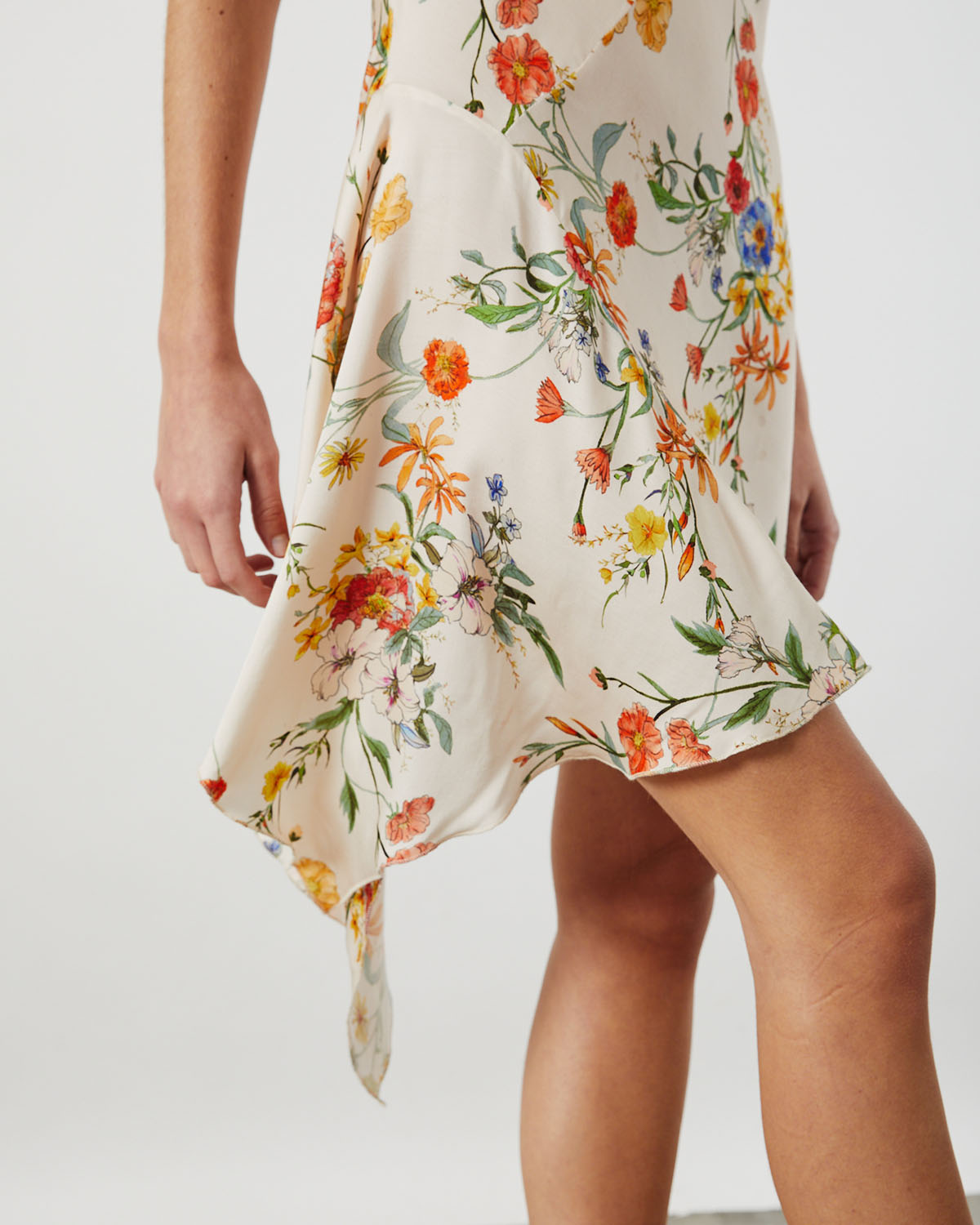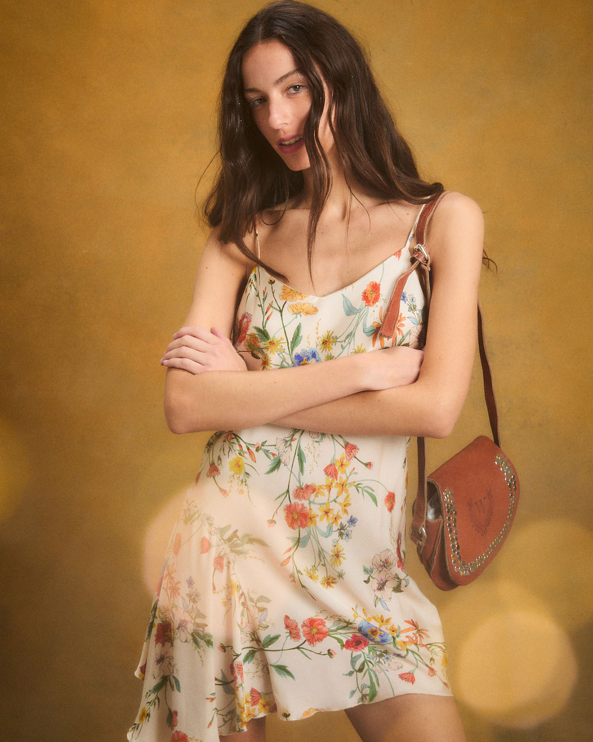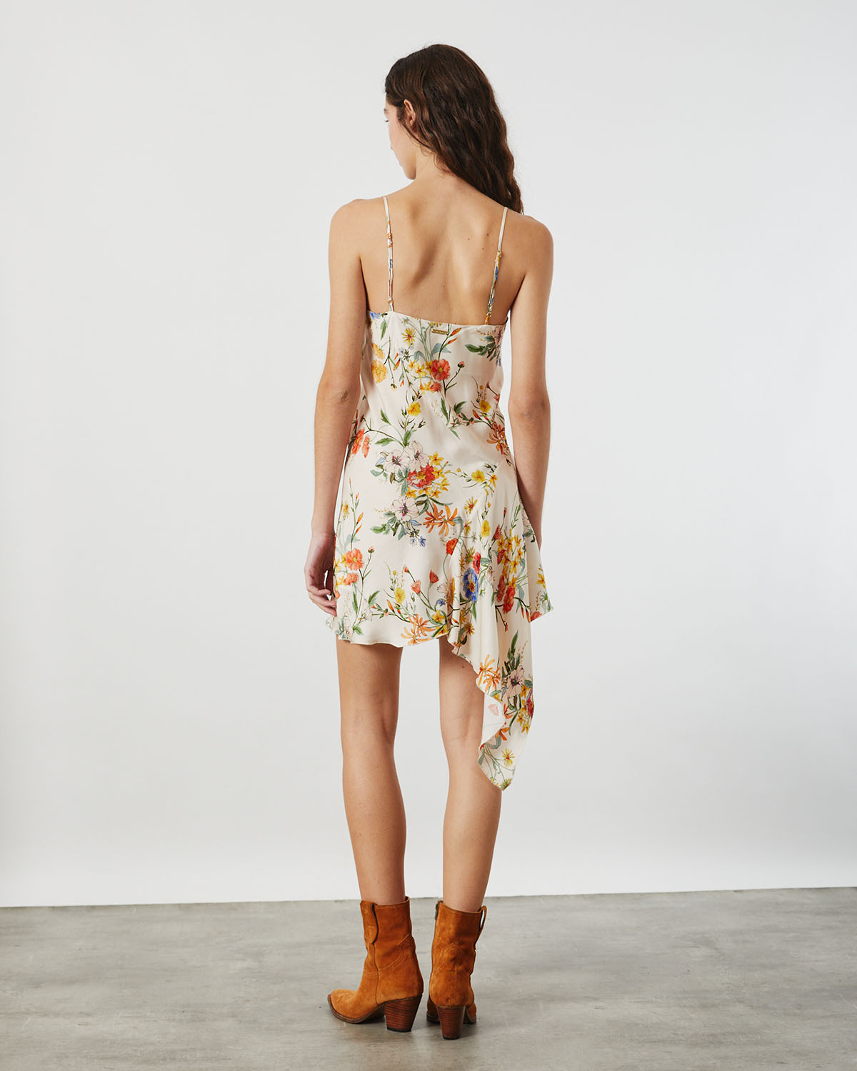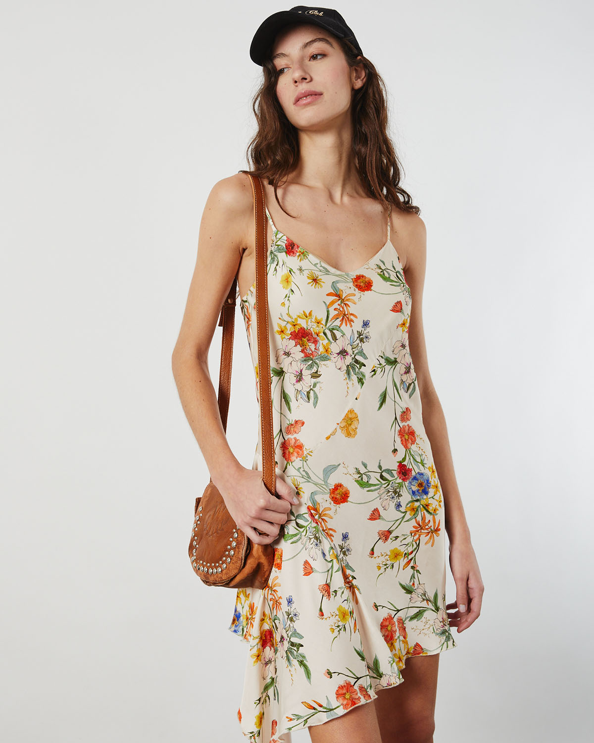 VESTIDO CORTO CONFECCIONADO EN VISCOSA ESTAMPADA CON ESCOTE EN V, BRETELES REGULABLES Y QUILLA EN UNO DE SUS LATERALES.