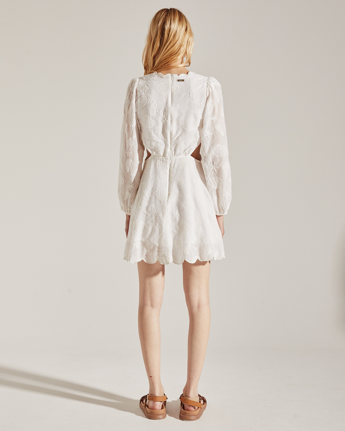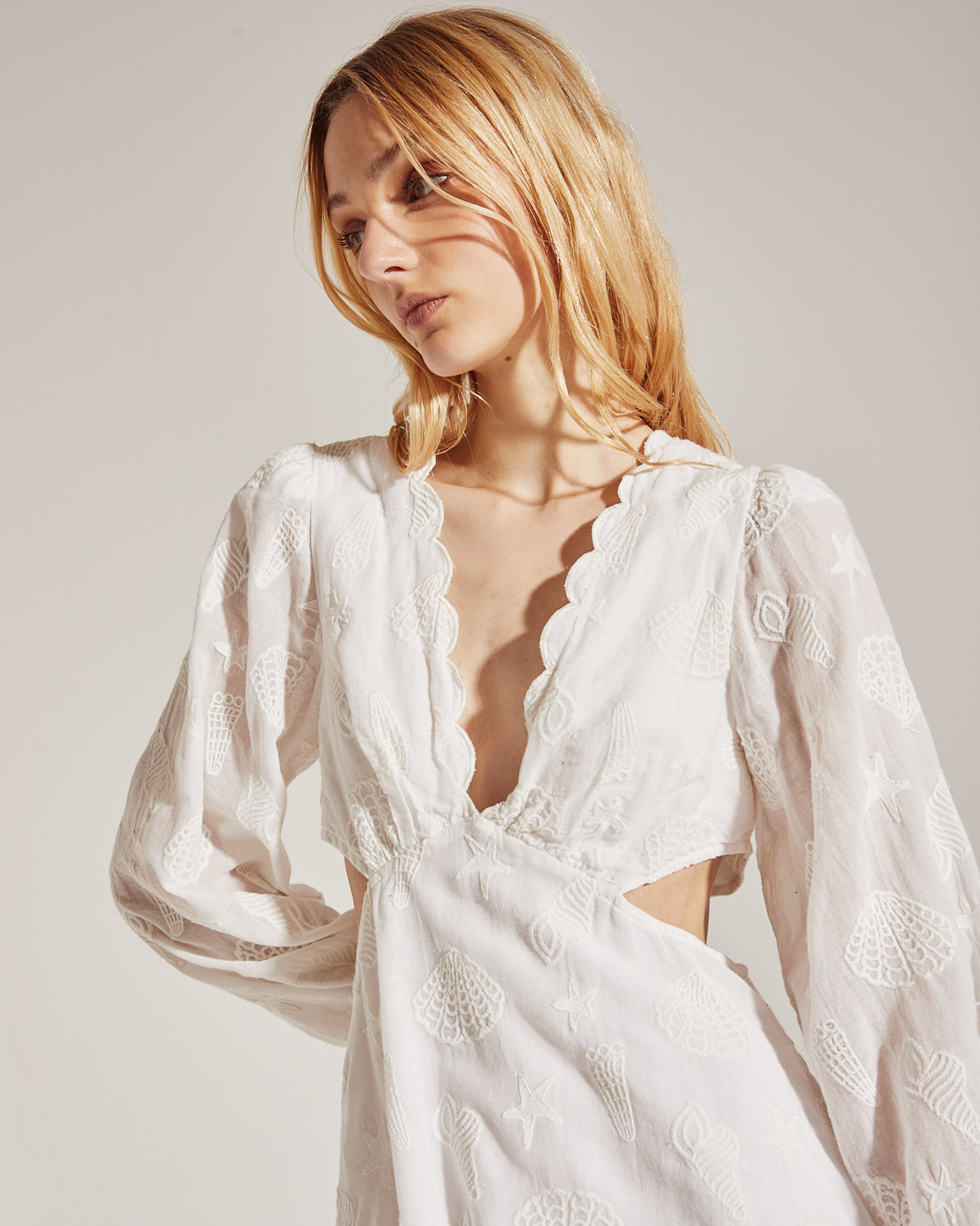 VESTIDO CORTO CON ESCOTE EN V Y RECORTES LATERALES. MANGAS CON VOLUMEN. CONFECCIONADO EN BRODERIE DE ALGODON 100%