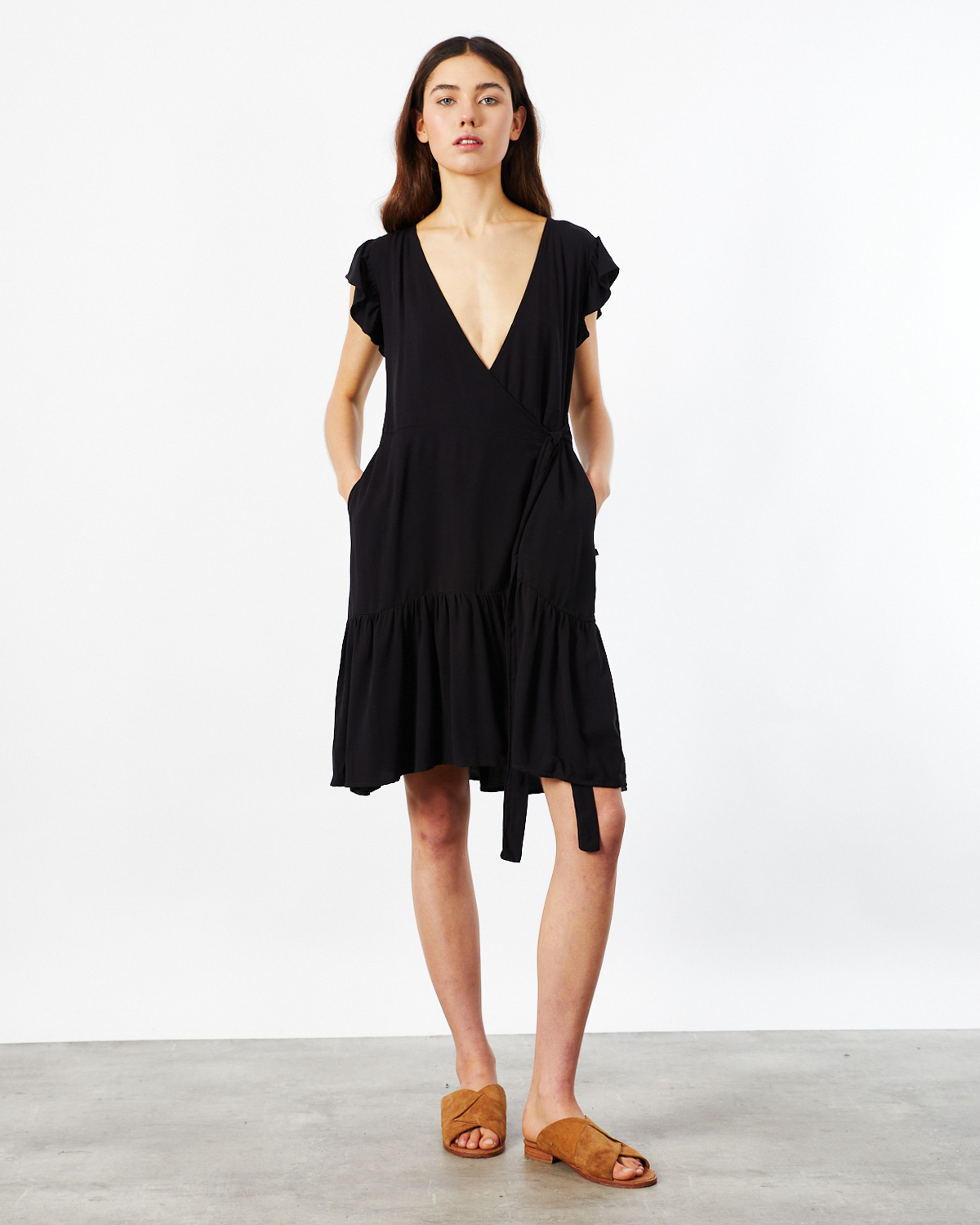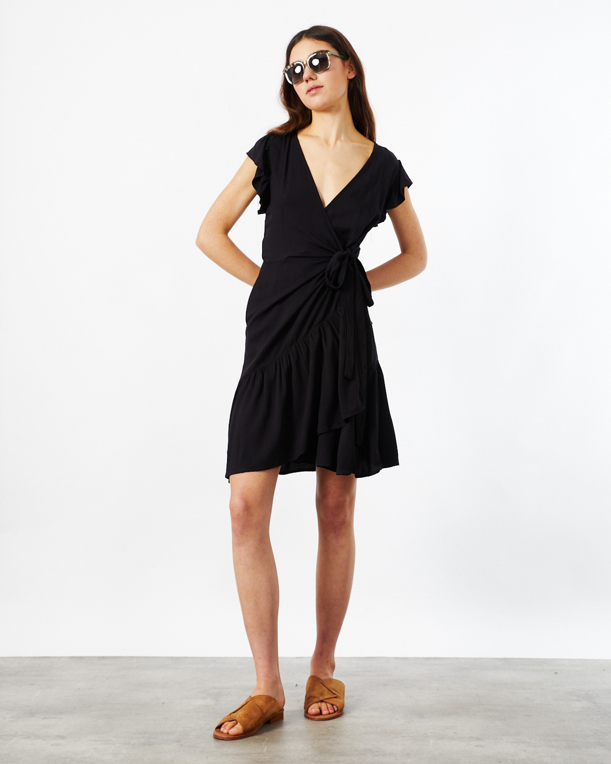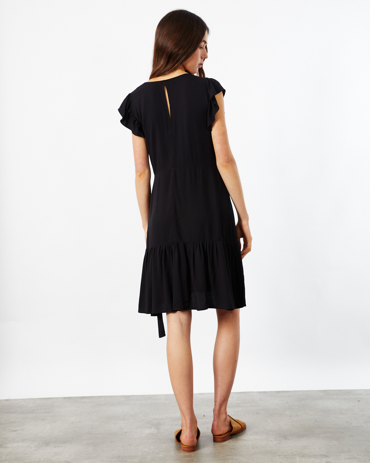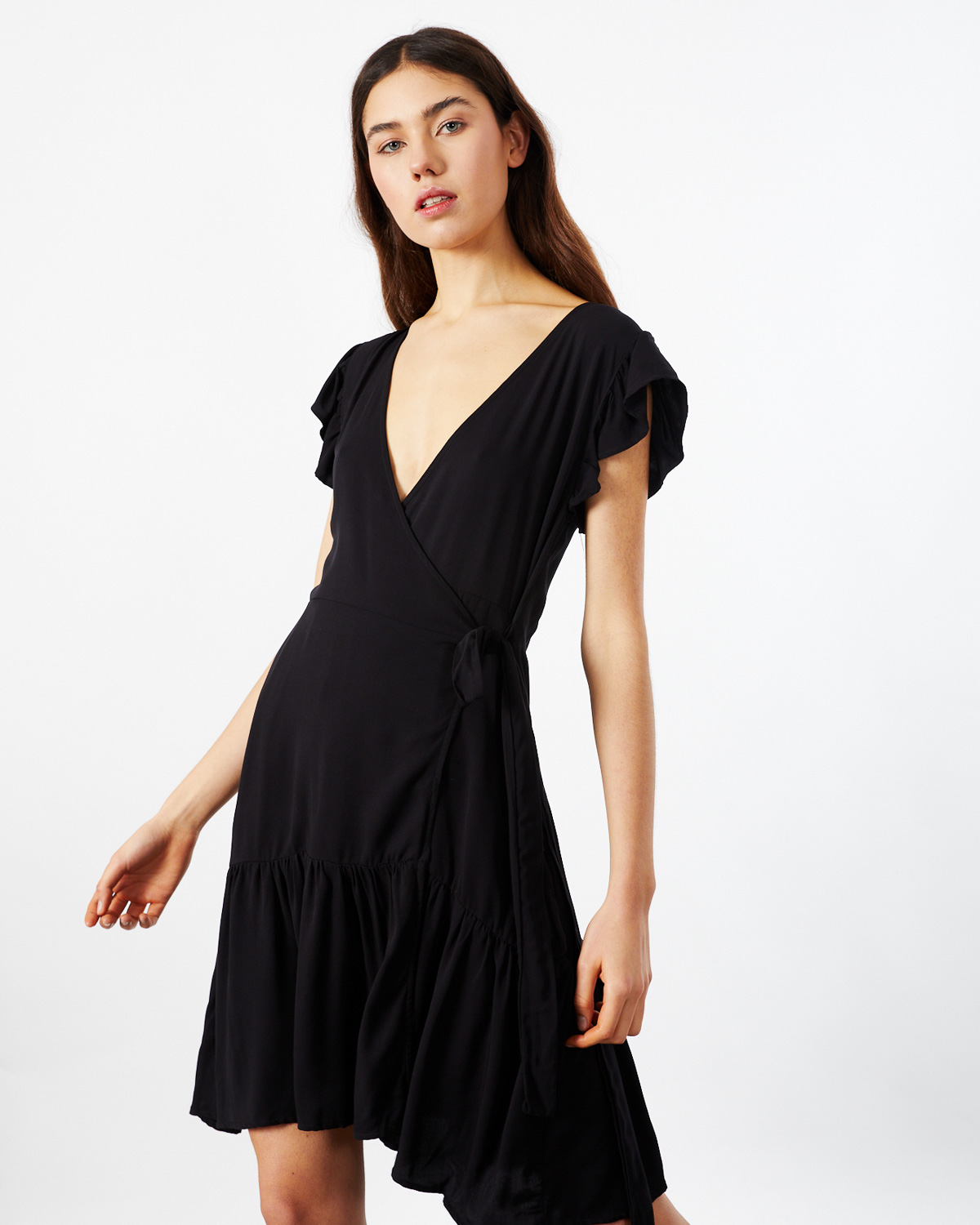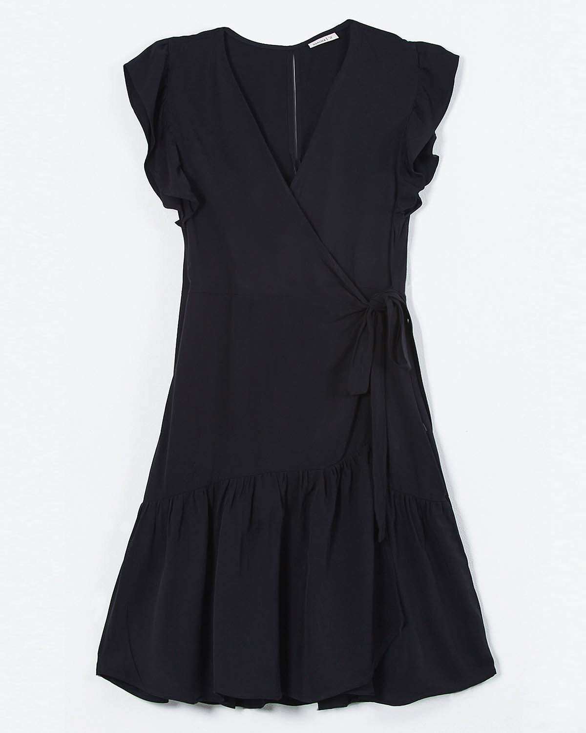 VESTIDO WRAP CORTO, CONFECCIONADO EN VISCOSA. CON VOLADO EN RUEDO Y MANGAS.