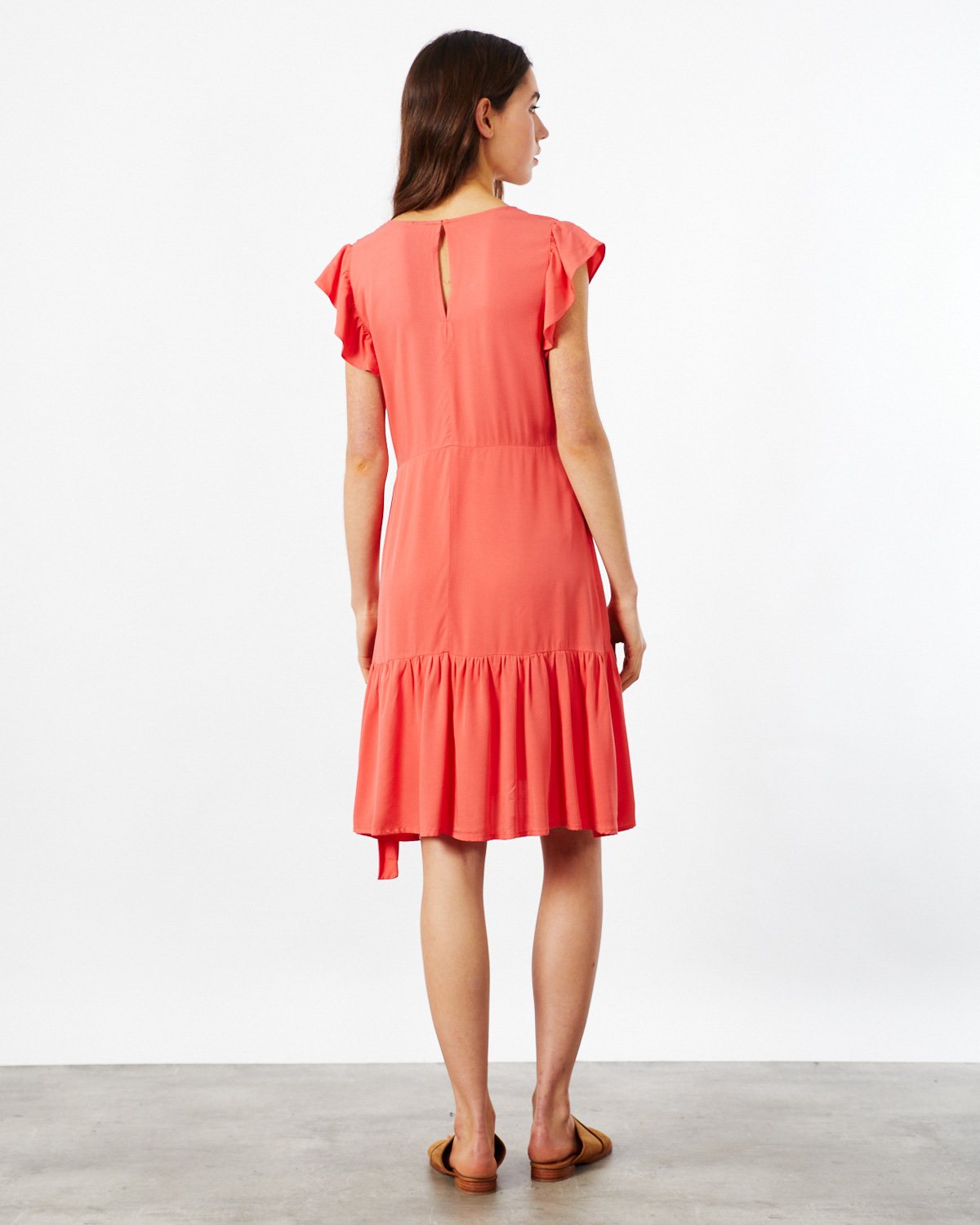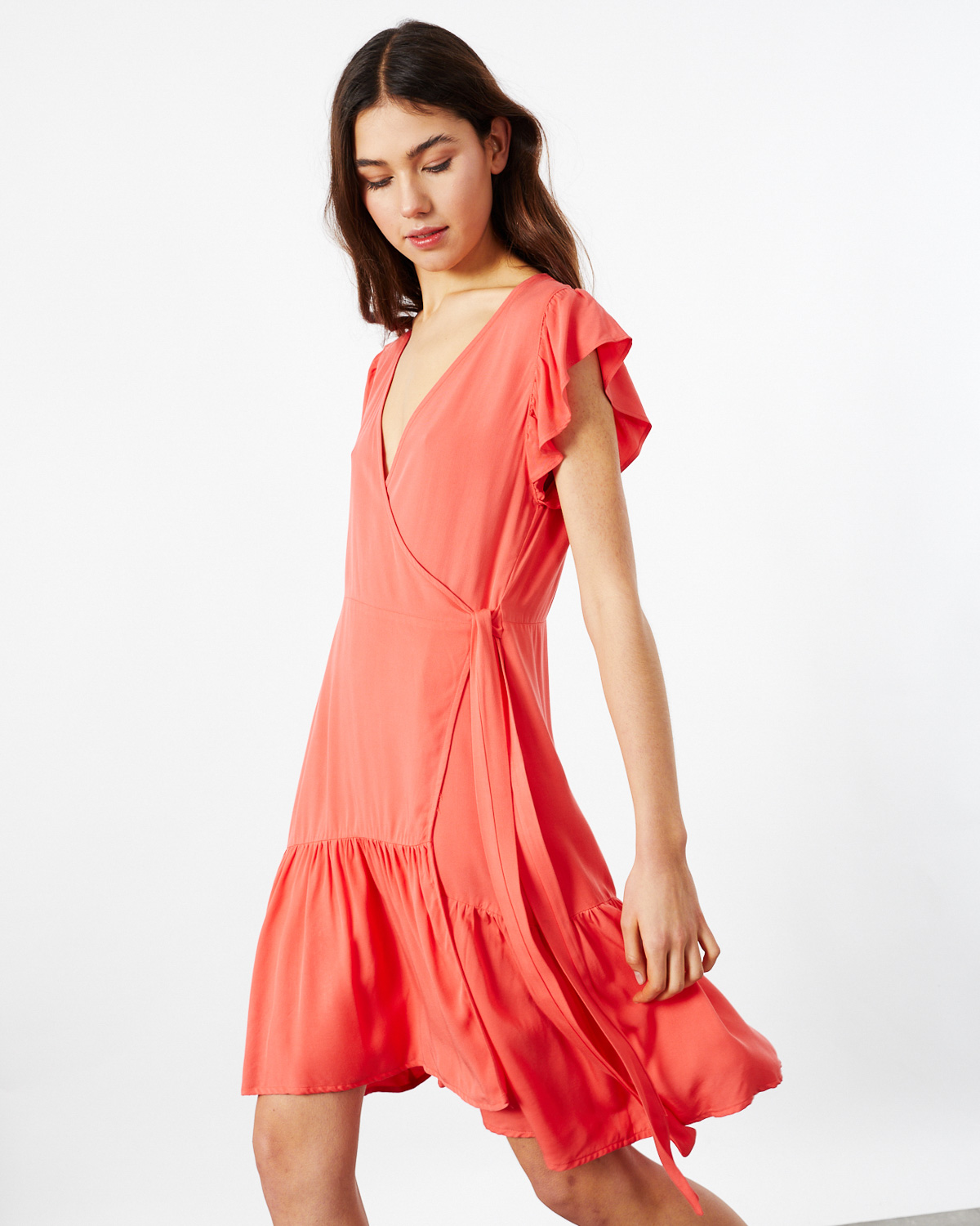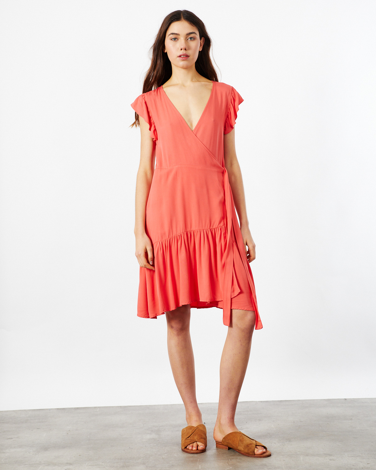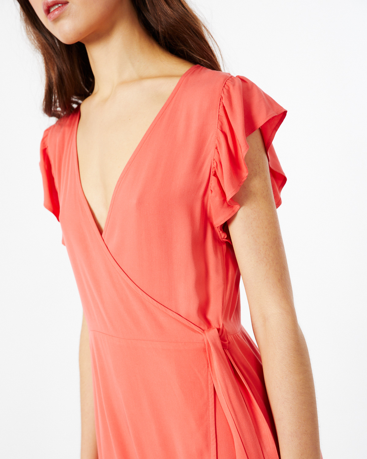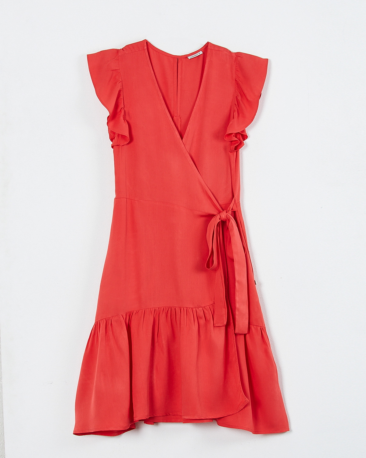 VESTIDO WRAP CORTO, CONFECCIONADO EN VISCOSA. CON VOLADO EN RUEDO Y MANGAS.
