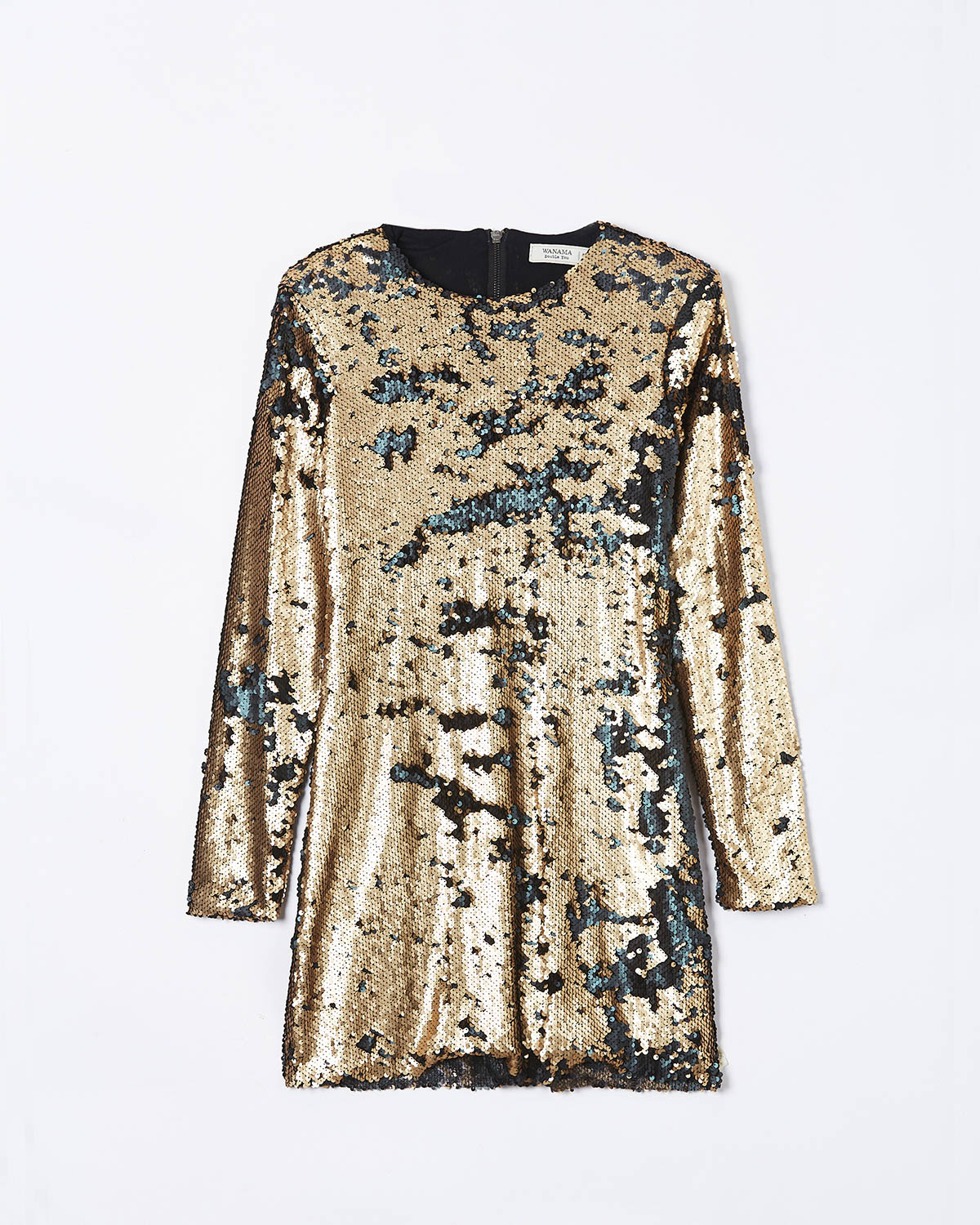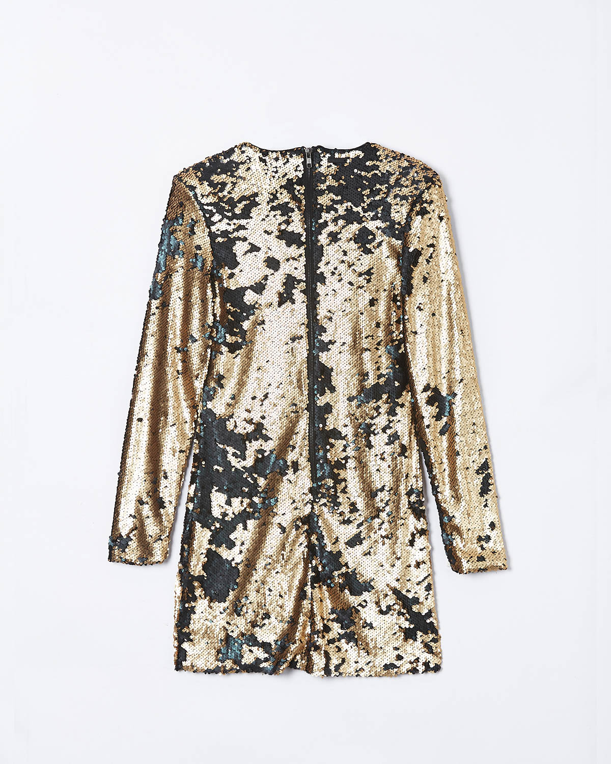 VESTIDO REALIZADO EN LENTEJUELAS, MANGAS LARGAS CON CIERRE METALICO A LA VISTA EN ESPALDA.