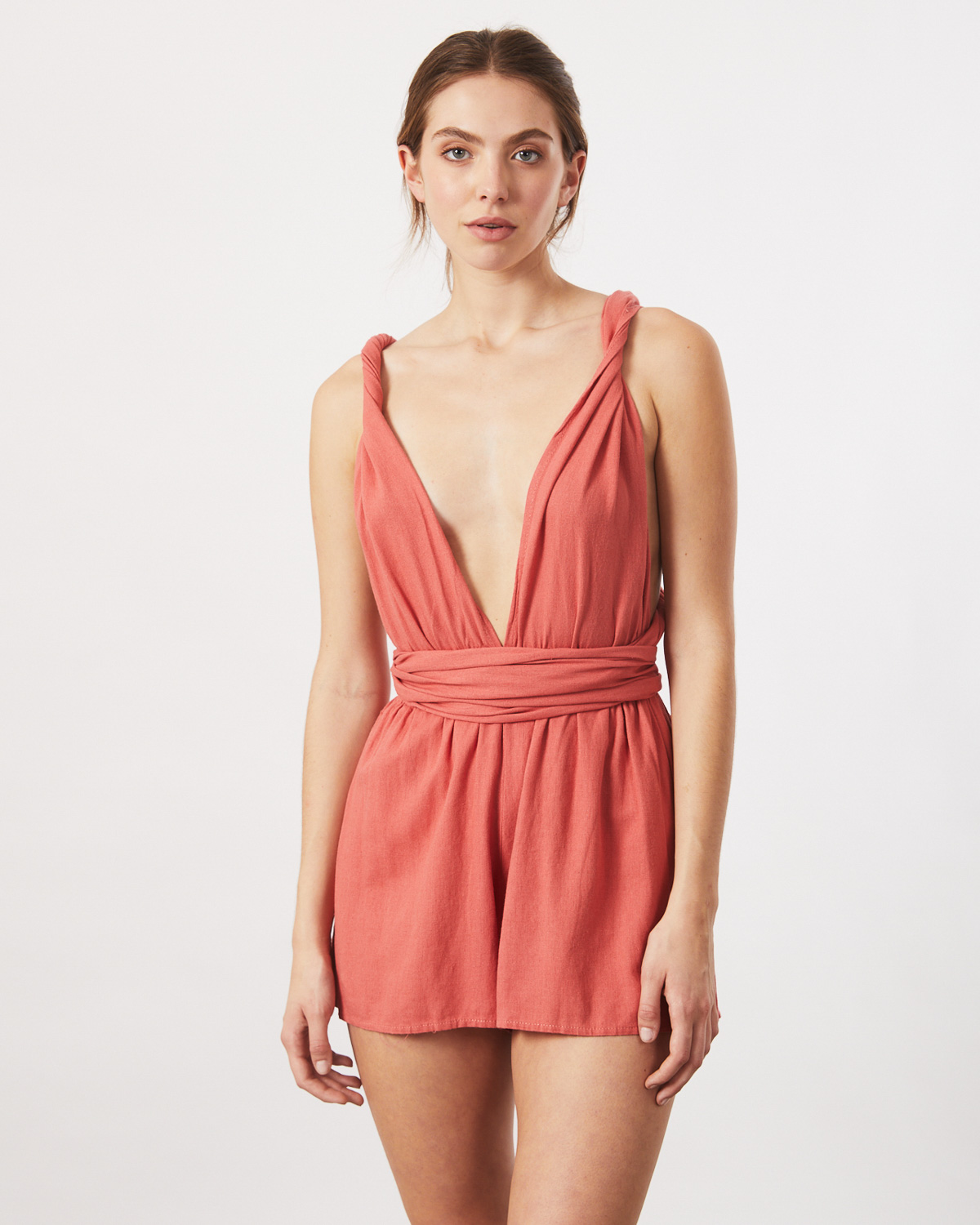 Mono corto confeccionado en lino. Con lazos delanteros, que permite diferentes formas de atar.