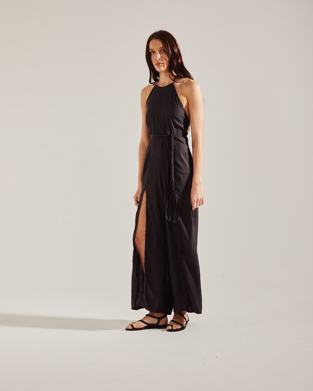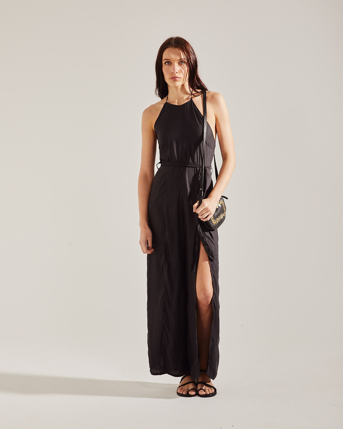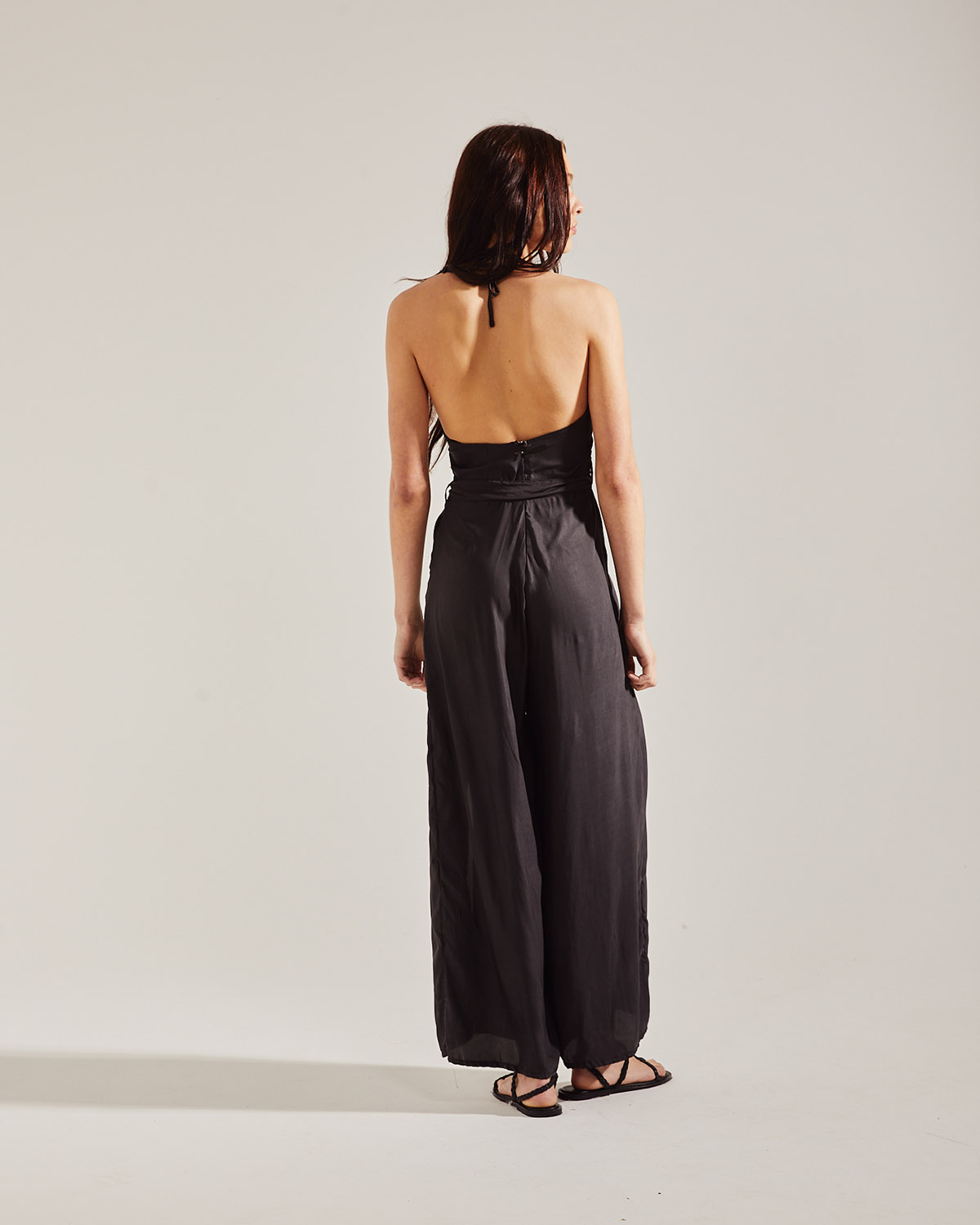 MONO CONFECCIONADO EN SEDITA. ESPALDA DESCUBIERTA CON LAZO PARA ATAR EN CUELLO Y TAJOS EN PIERNAS.
