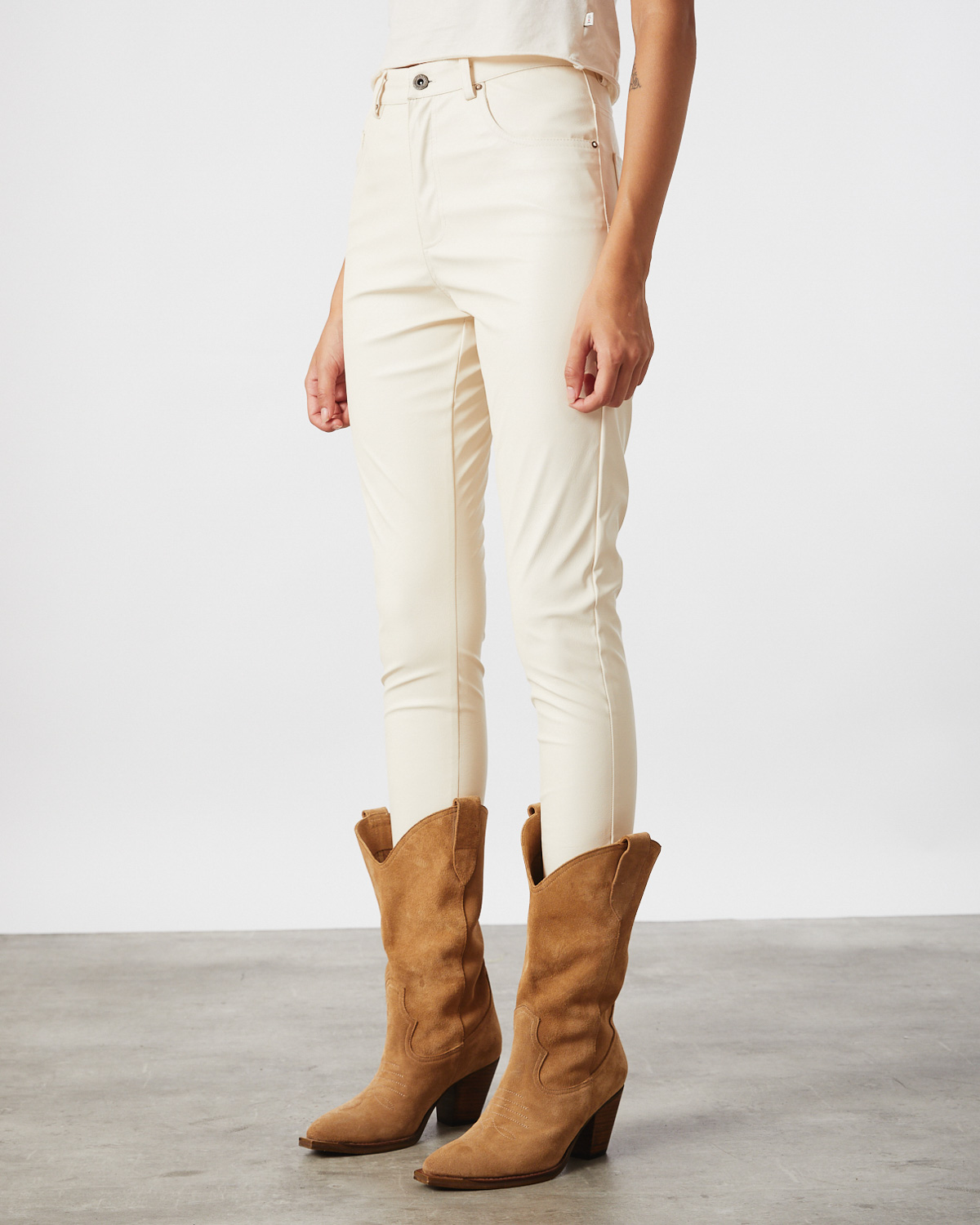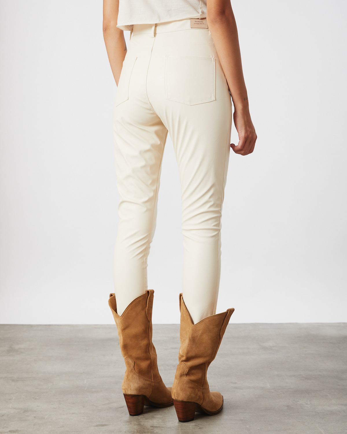 PANTALON CALCE CHUPIN DE CUERINA TEXTURIZADA, LOOK JEANERO, 5 BOLSILLOS .