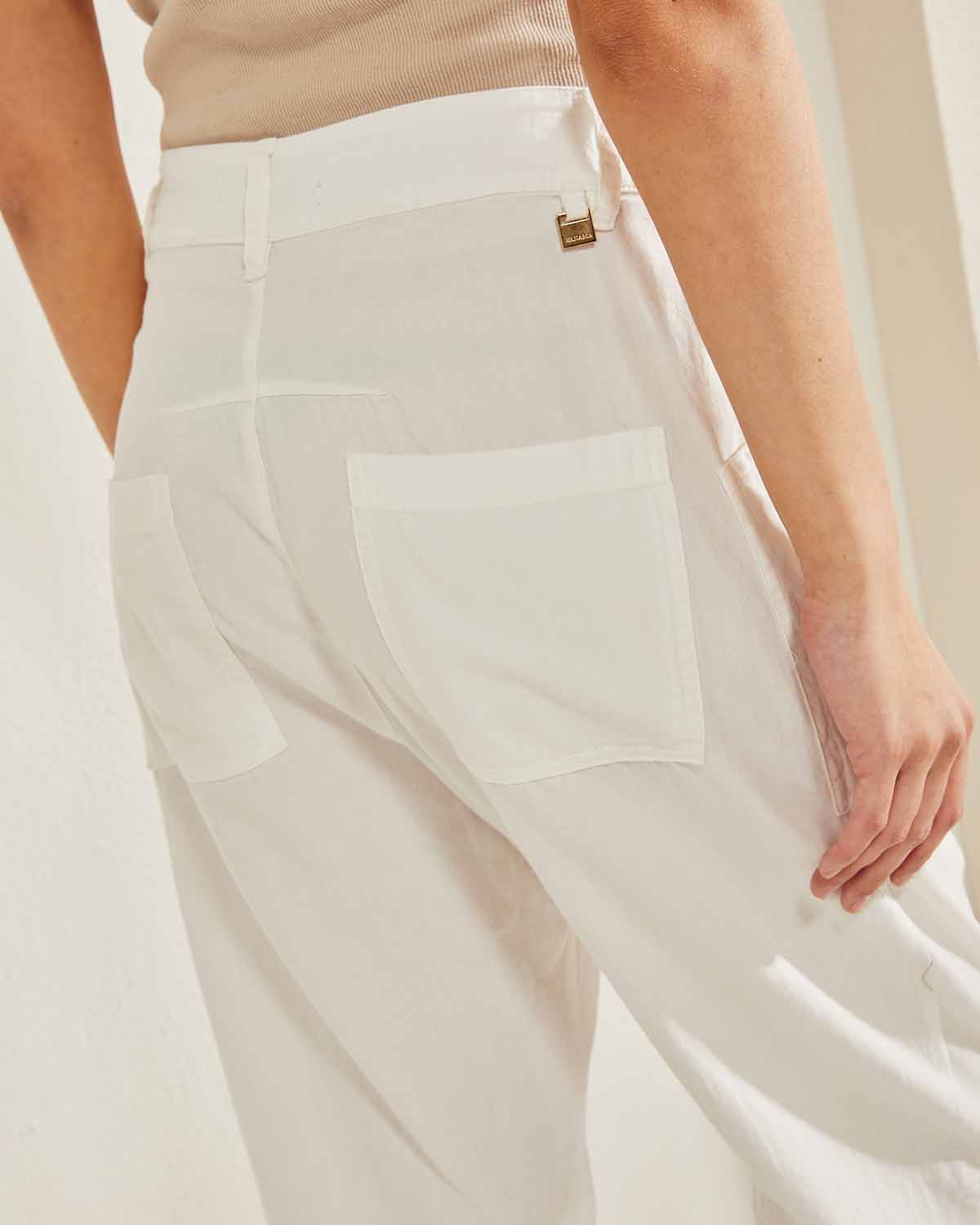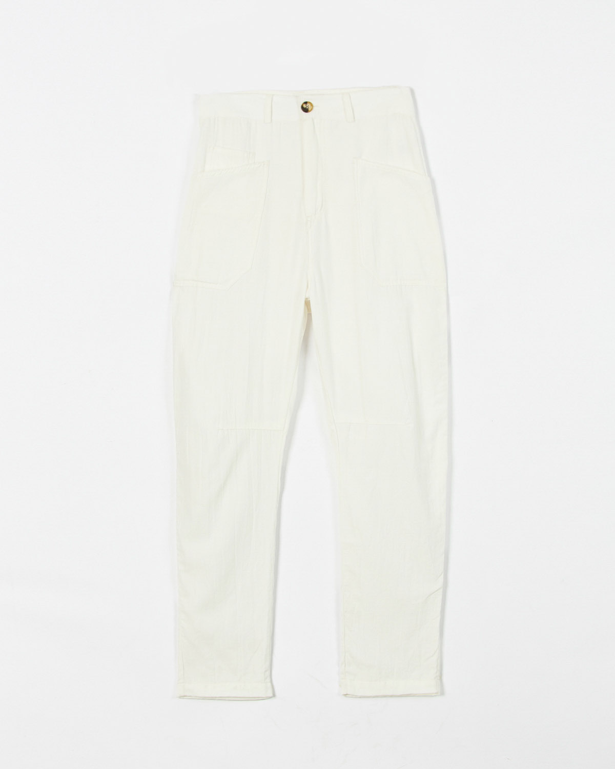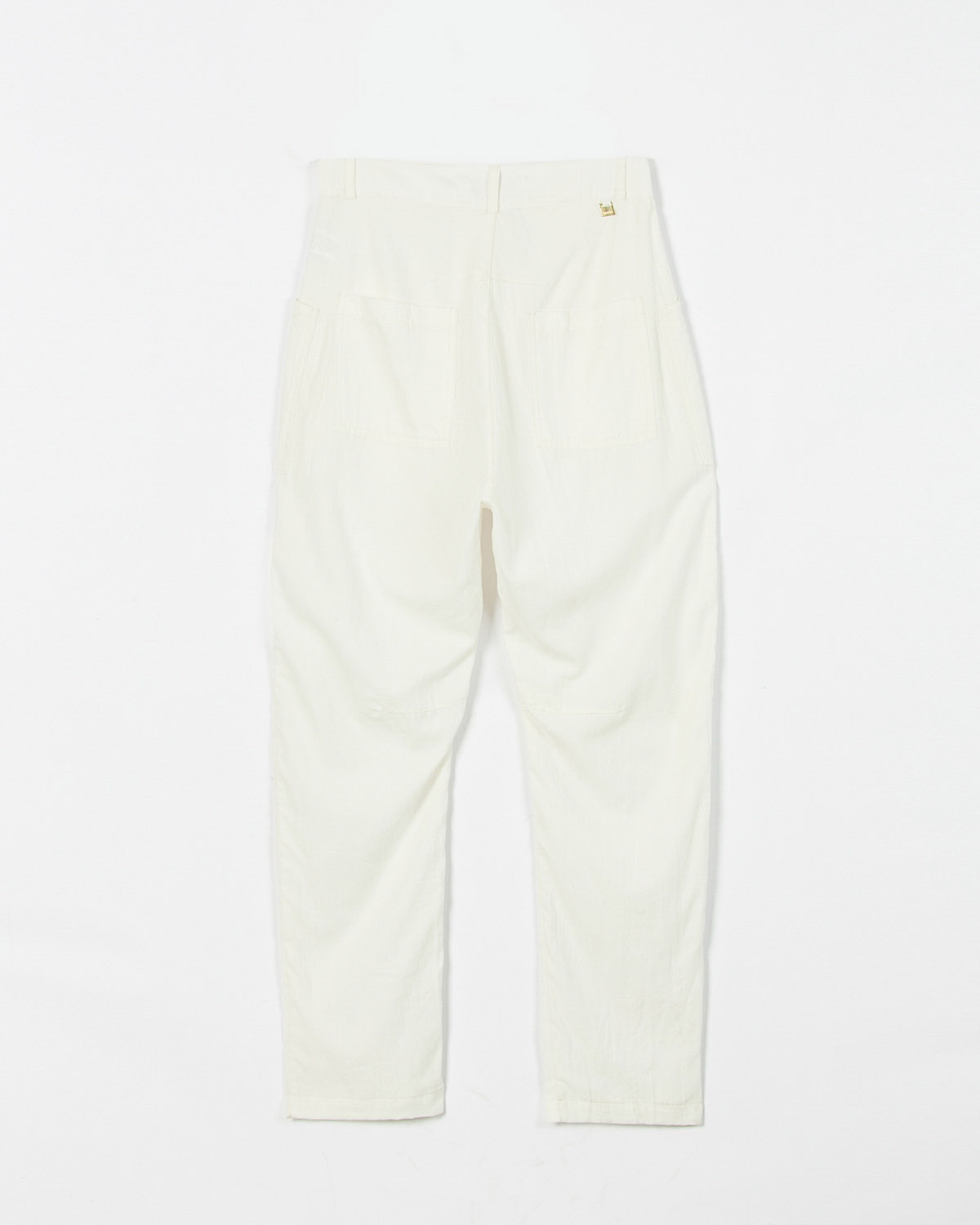 PANTALON CONFECCIONADO EN GABARDINA ELASTIZADA ESTAMPADA. CON BOLSILLOS ASIMETRICOS EN DELANTERO Y PINZAS EN RODILLAS Y ESPALDA