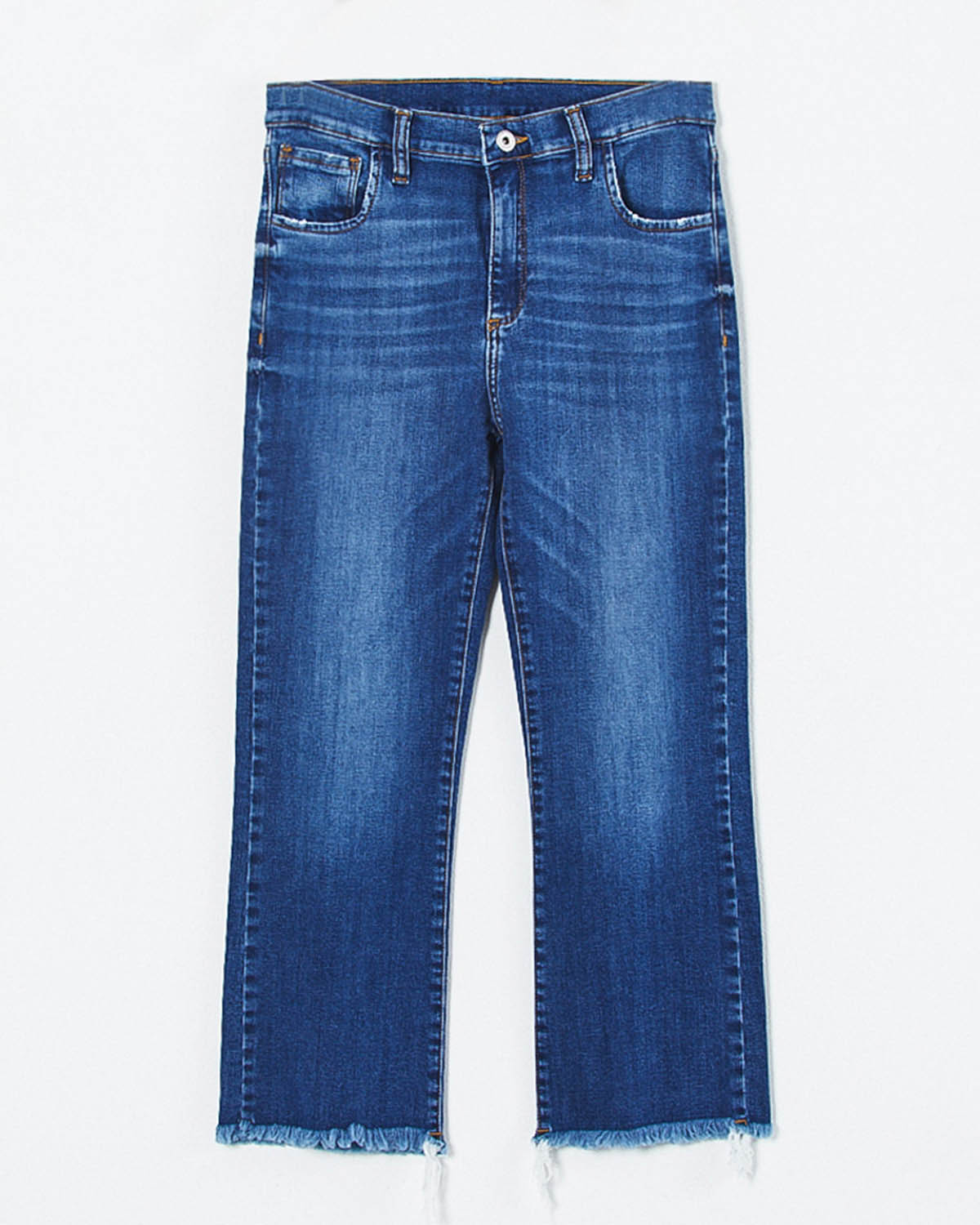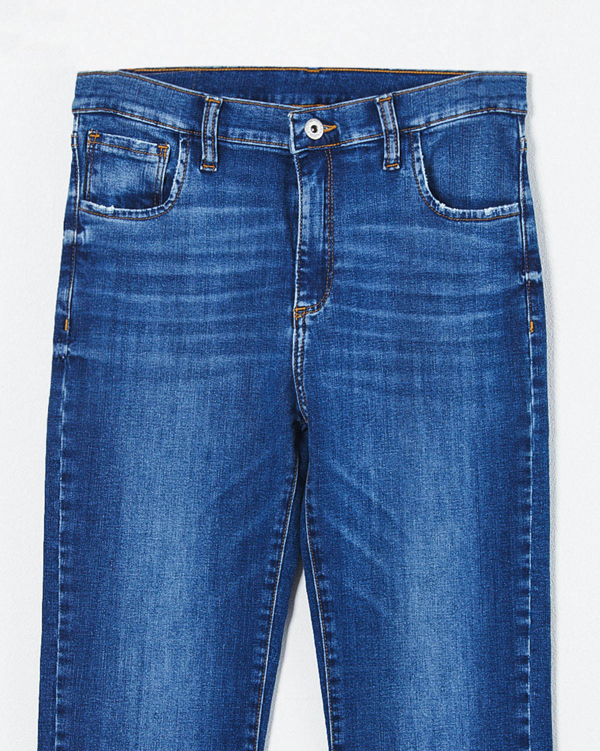 LAVADO EN AZUL GASTADO, RUEDO DESFLECADO.