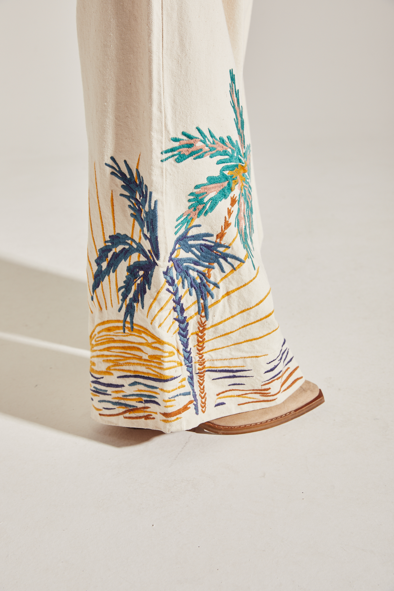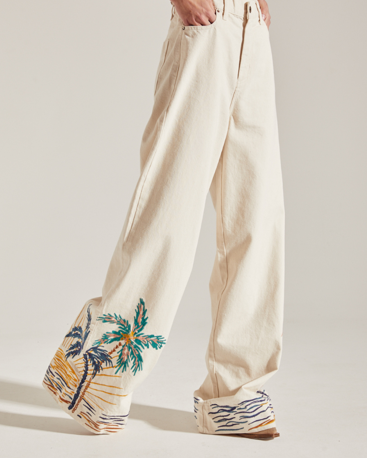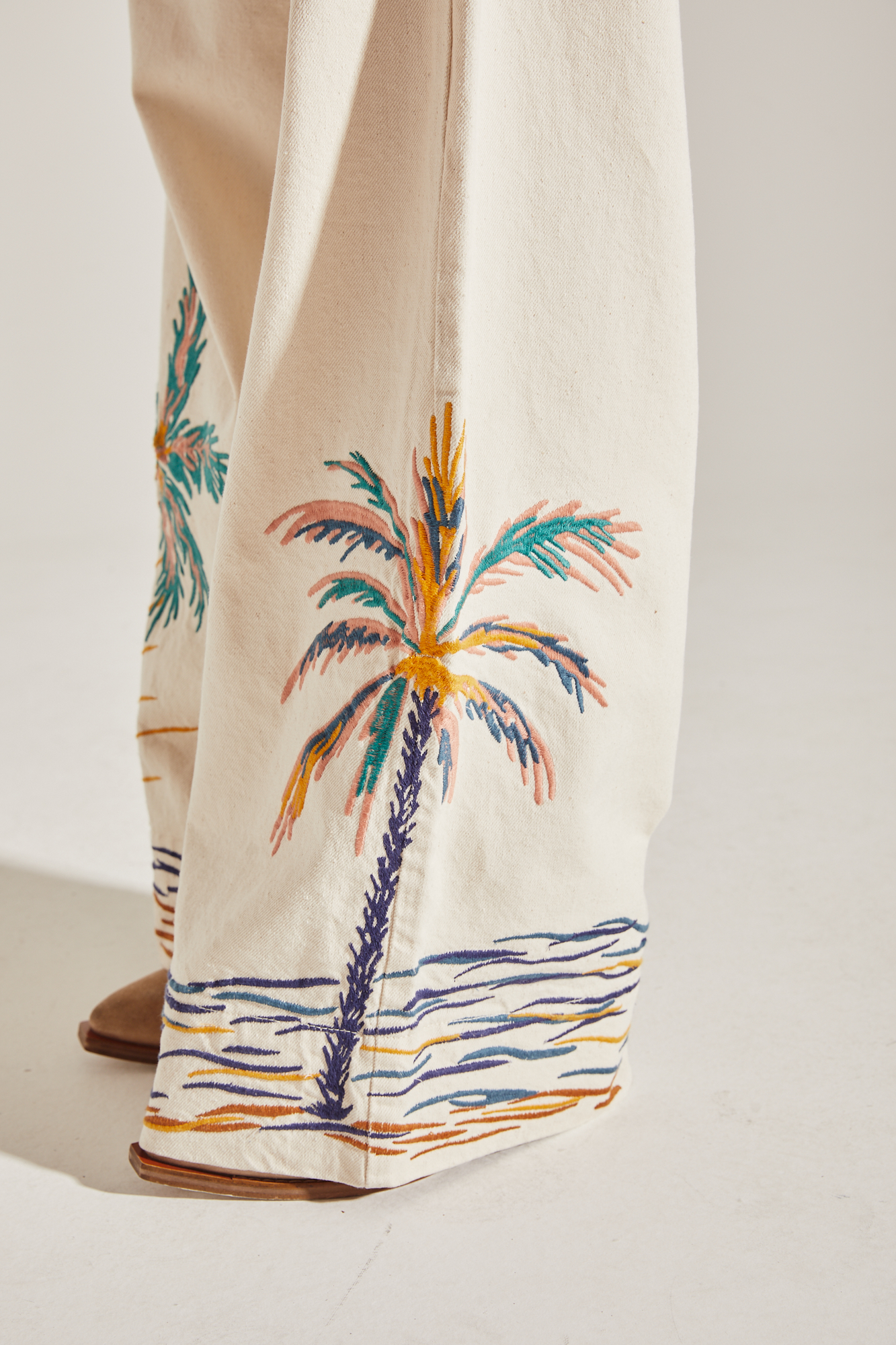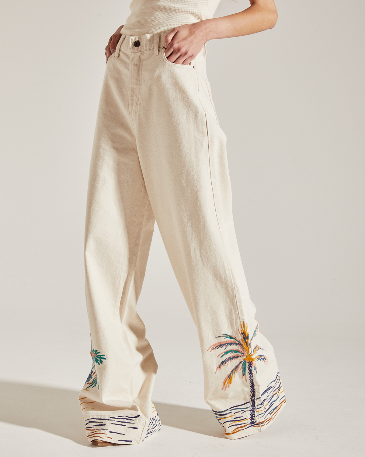 TINA ES NUESTRO CALCE WIDE LEG HIGH RISE & MID RISE. EL EMBRO PALMS RAW WHITE, TIENE BORDADOS DE PLAYA EN SU BOTAMANGA Y BOLSILLOS DELANTEROS .