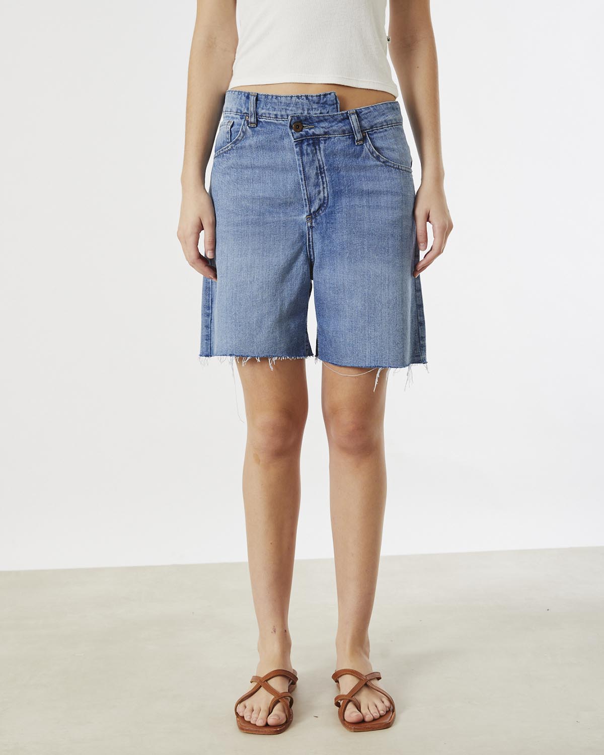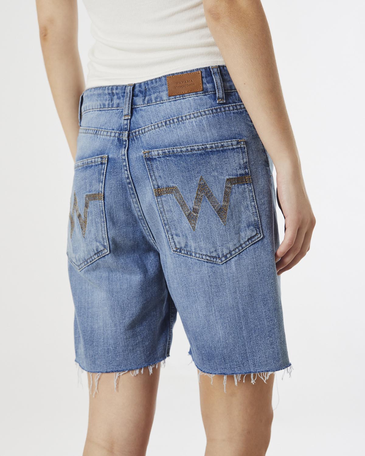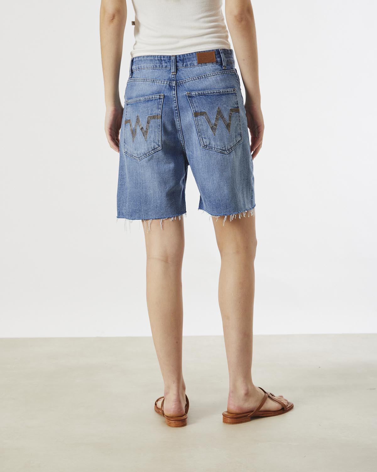LA BERMUDA ARIES TIENE LA CINTURA CORRIDA, CON UN ACCESO MEDIANTE TRES BOTONES ESCONDIDOS EN CARTERA Y UNO EN CINTURA. TIENE UN LAVADO USED MID BLUE CON BORDADO DE MARCA EN BOLSILLOS TRASEROS Y RUEDO AL CORTE DESFLECADO. LLEGA HASTA POR SO