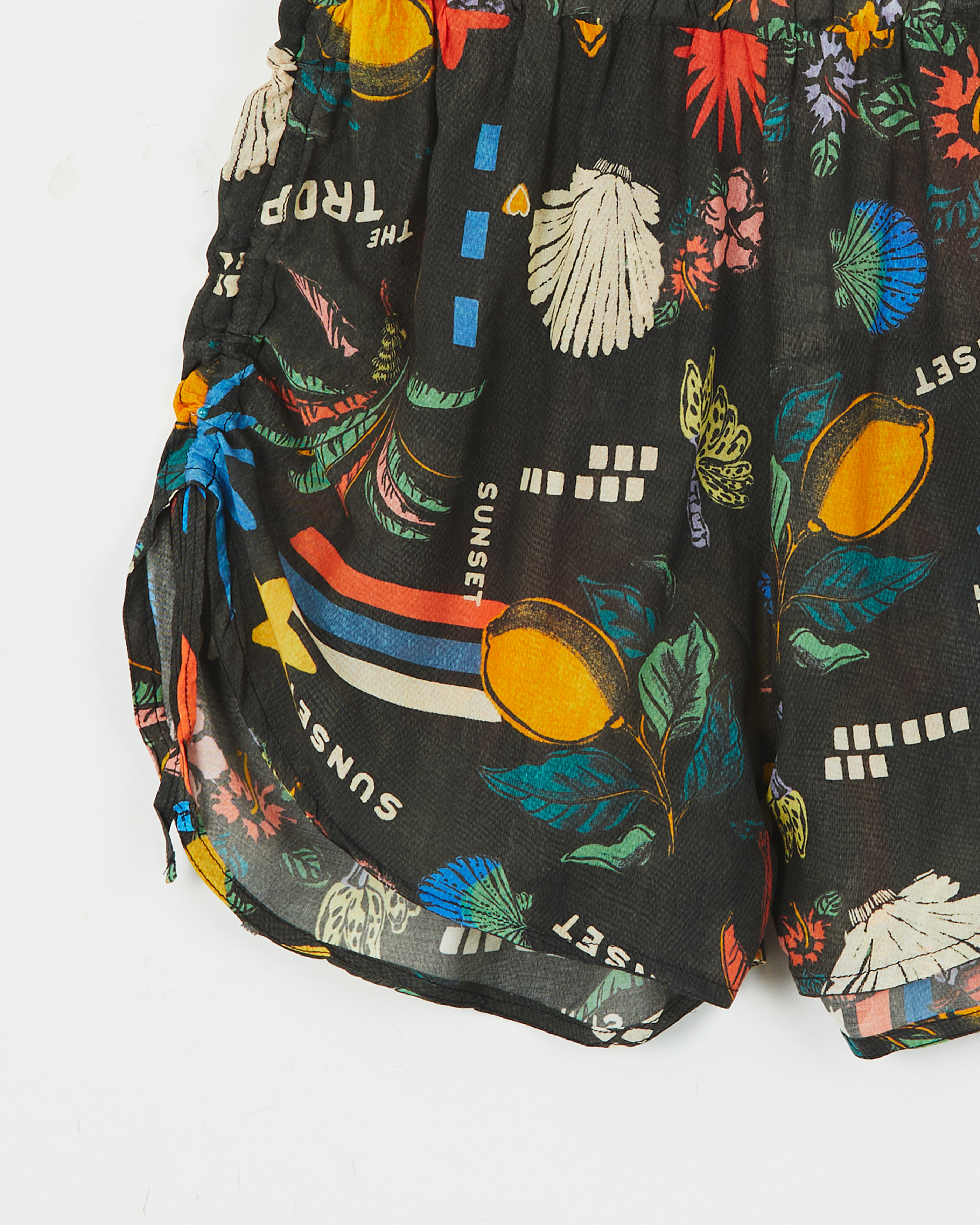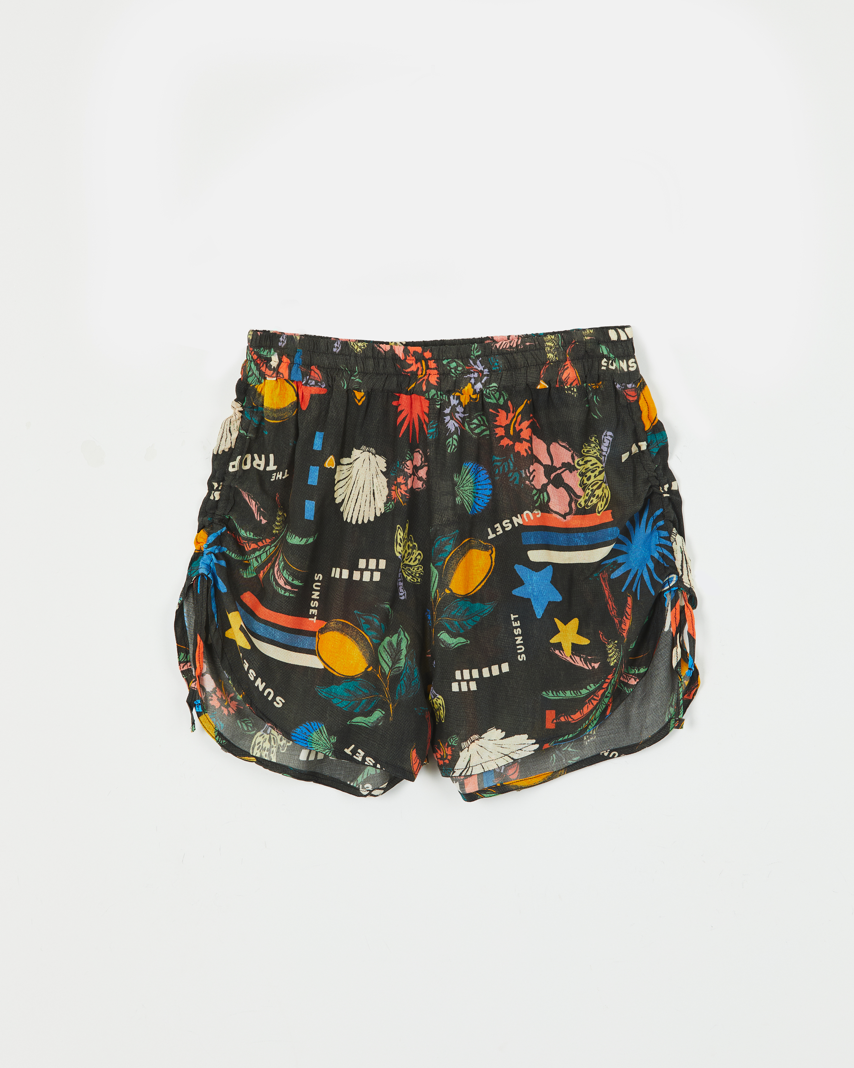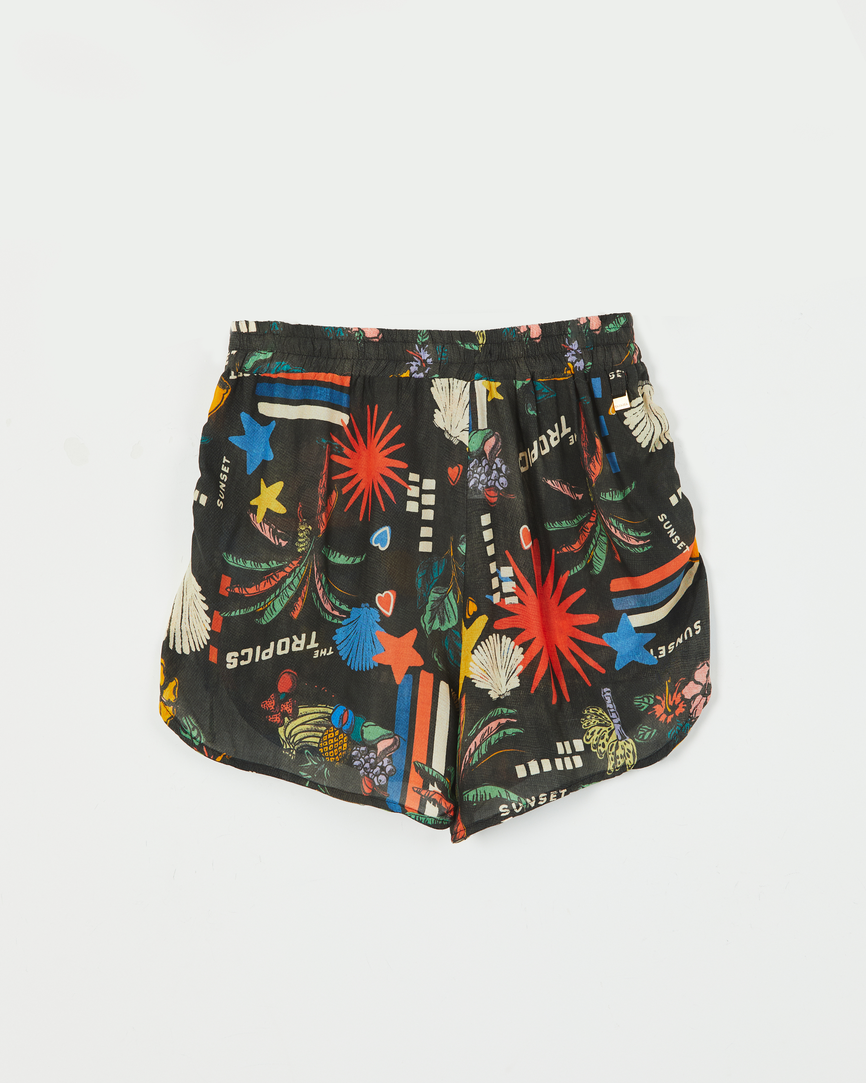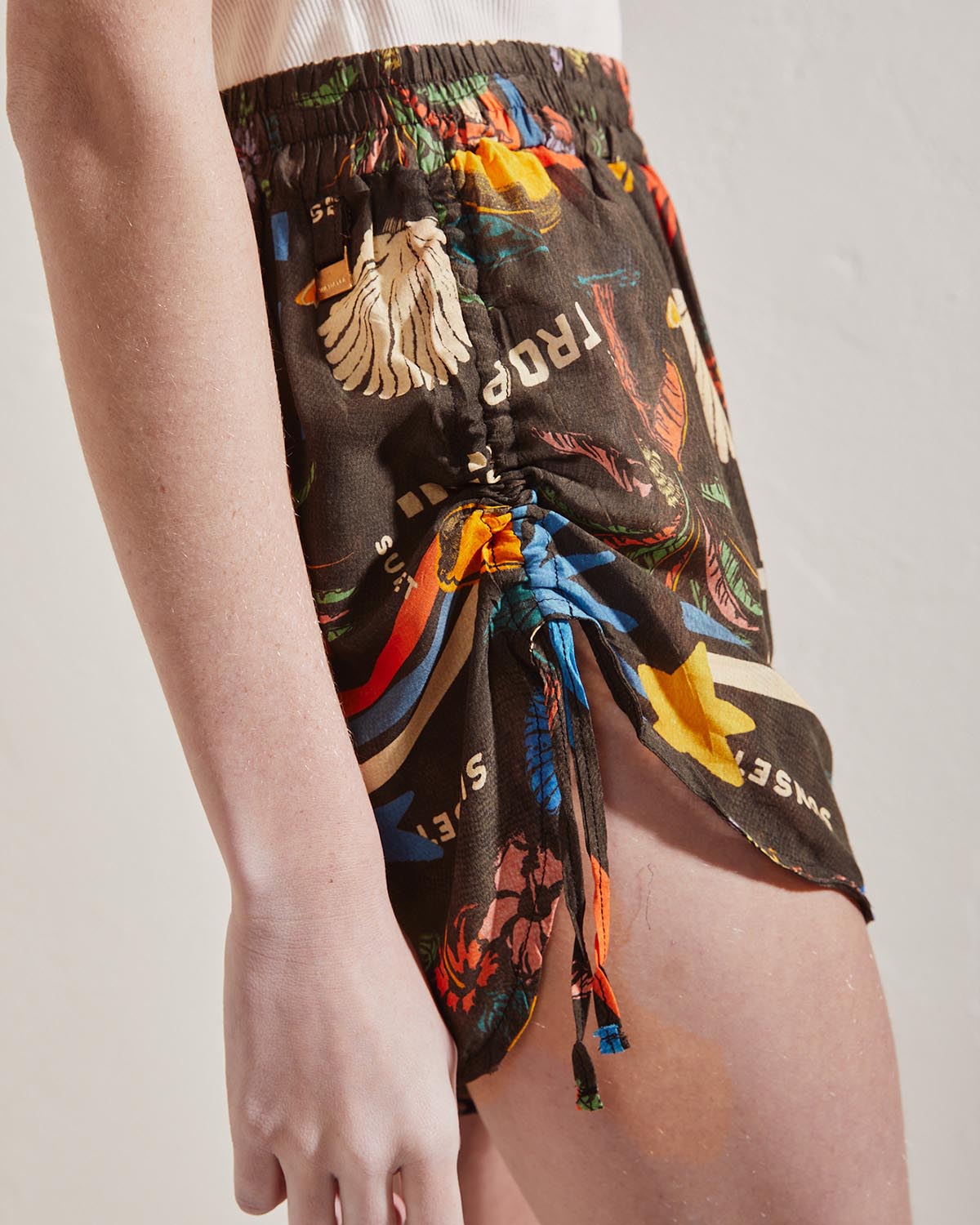 SHORT CONFECCIONADO EN VISCOSA ESTAMPADA. CON ELASTICO ANCHO EN CINTURA. CALCE AMPLIO.