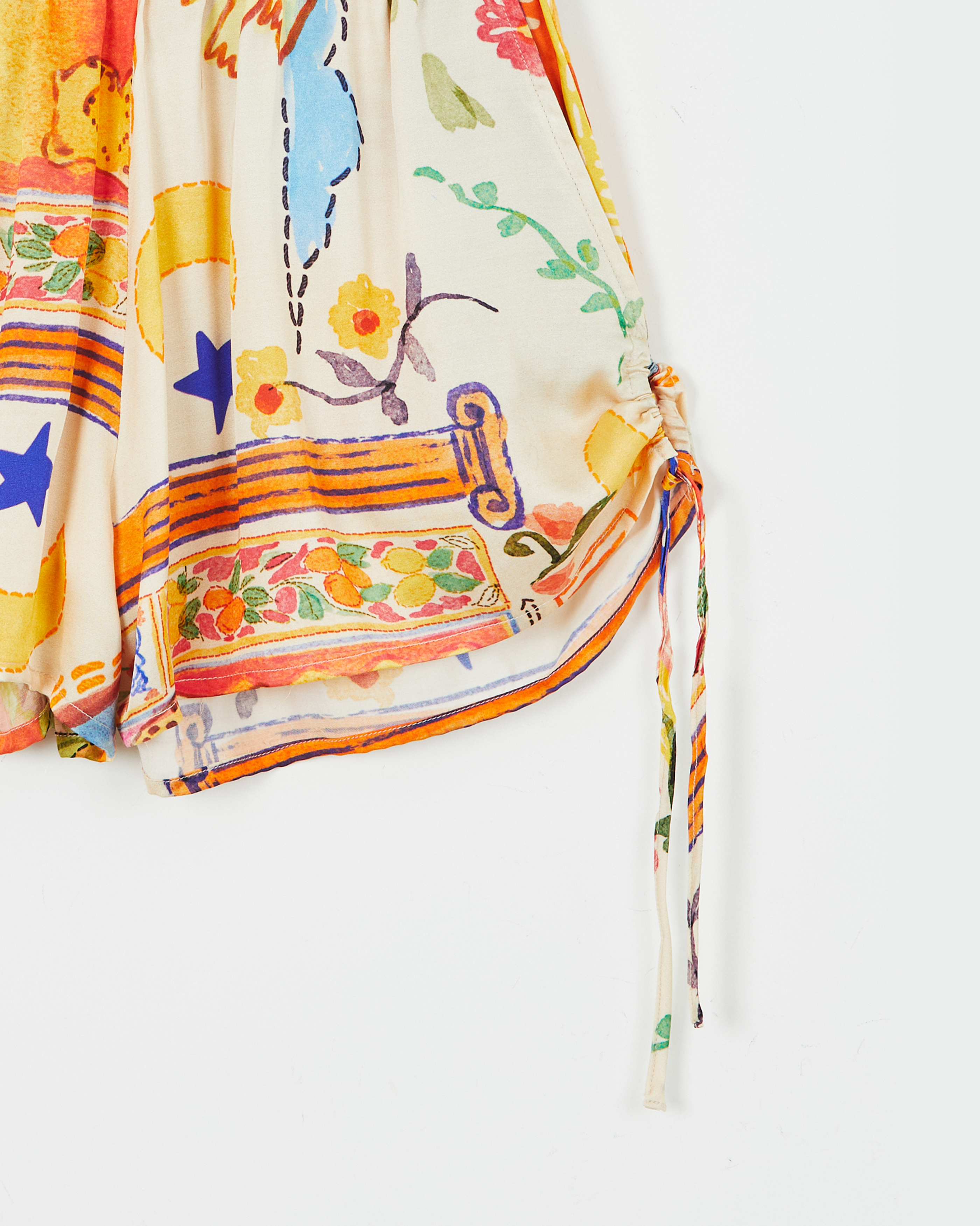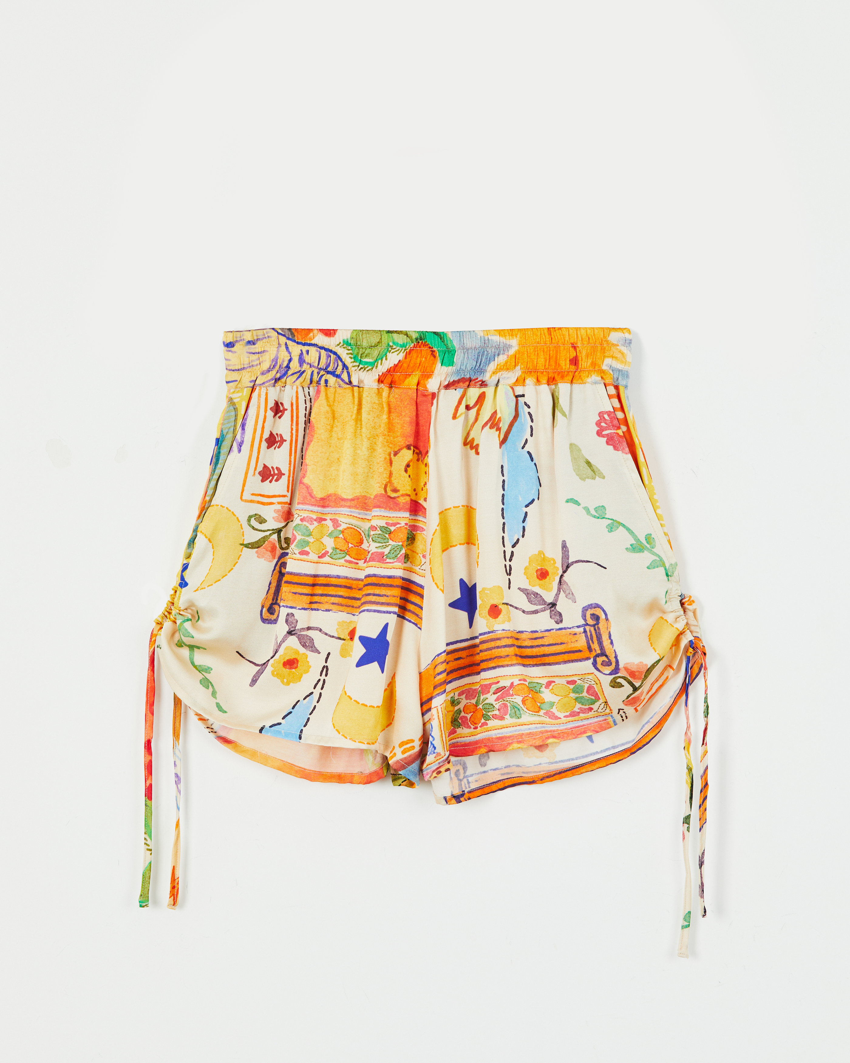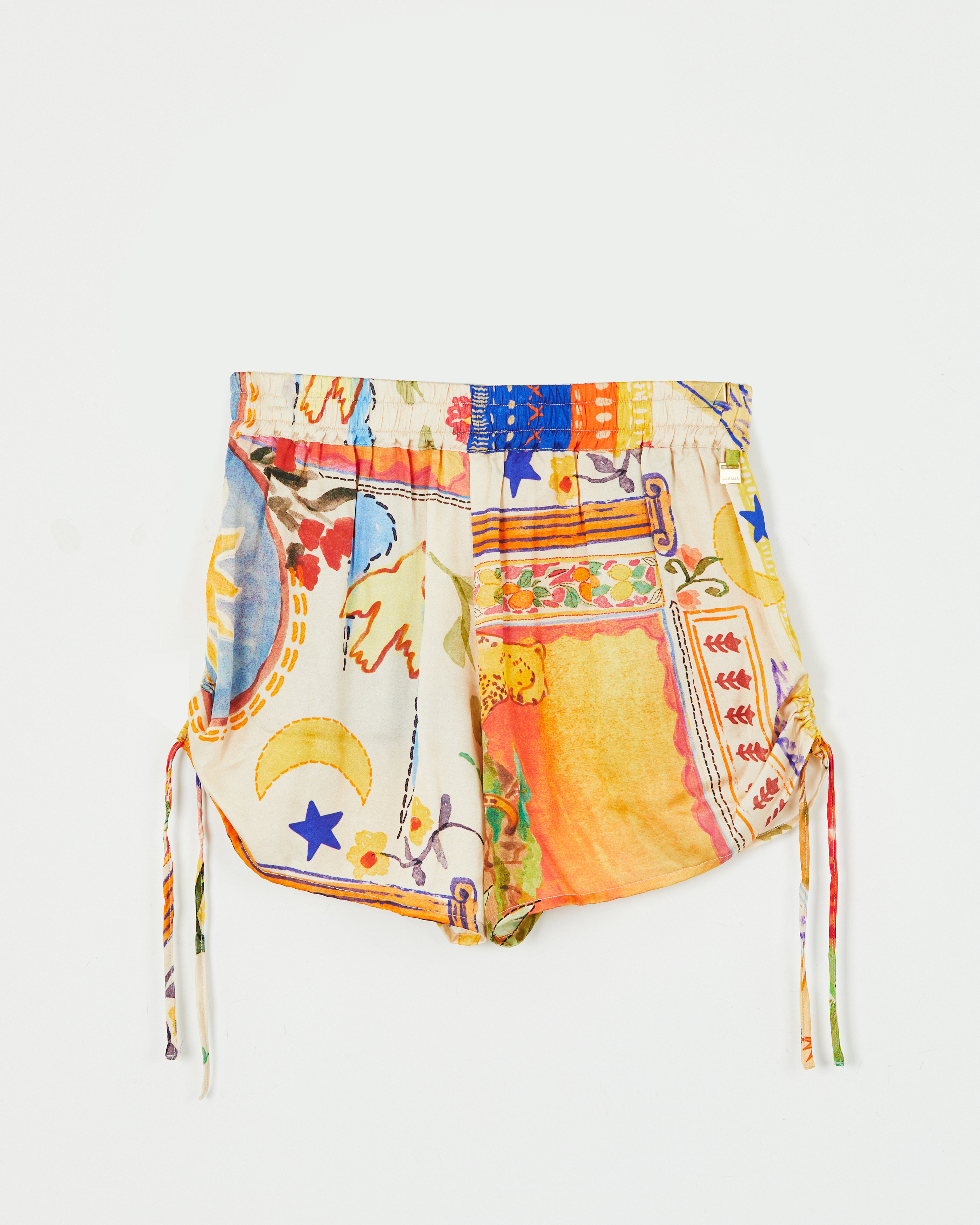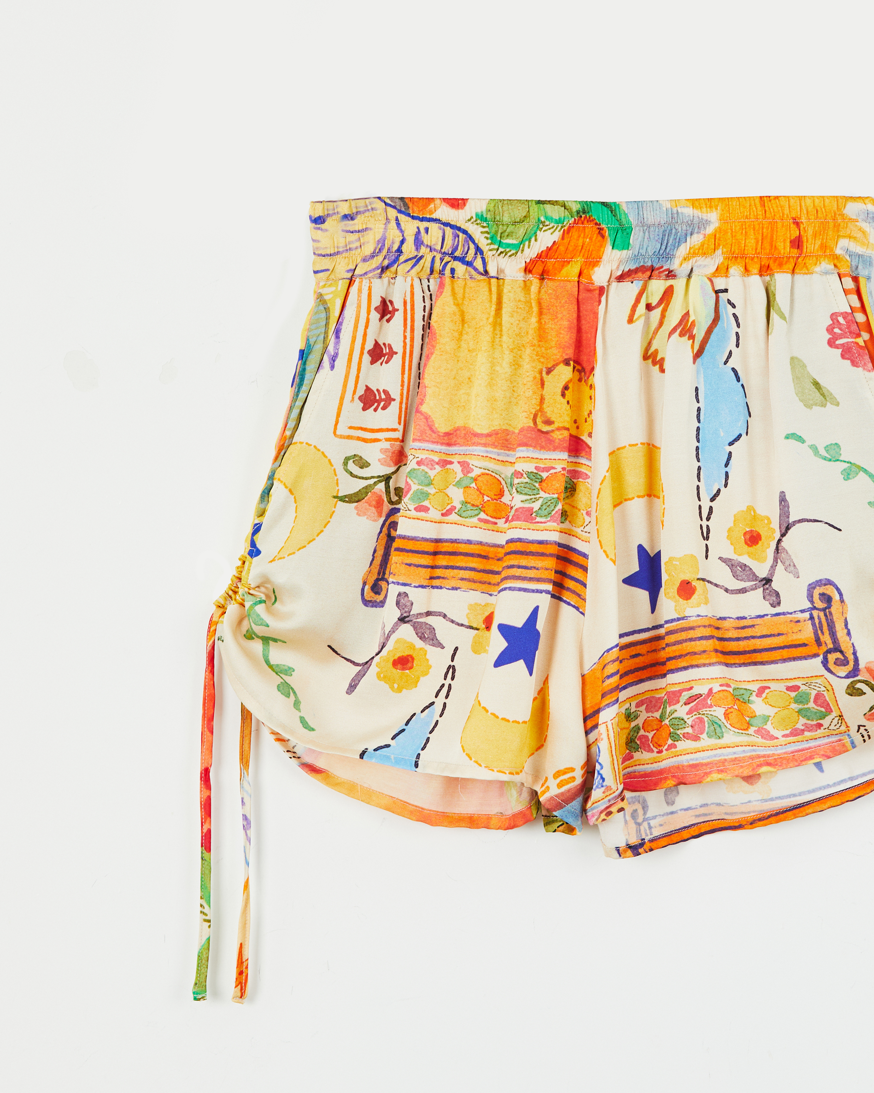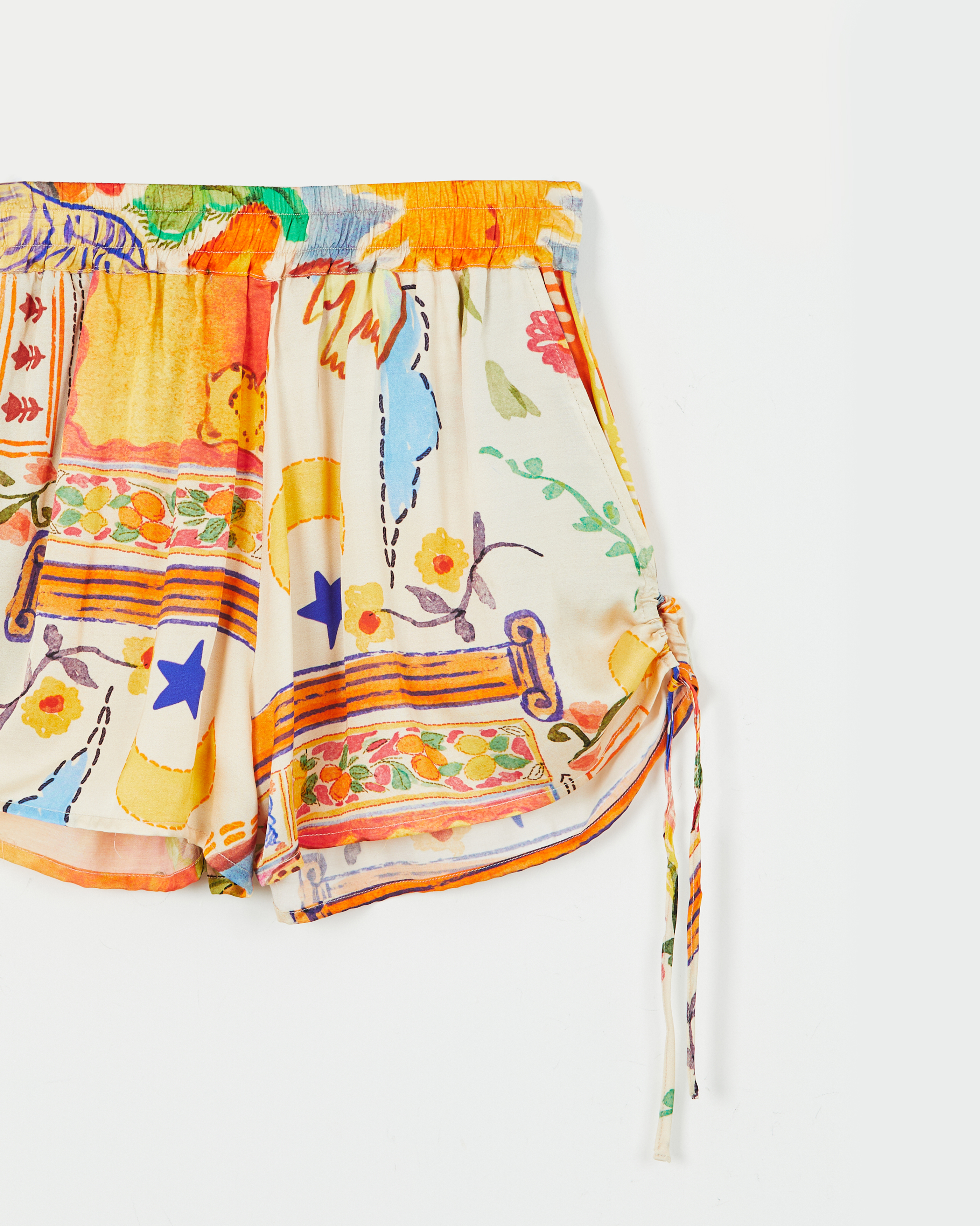 SHORT CONFECCIONADO EN VISCOSA ESTAMPADA CON CINTURA ANCHA ELASTIZADA. JARETA EN LATERALES PARA REGULAR EL LARGO Y BOLSILLOS.
