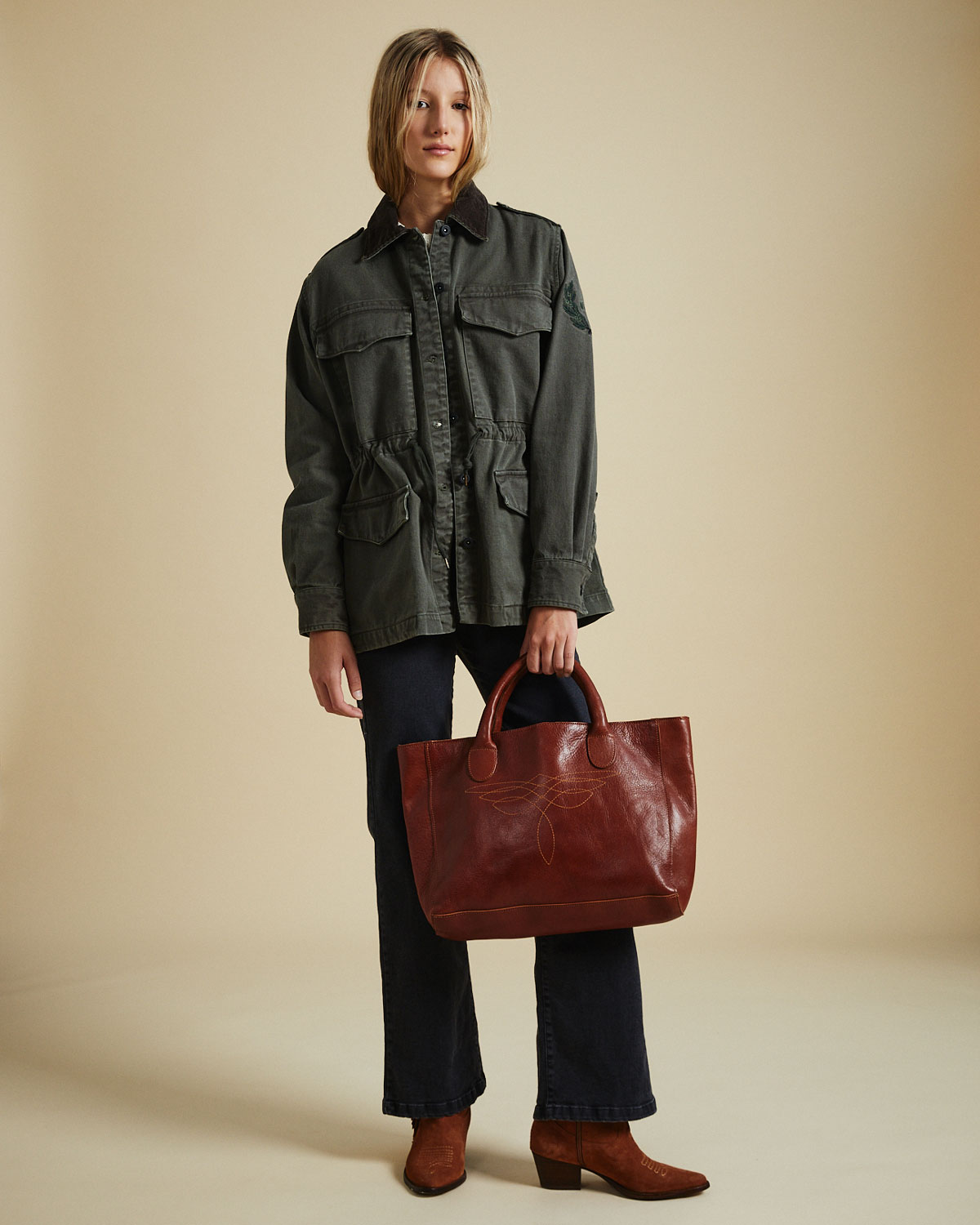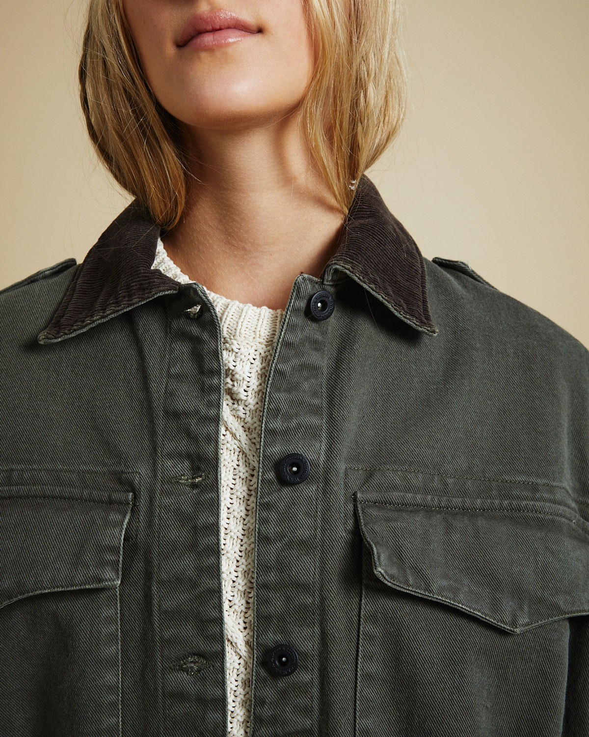 CAMPERA CONFECCIONADA EN GABARDINA CON BOLSILLOS EN DELANTERO Y JARETA PARA REGULAR EN CINTURA, CON SOLAPA DE CUELLO EN CORDEROY. CON BOTONES EN CARTERA Y PUÑOS