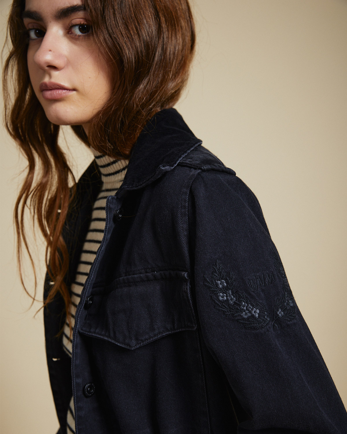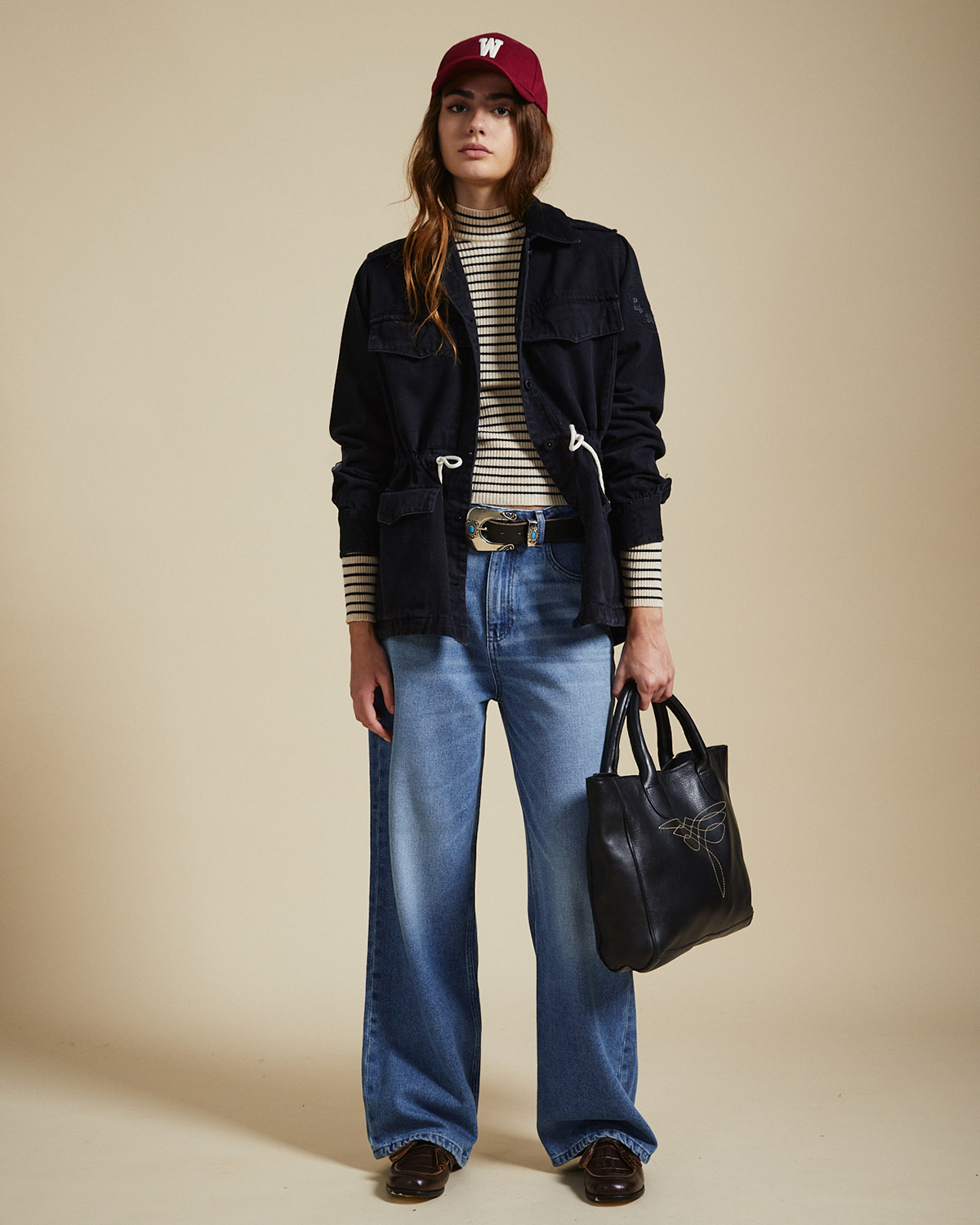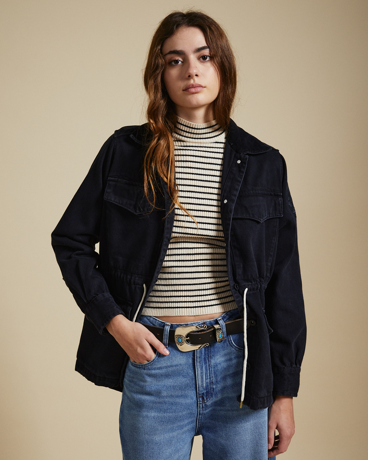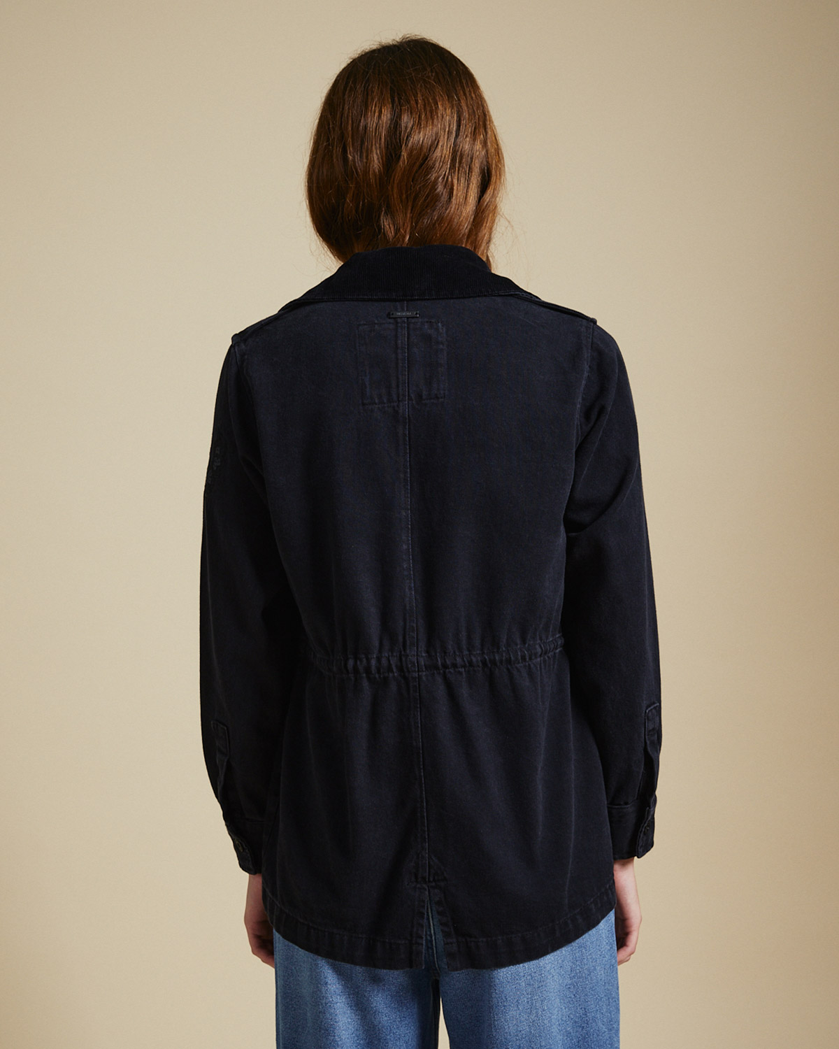 CAMPERA CONFECCIONADA EN GABARDINA CON BOLSILLOS EN DELANTERO Y JARETA PARA REGULAR EN CINTURA, CON SOLAPA DE CUELLO EN CORDEROY. CON BOTONES EN CARTERA Y PUÑOS