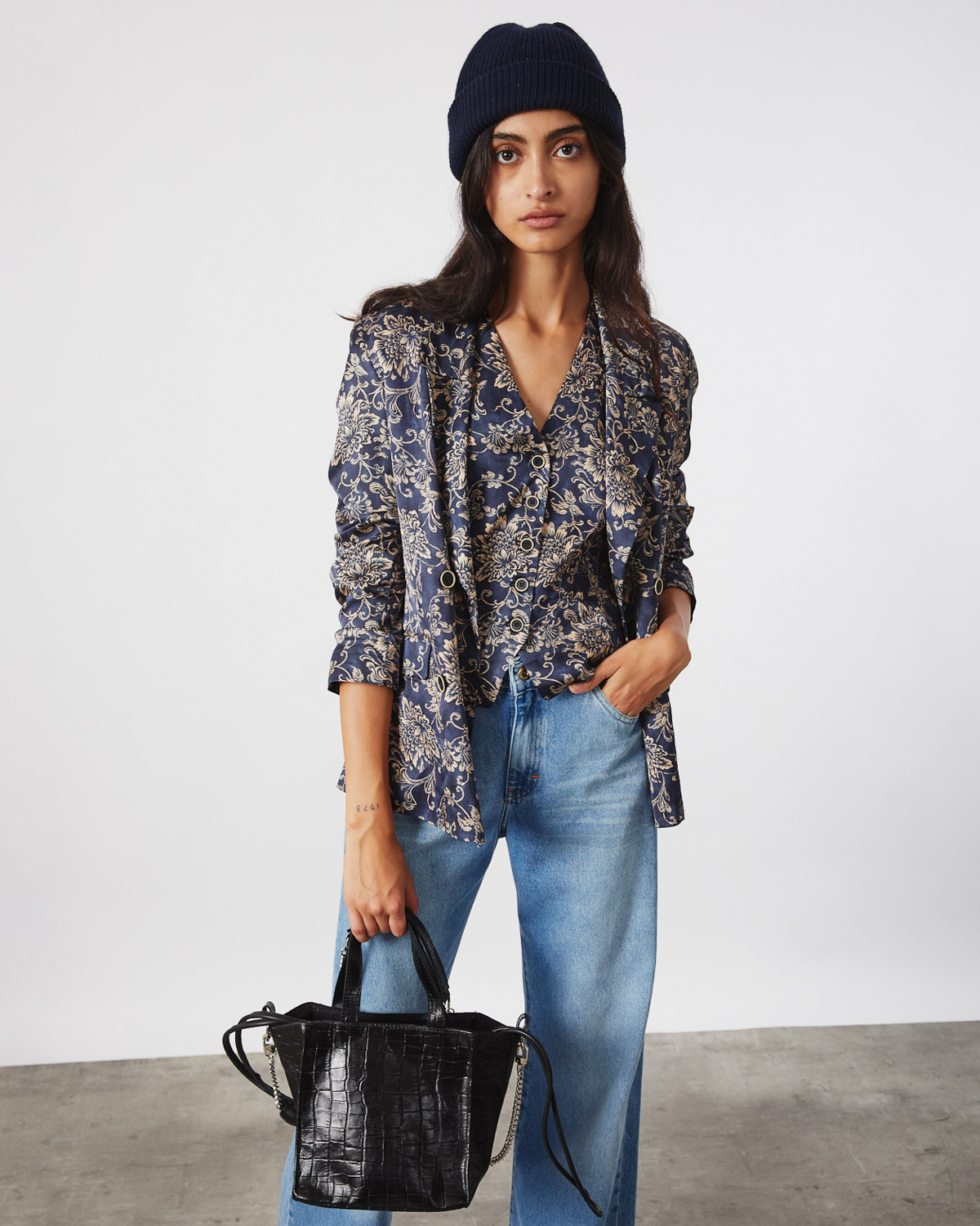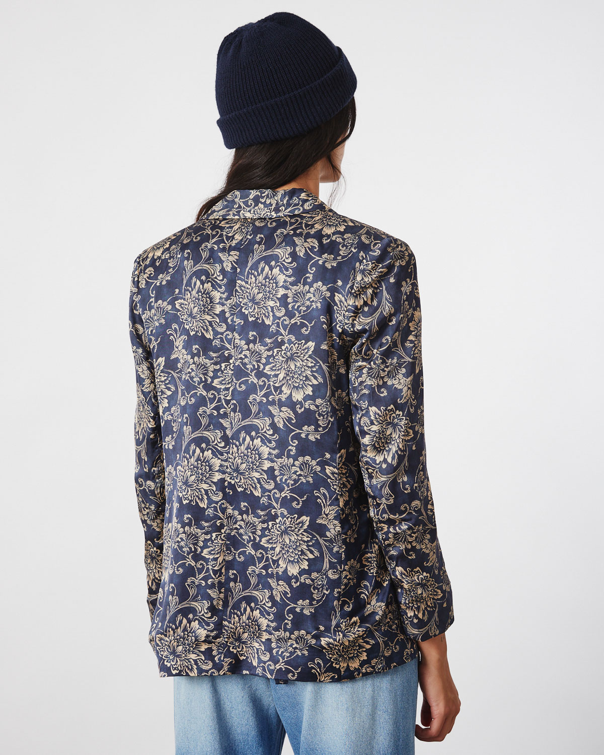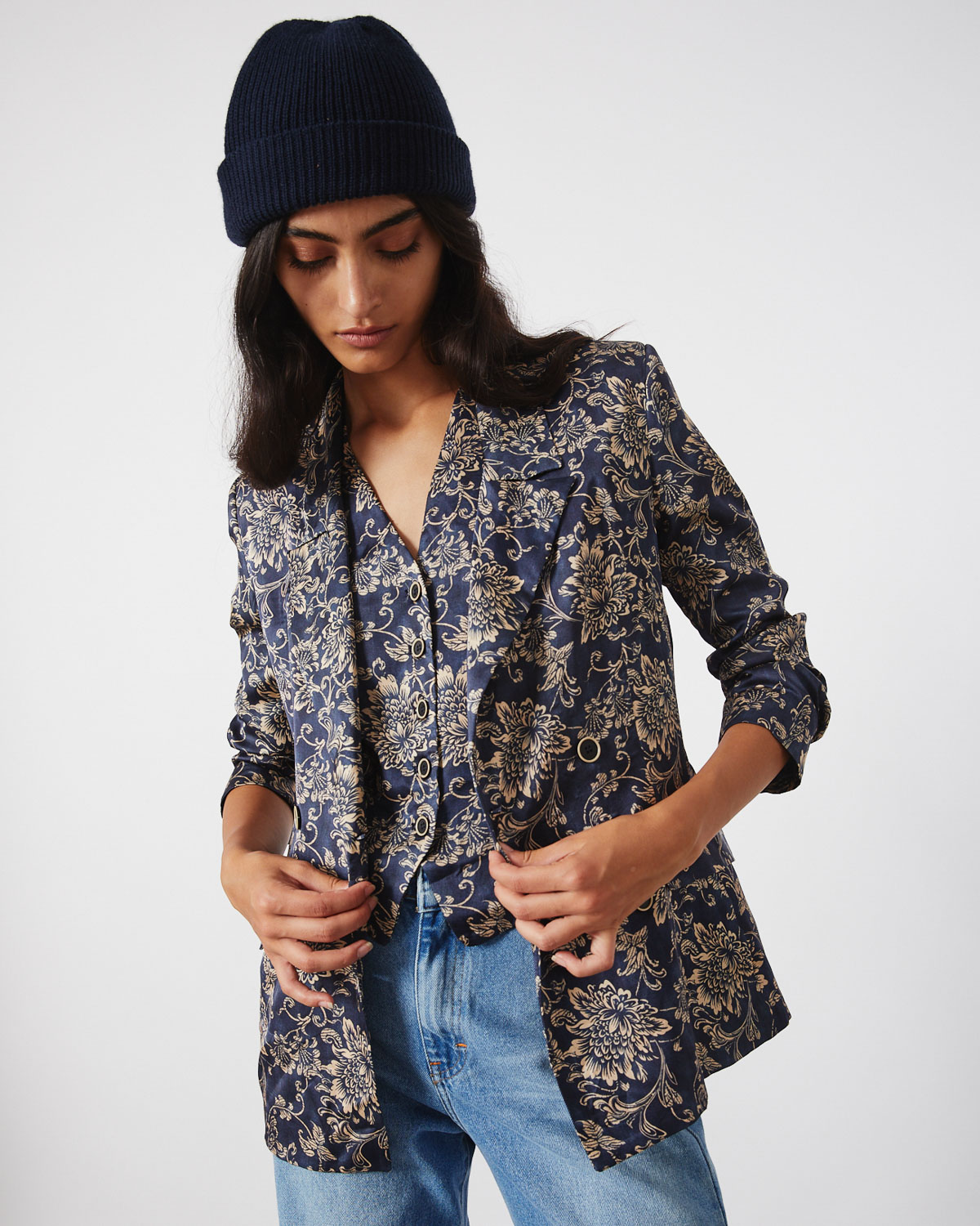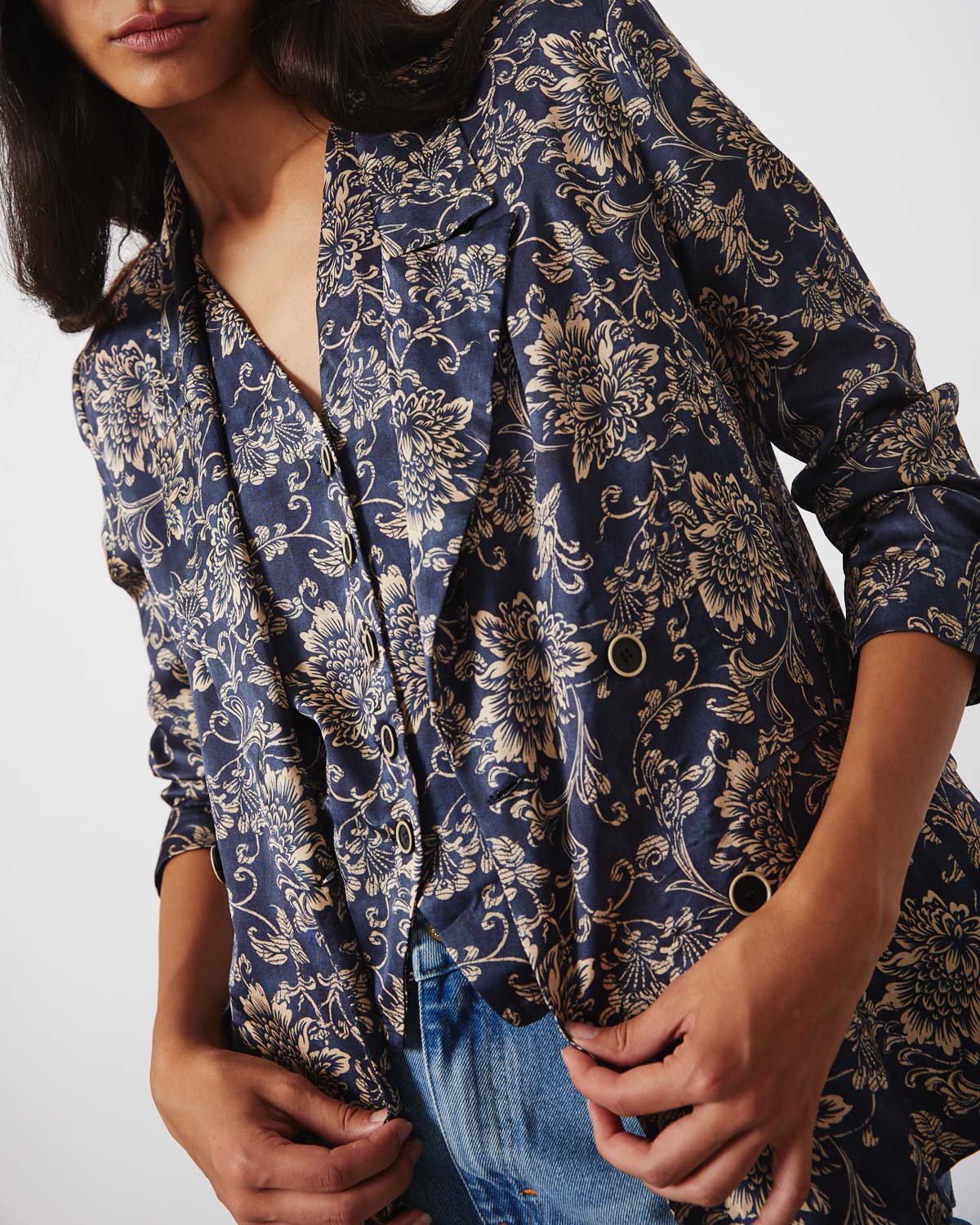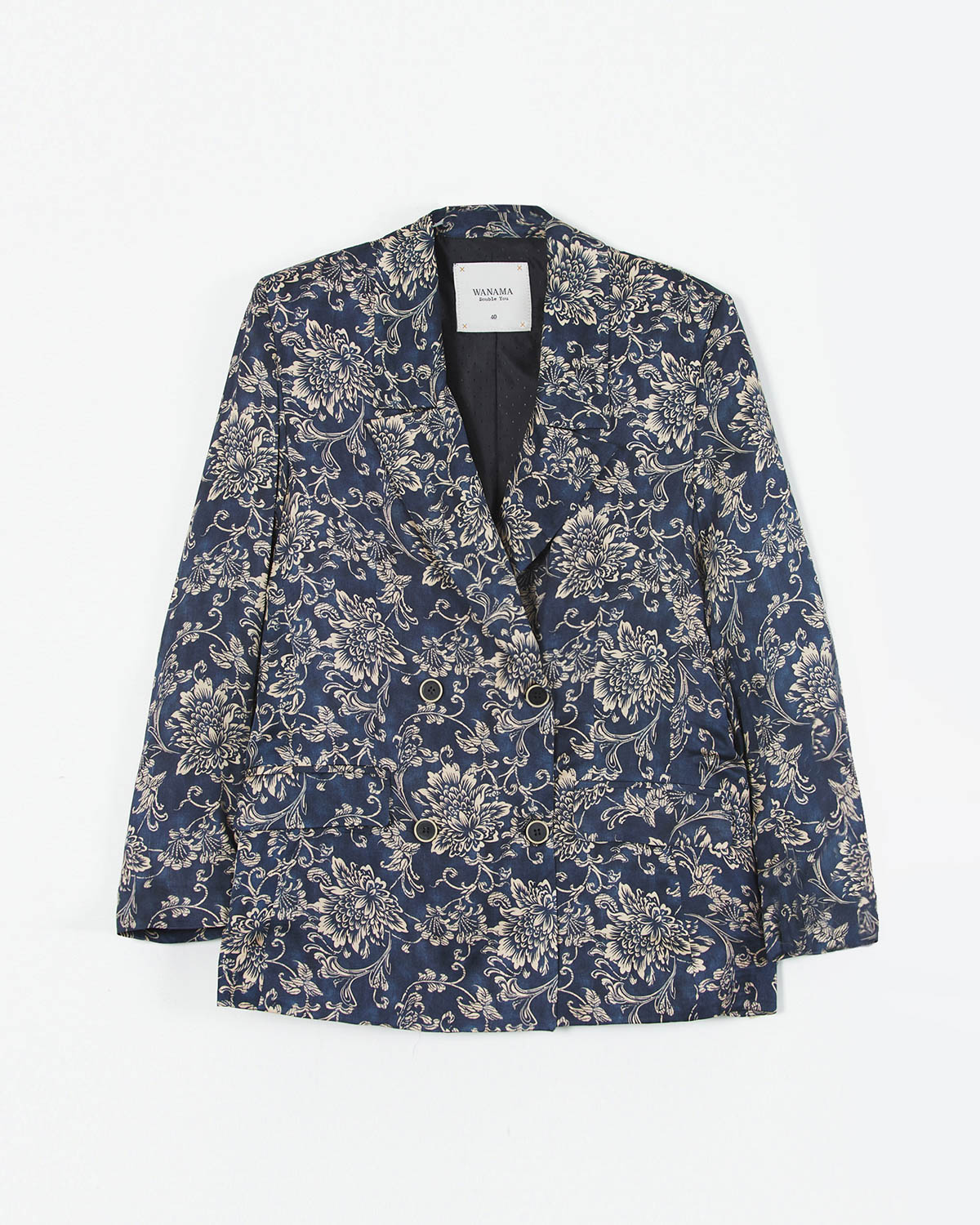SACO CONFECCIONADO EN VISCOSA ESTAMPADA. CON SOLAPAS Y CRUCE EN EL FRENTE, DOBLE ABOTONADURA.