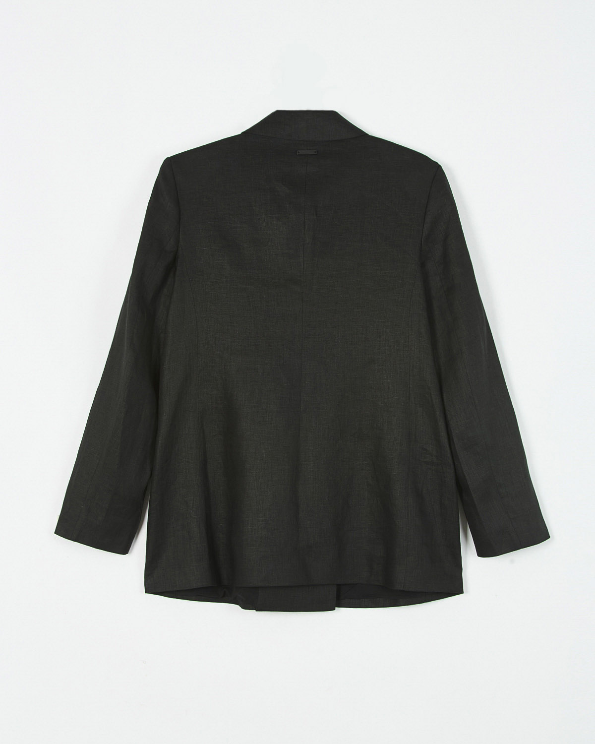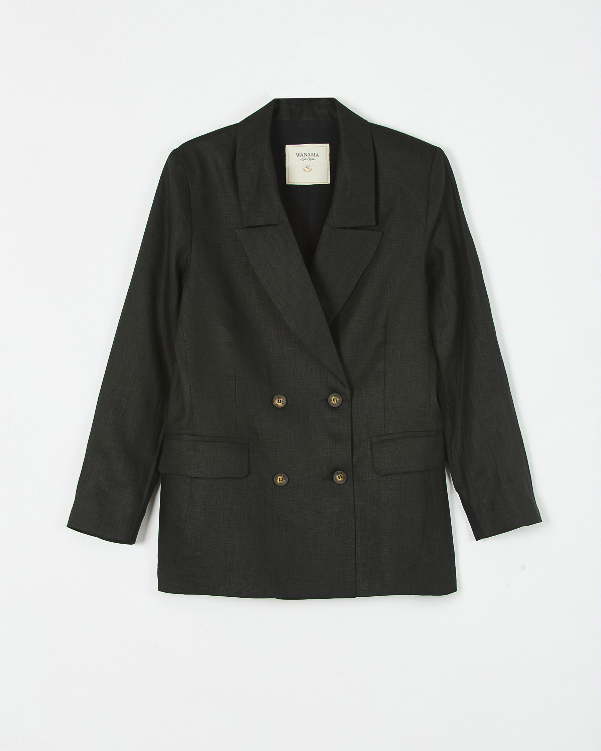 SACO CRUZADO CON HOMBRERAS CONFECCIONADO EN LINO. 4 BOTONES EN DELANTERO Y BOLSILLOS CON SOLAPAS.