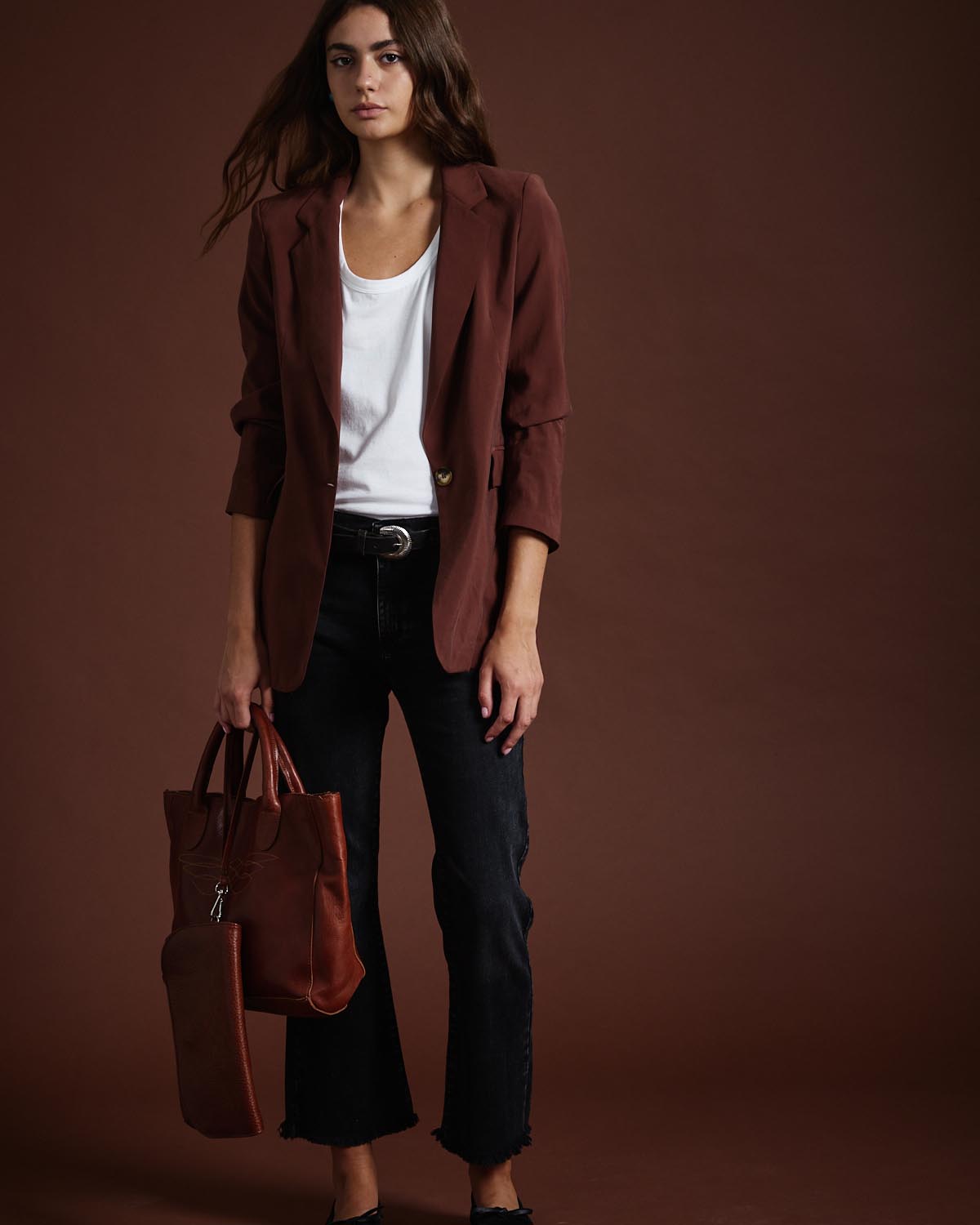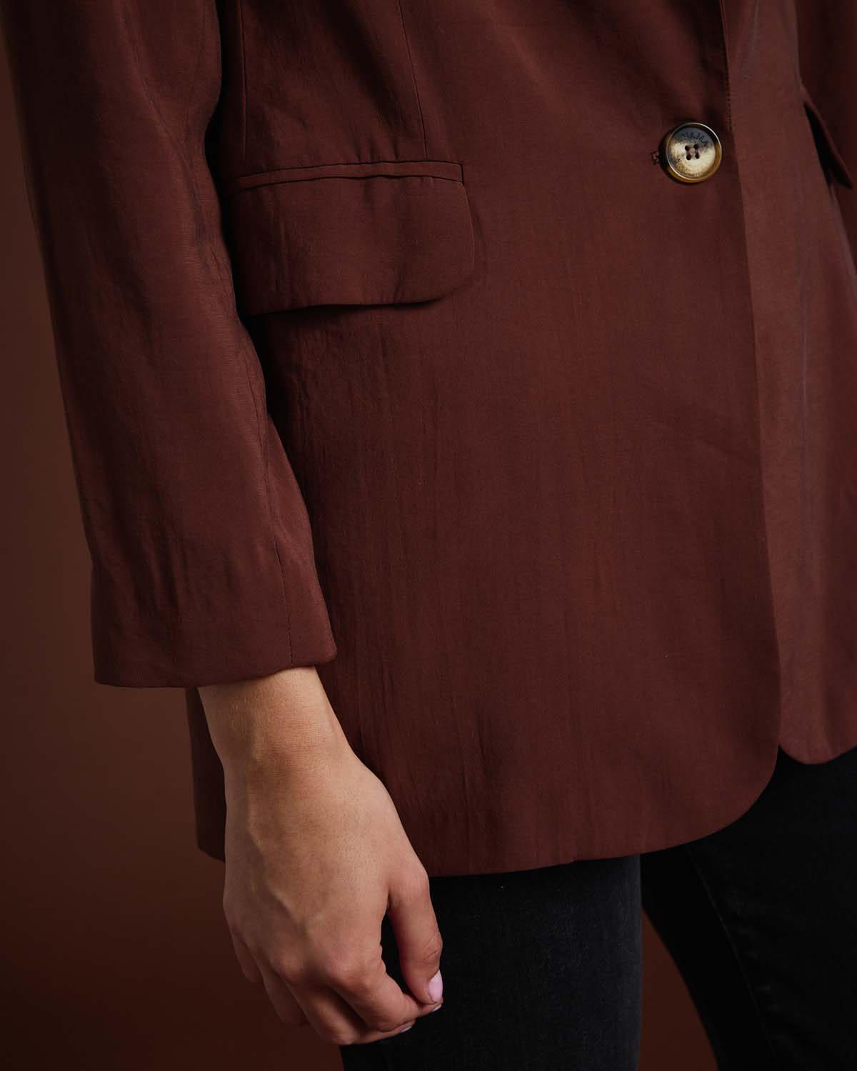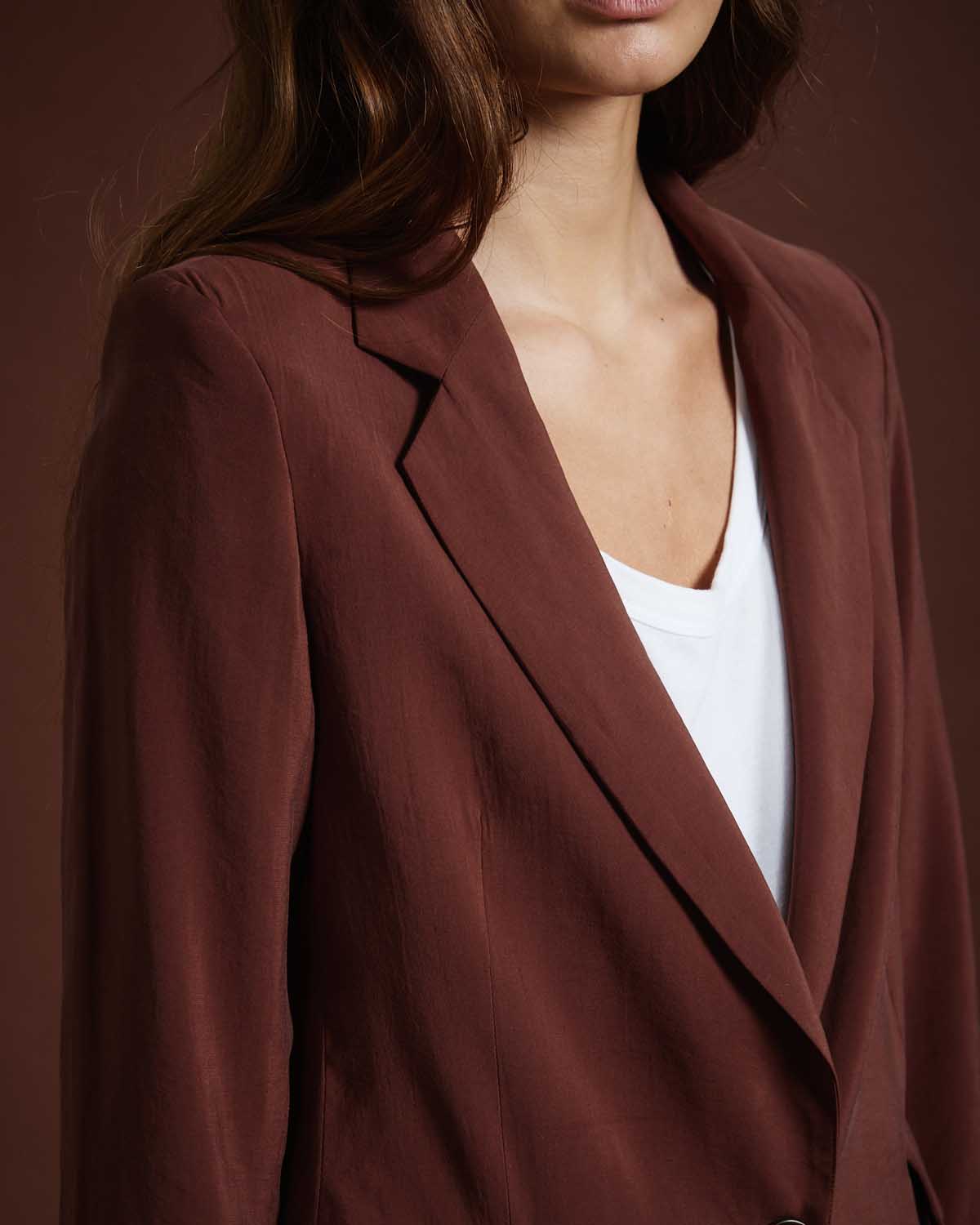 SACO SASTRERO CONFECCIONADO EN TENCEL ESTAMPADA. CON HOMBRERAS Y CRUCE FRONTAL CON ABOTONADURA SIMPLE.