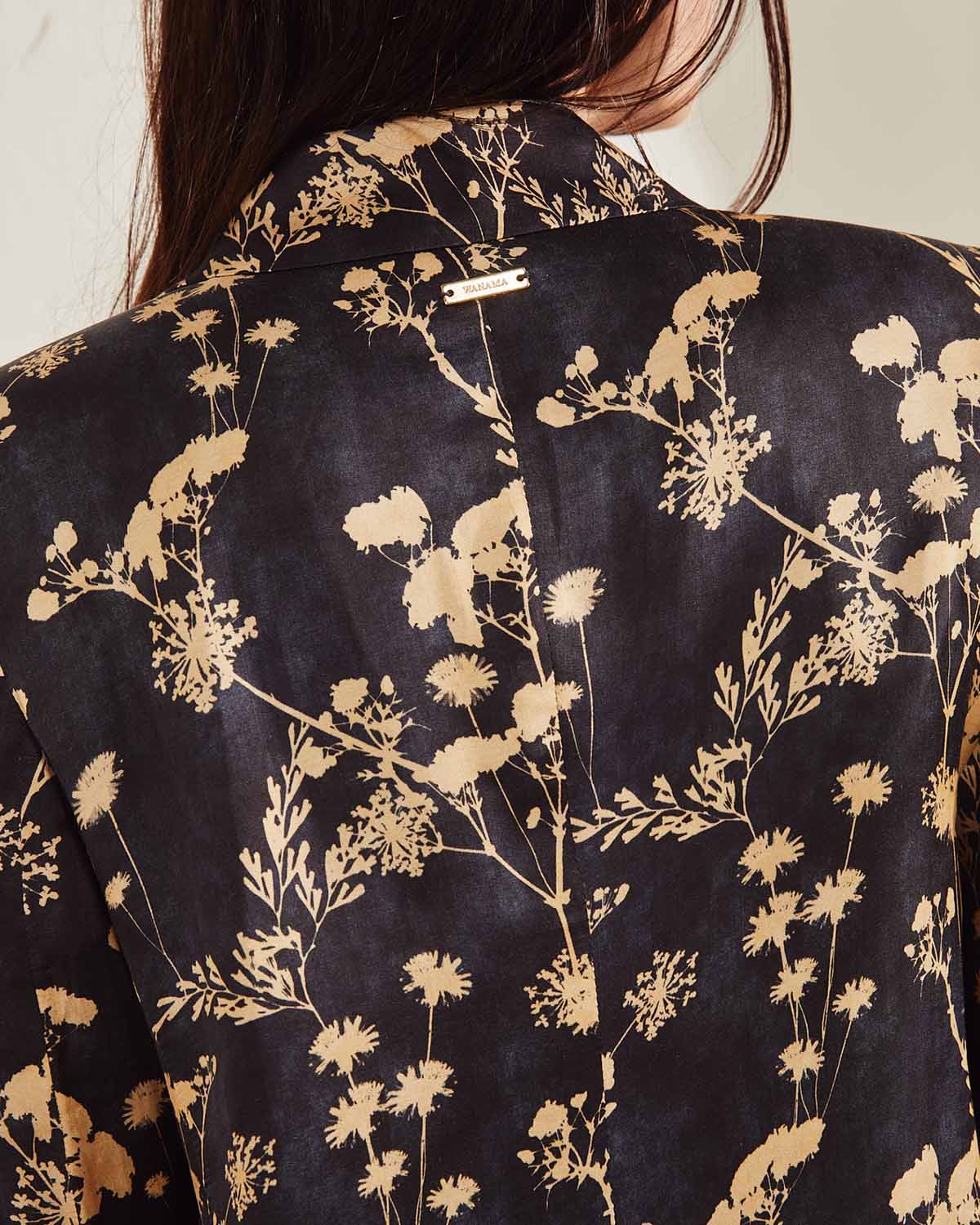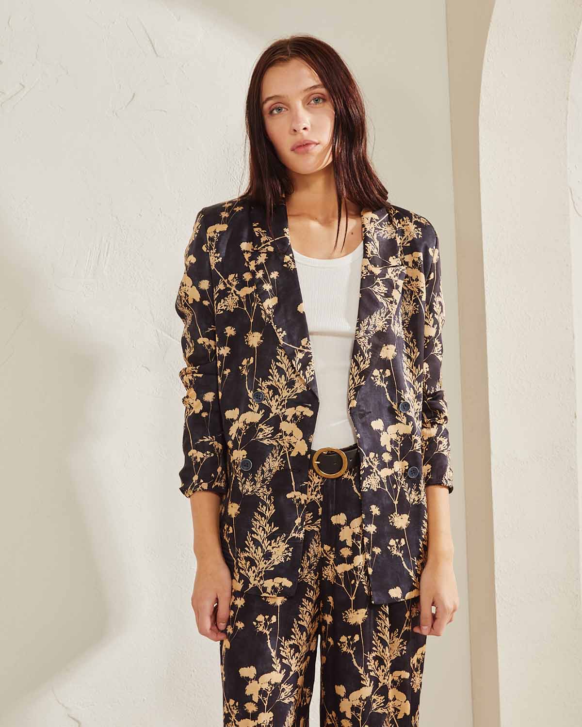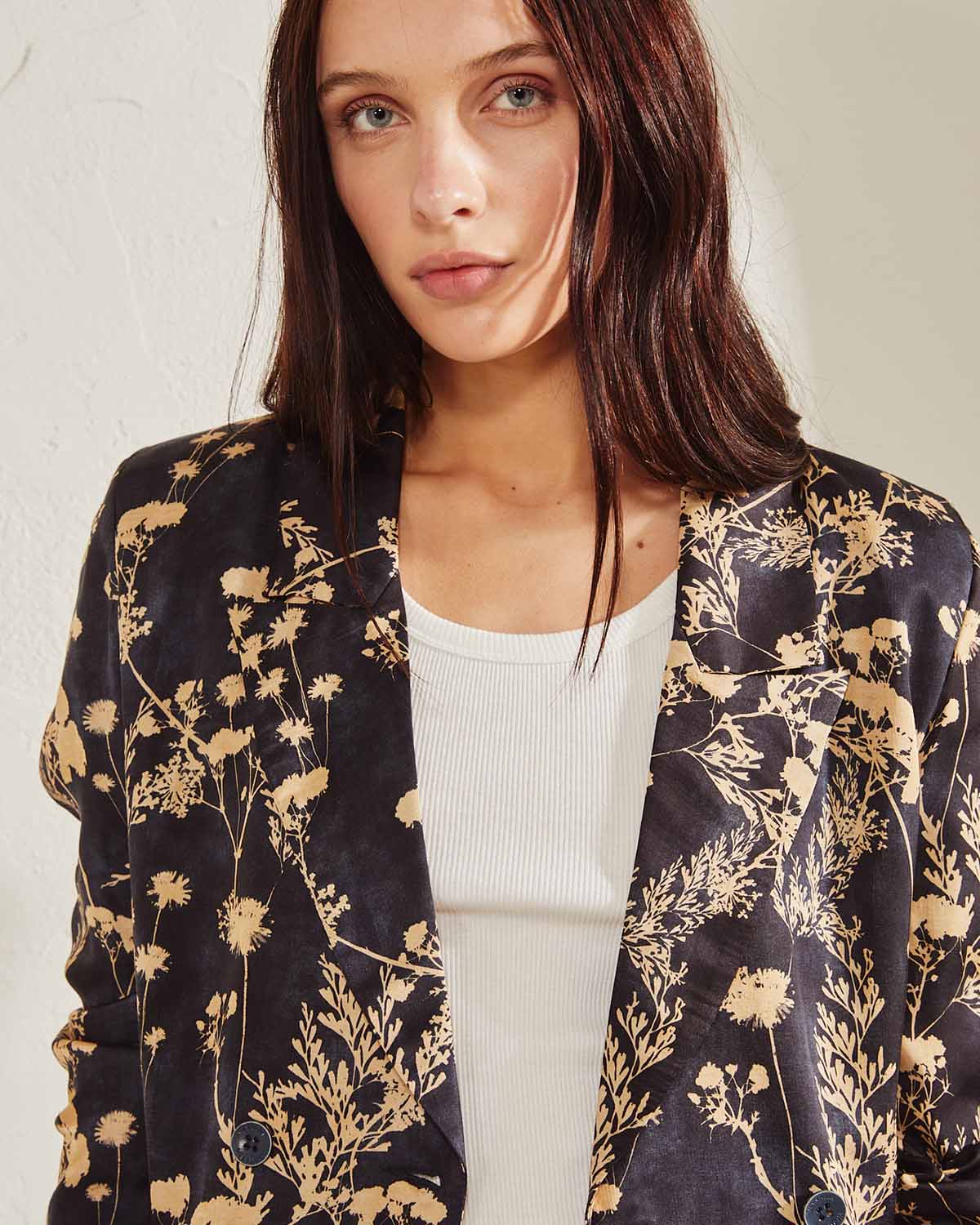 SACO CONFECCIONADO EN VISCOSA ESTAMPADA. CON SOLAPAS Y CRUCE EN EL FRENTE, DOBLE ABOTONADURA.