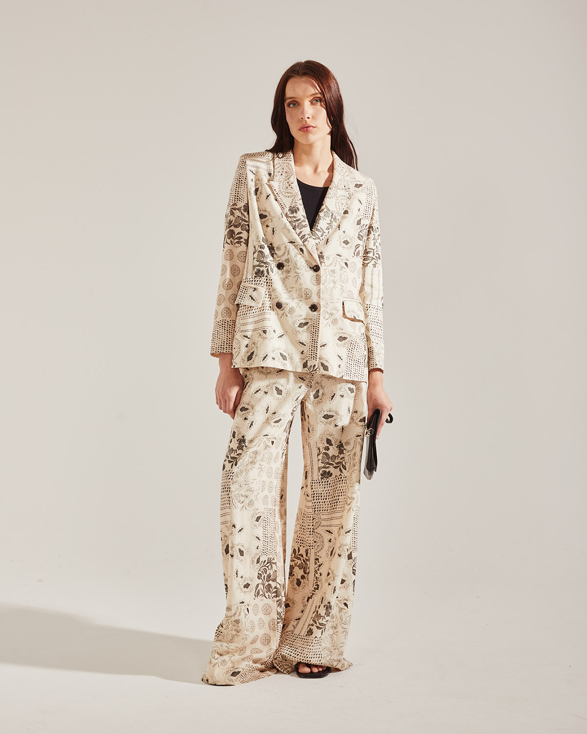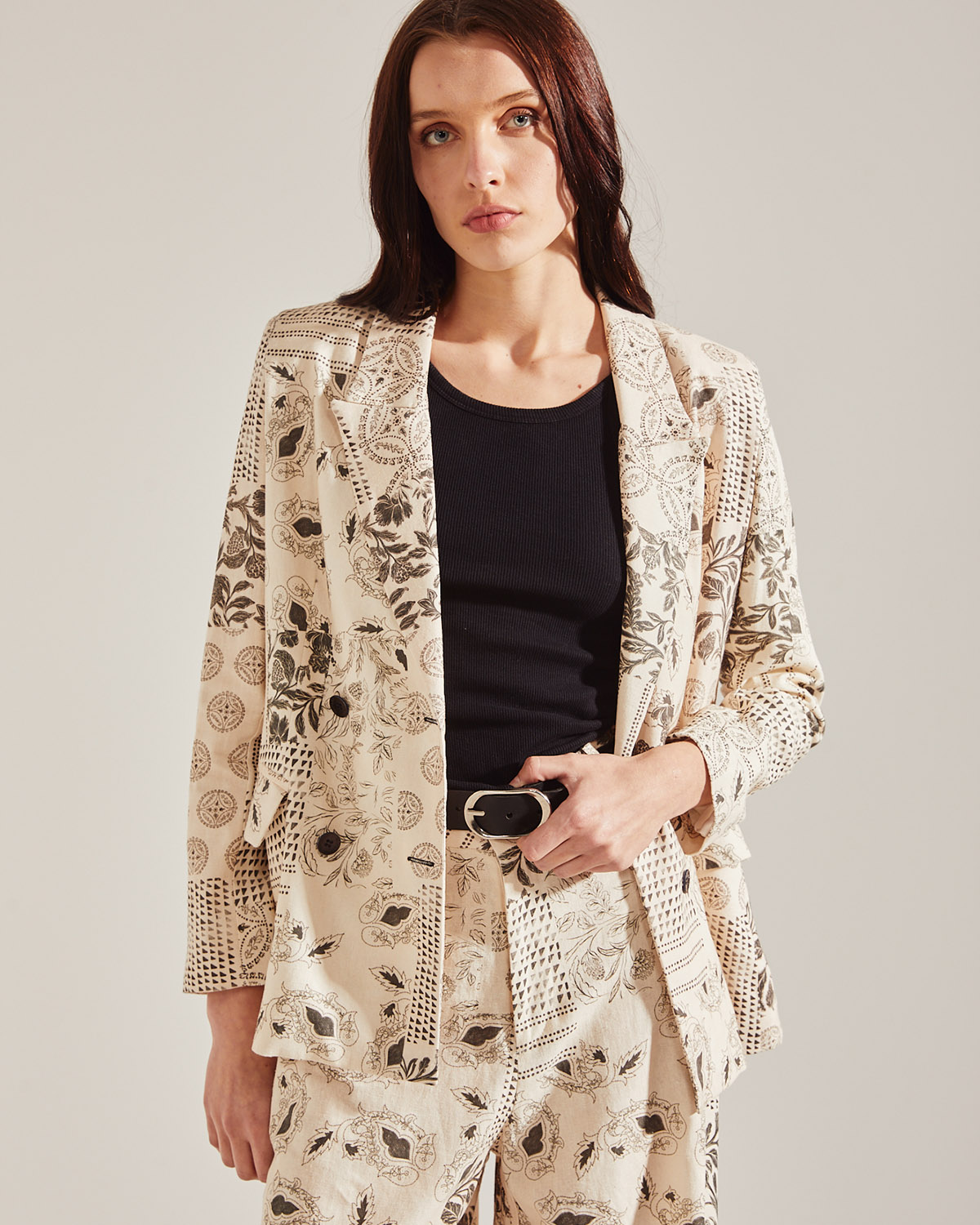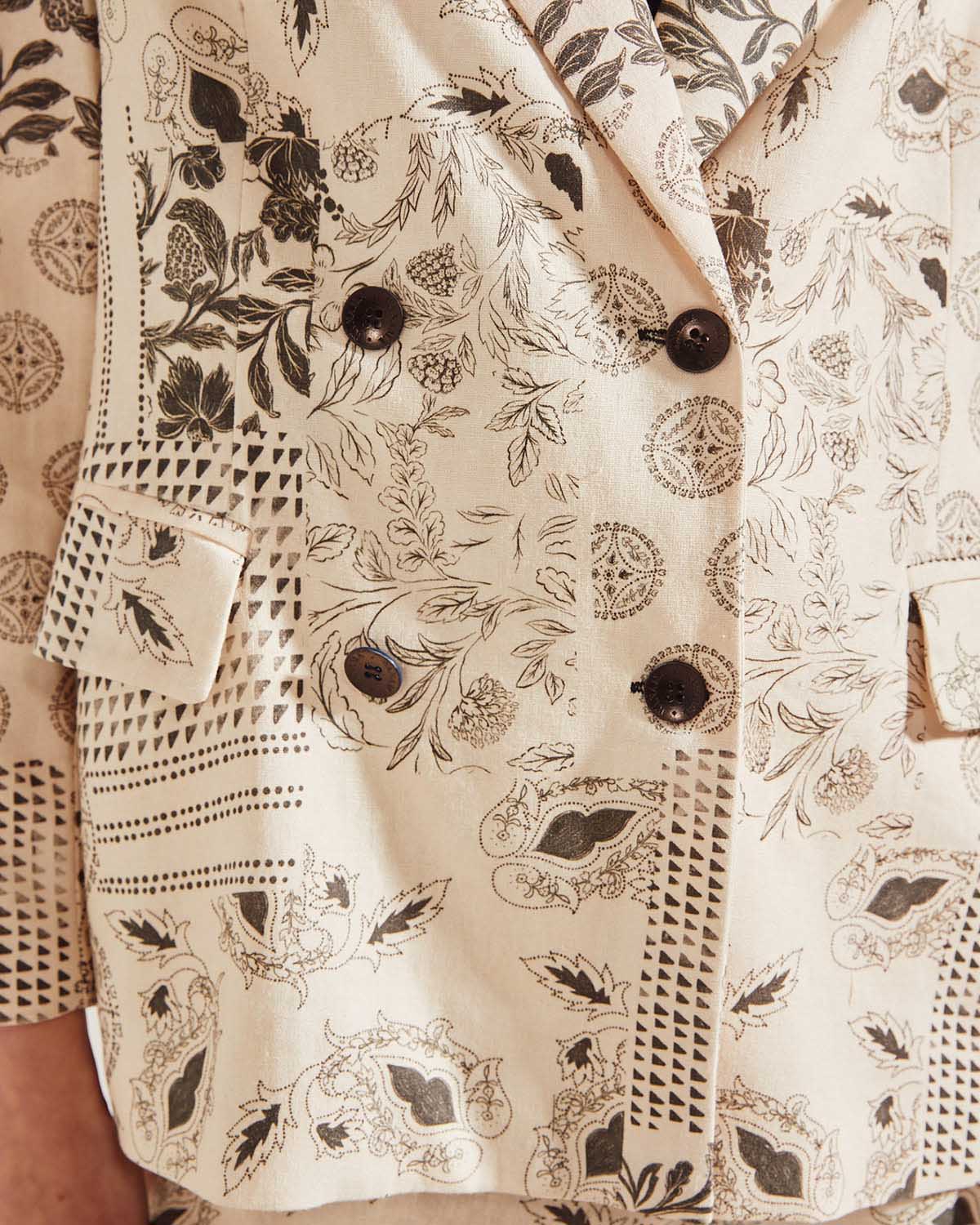 SACO CON CRUCE DELANTERO, CON HOMBRERAS CONFECCIONADO EN LINO ESTAMPADO. 4 BOTONES EN DELANTERO Y BOLSILLOS OJALES CON SOLAPAS.