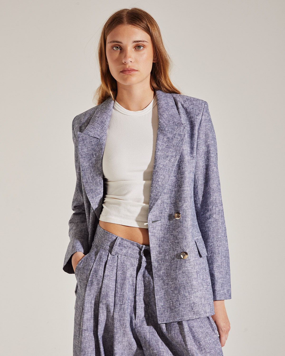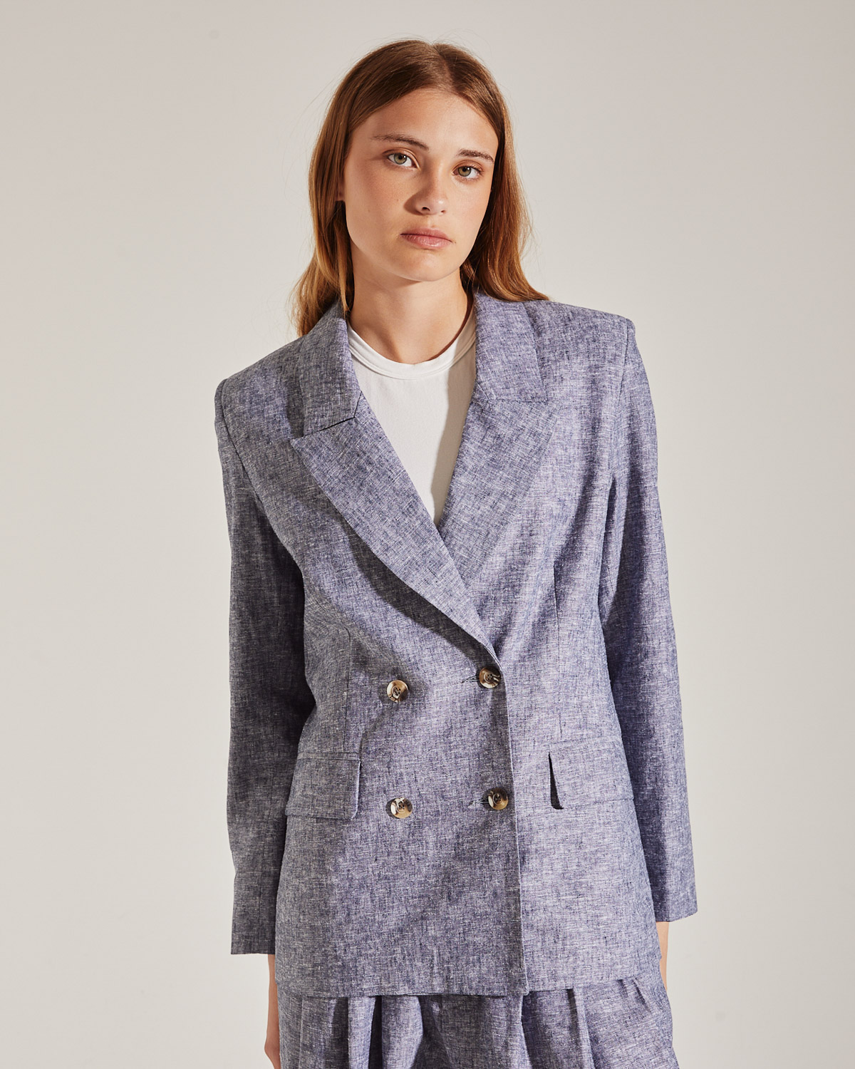 SACO CRUZADO CON HOMBRERAS. CONFECCIONADO EN LINO. 4 BOTONES EN DELANTERO Y BOLSILLOS CON SOLAPAS.
