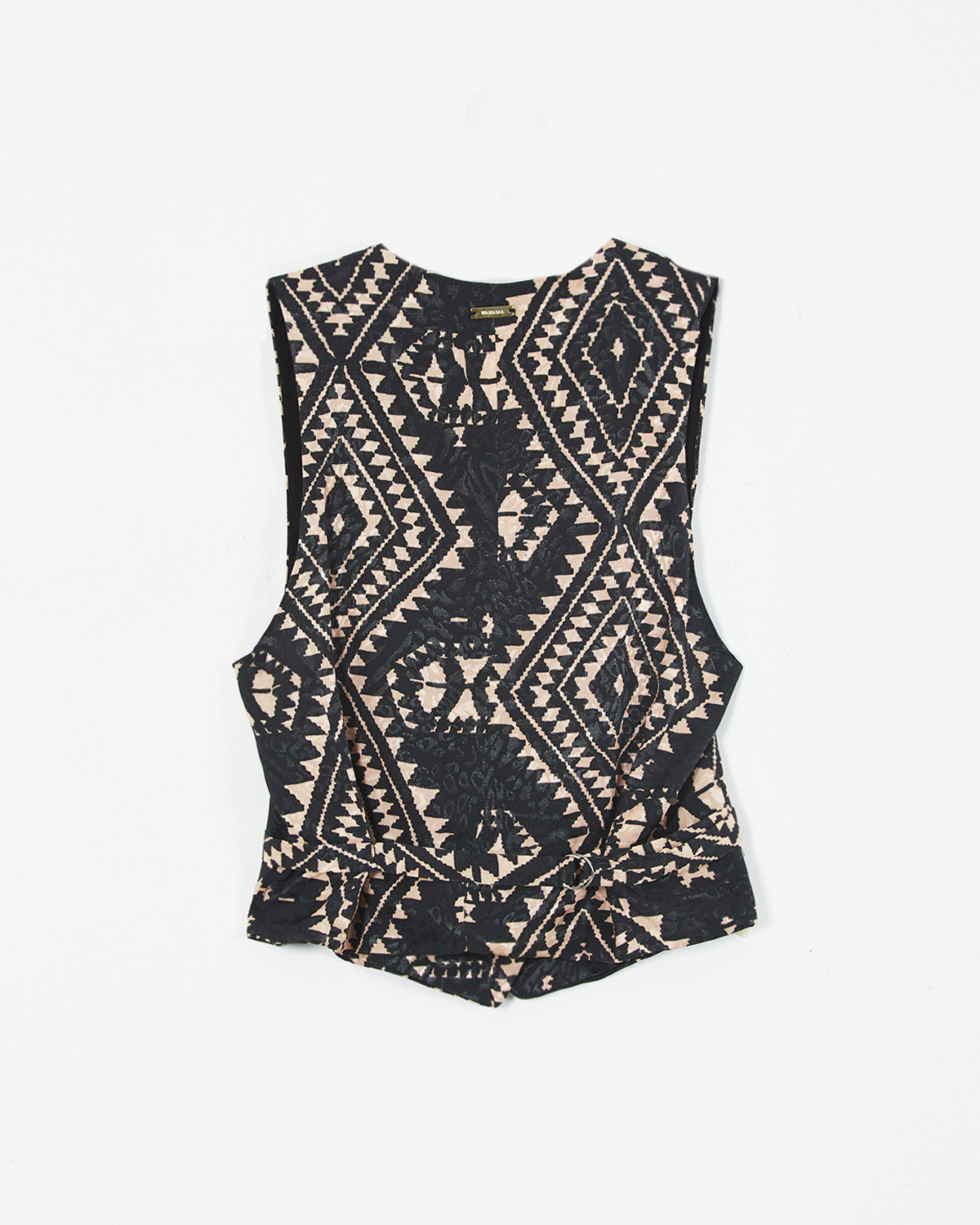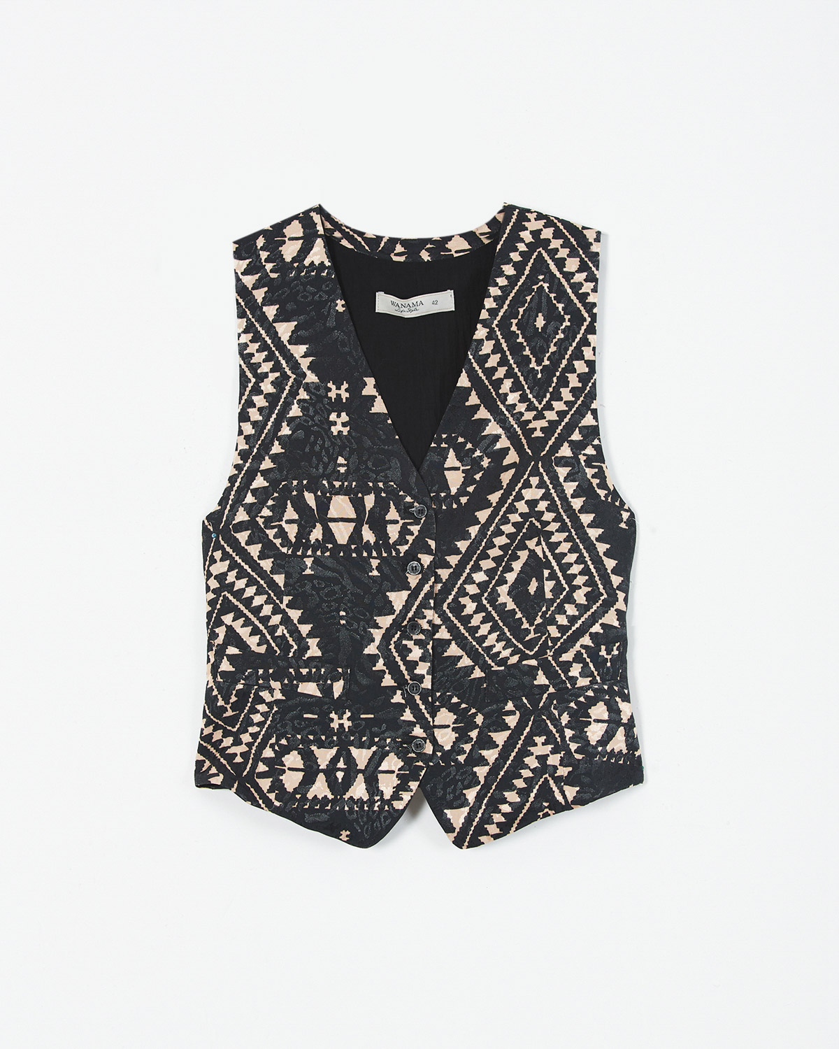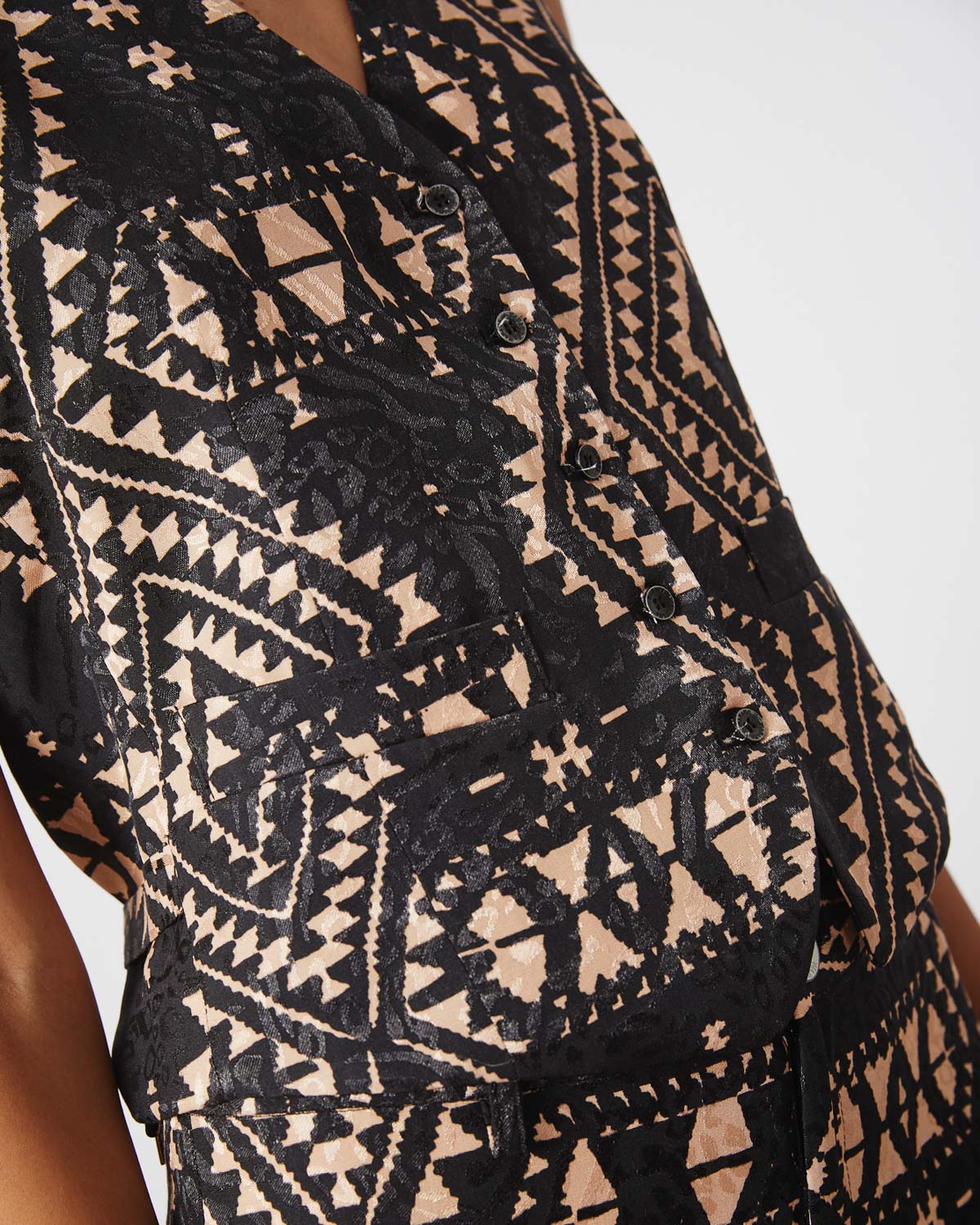 CHALECO CONFECCIONADO EN VISCOSA ESTAMPADA. CALCE AL CUERPO . CARTERA CON BOTONES METALICOS.