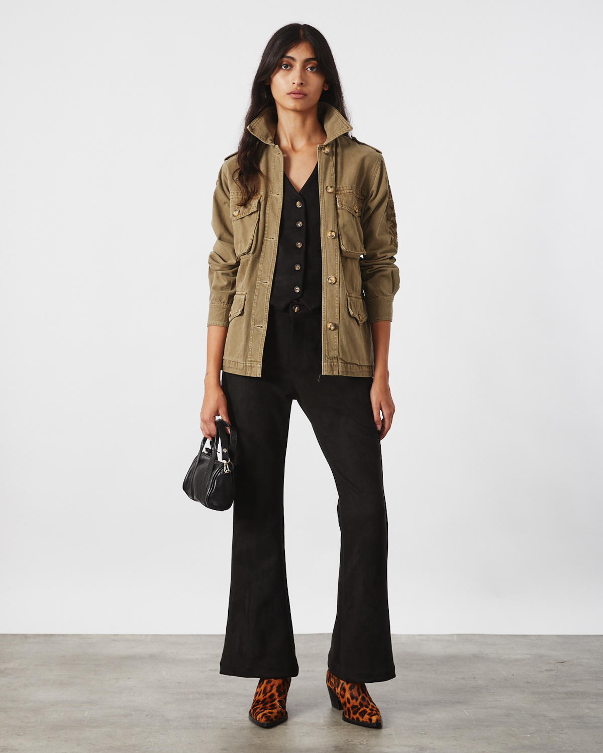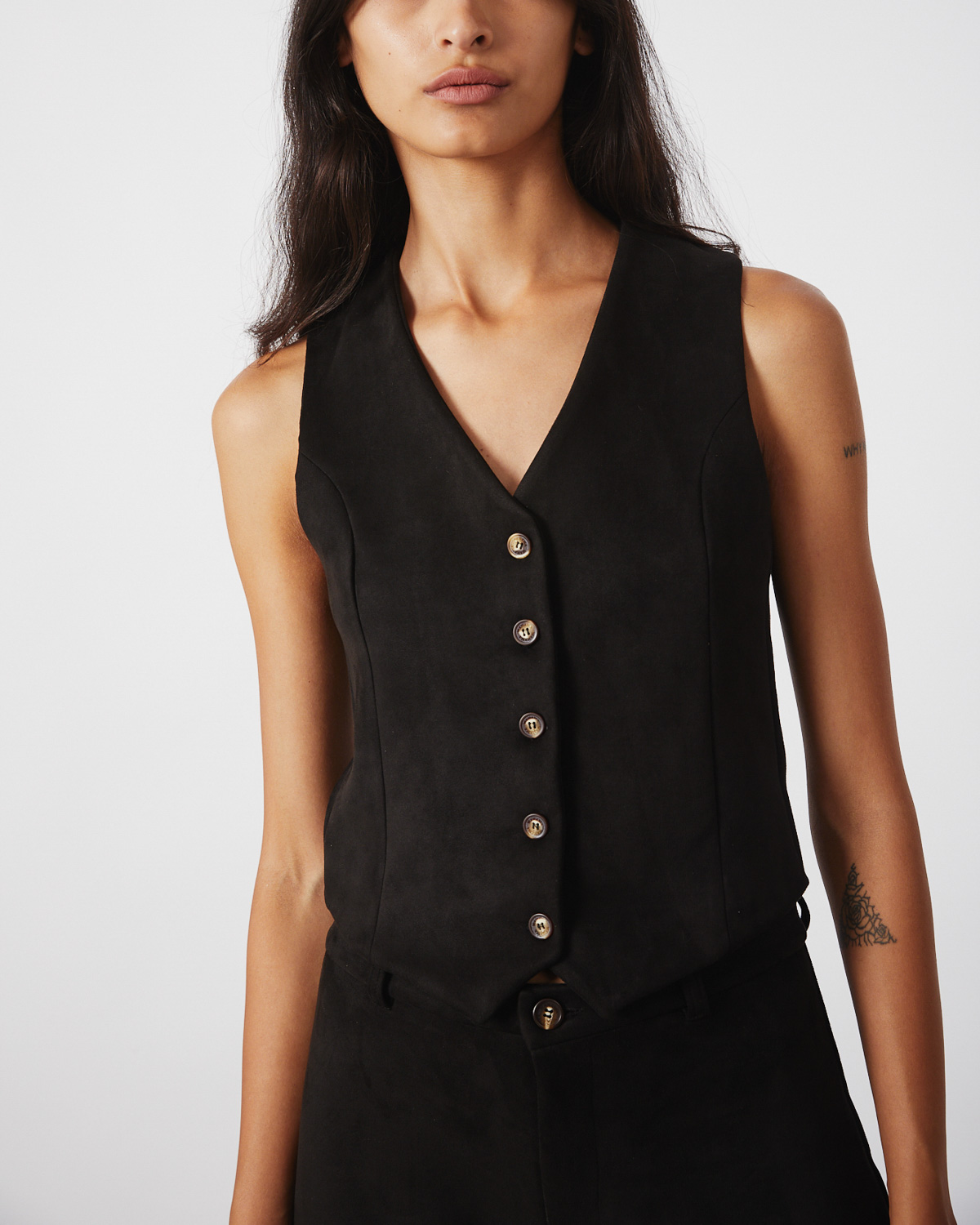 CHALECO CONFECCIONADO EN SUEDE. CON BOTONES EN EL FRENTE Y CHAPITA DE MARCA EN ESPALDA.
