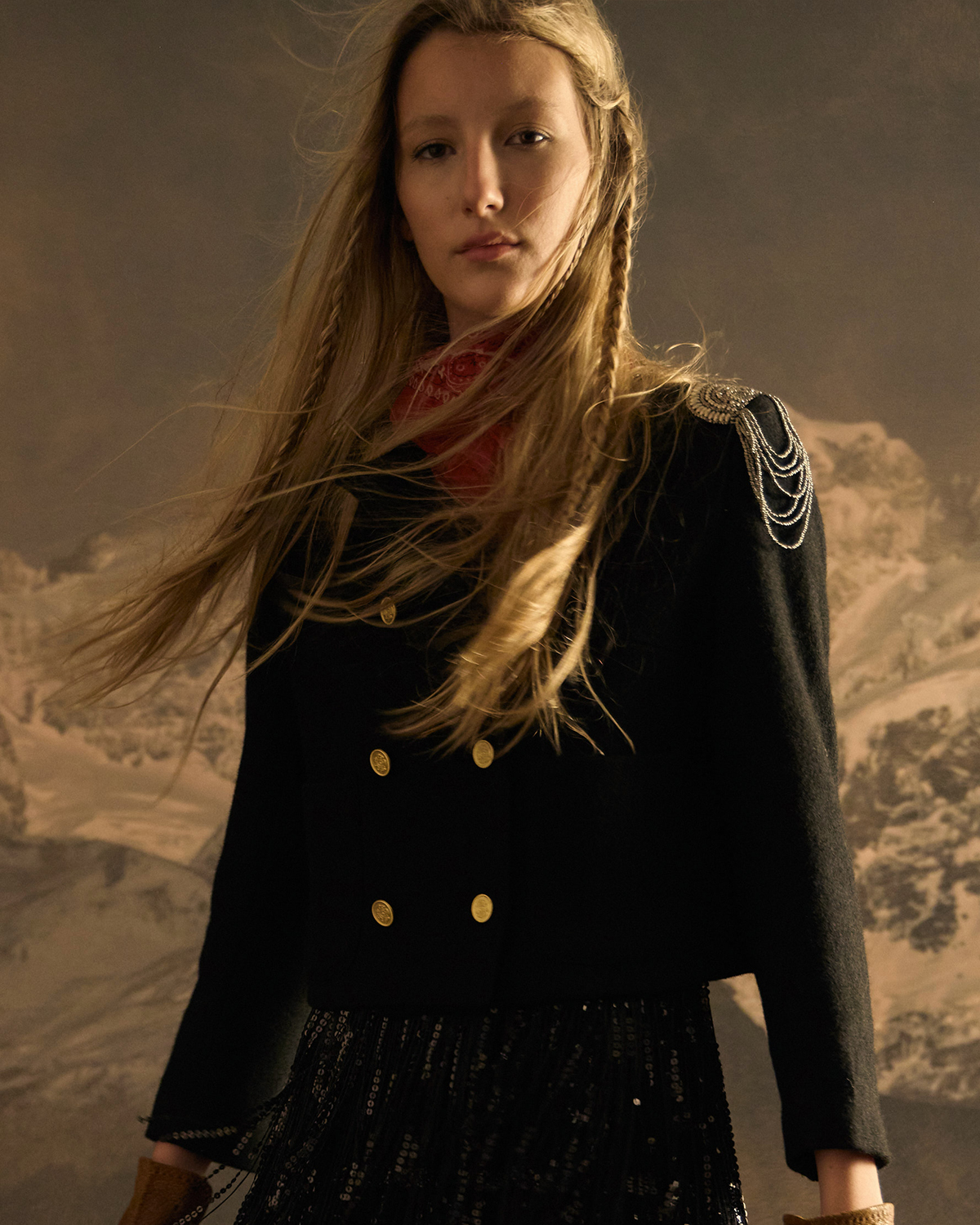 CHANEL CONFECCIONADO EN PAÑO CON HOMBRERAS Y CHARRETERAS, CON 8 BOTONES EN DELANTERO, CON BOLSILLO.