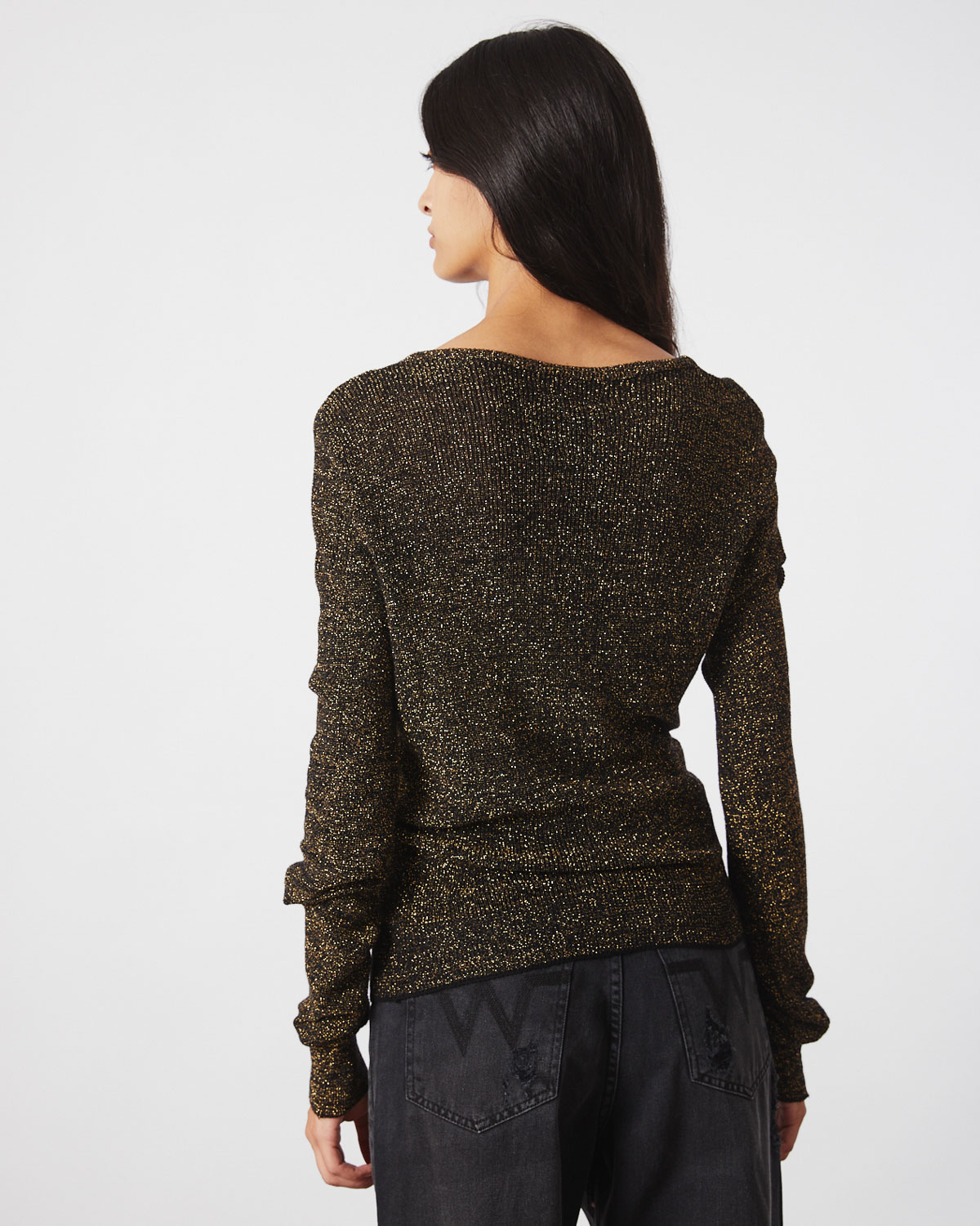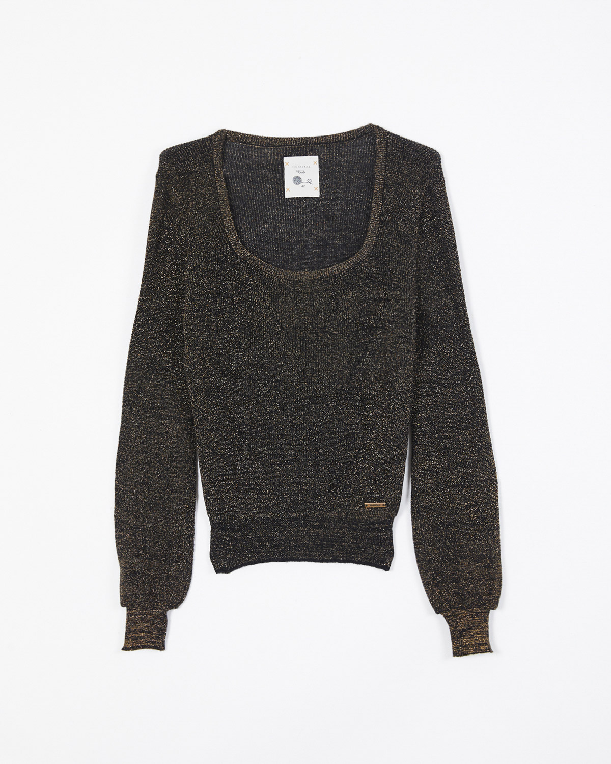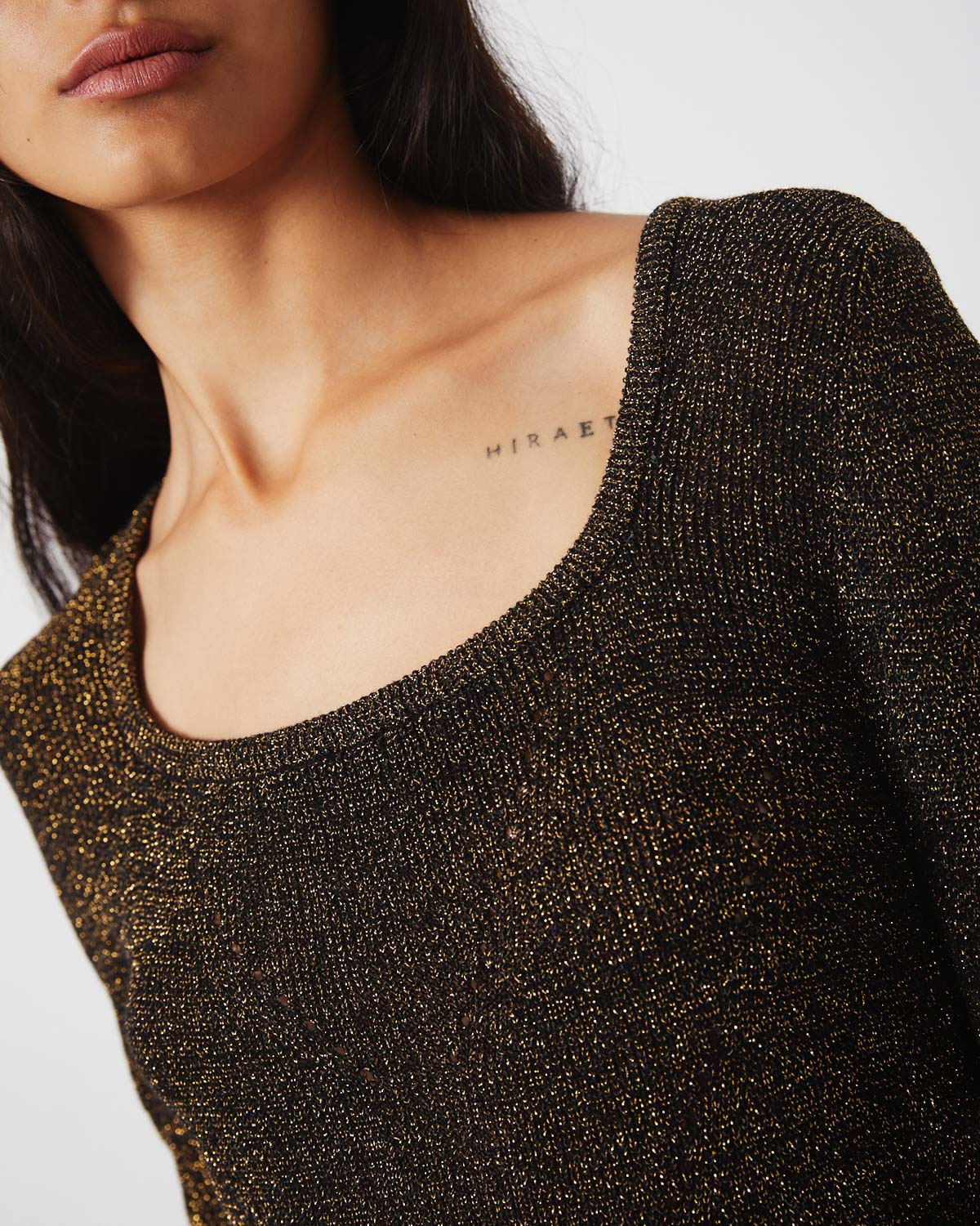 SWEATER DE ALGODON Y LUREX CON MANGAS BALLOON Y ESCOTE CUADRADO.