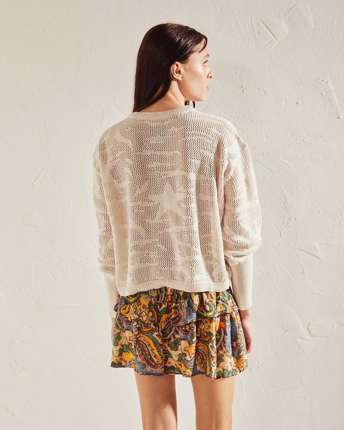 SWEATER DESAGUJADO, DE CALCE HOLADO, LARGO A LA PRIMERA CADERA. CON PUÑOS LARGOS .