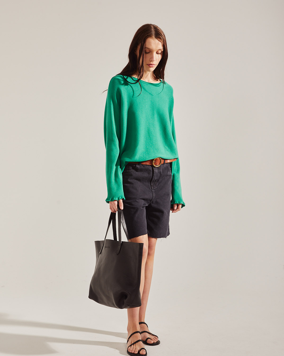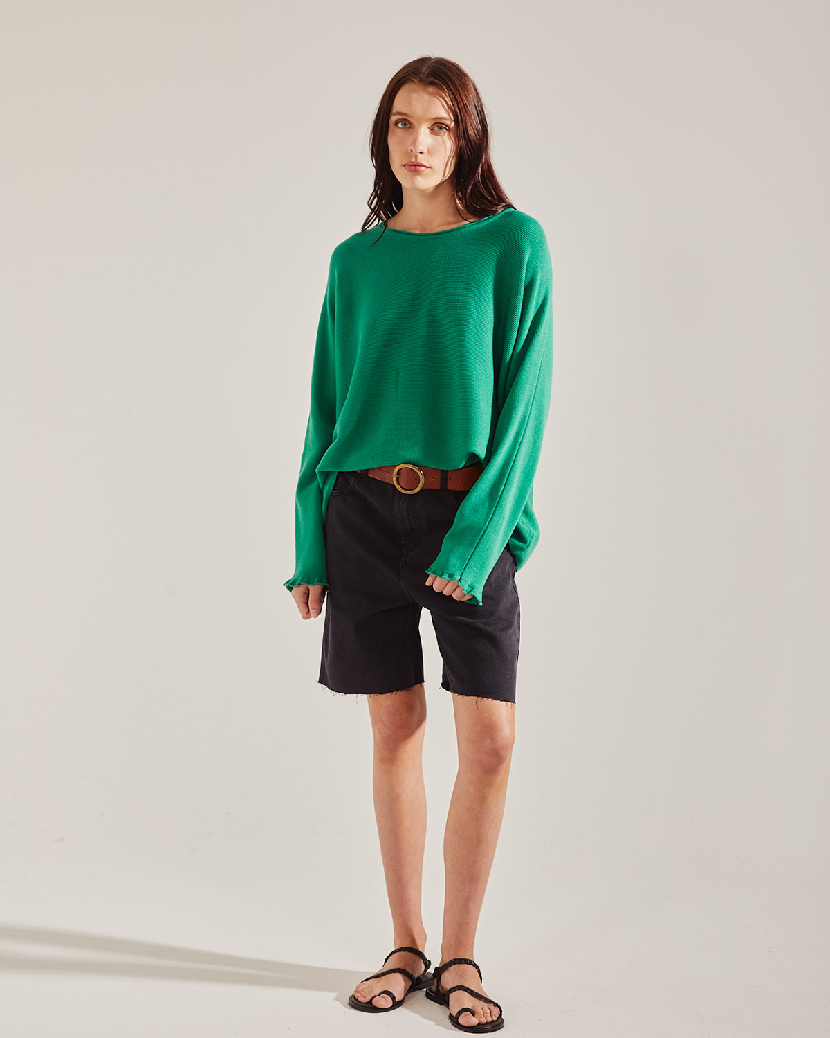 SWEATER LIVIANO , TEJIDO DE FORMA HORIZONAL, SIN COSTURA EN SISAS, DE CALCE HOLGADO LARGO A LA PRIMER CADERA. CONFECCIONADO EN ALGODON , TEÑIDO A COLOR
