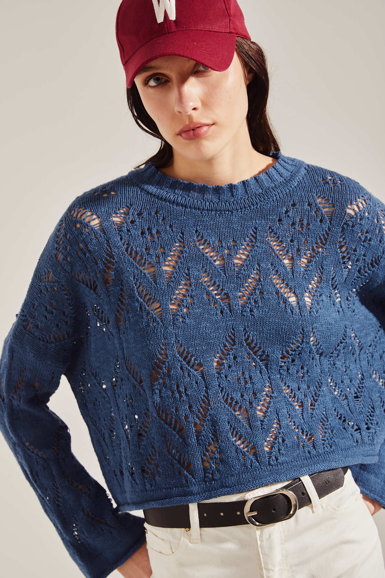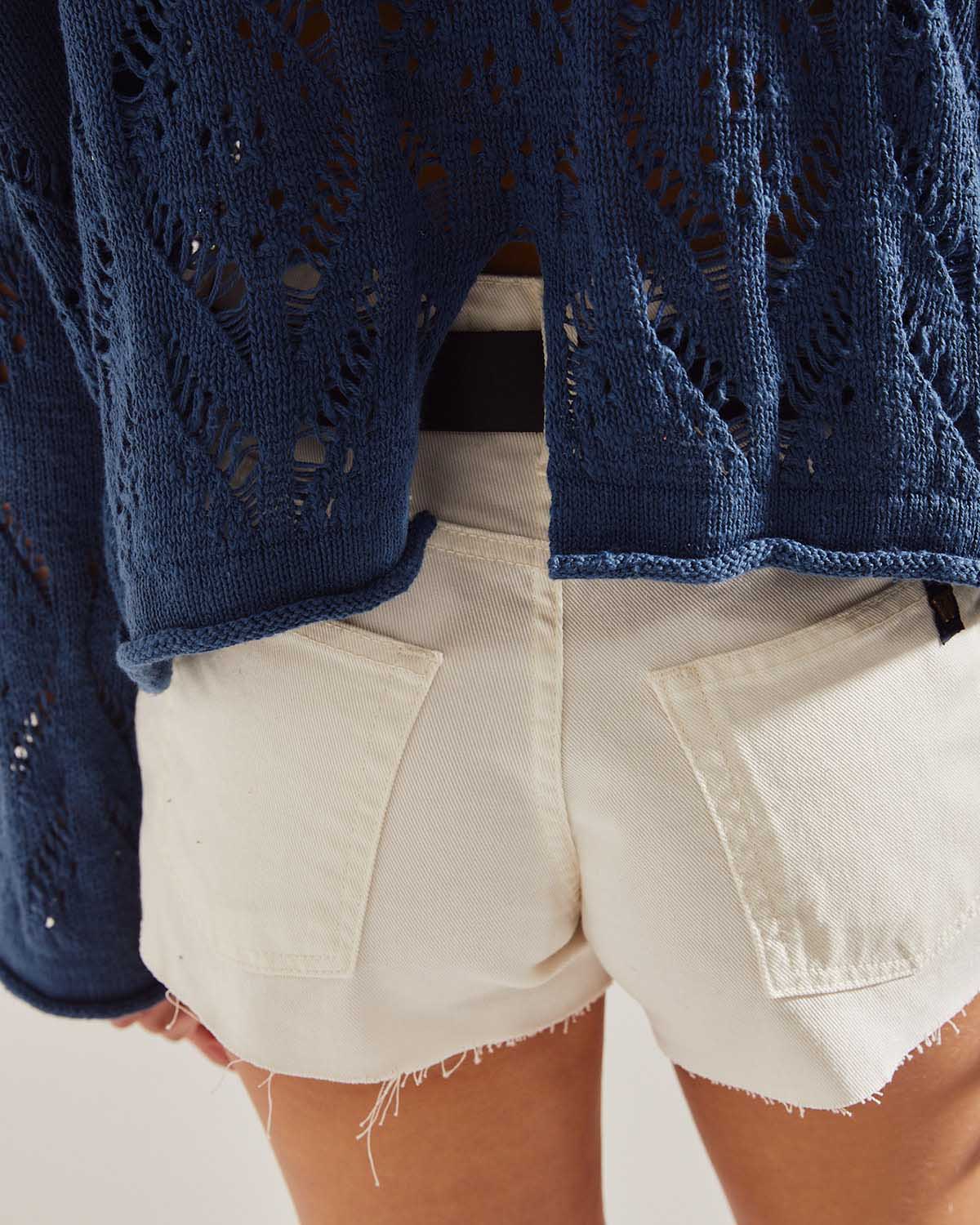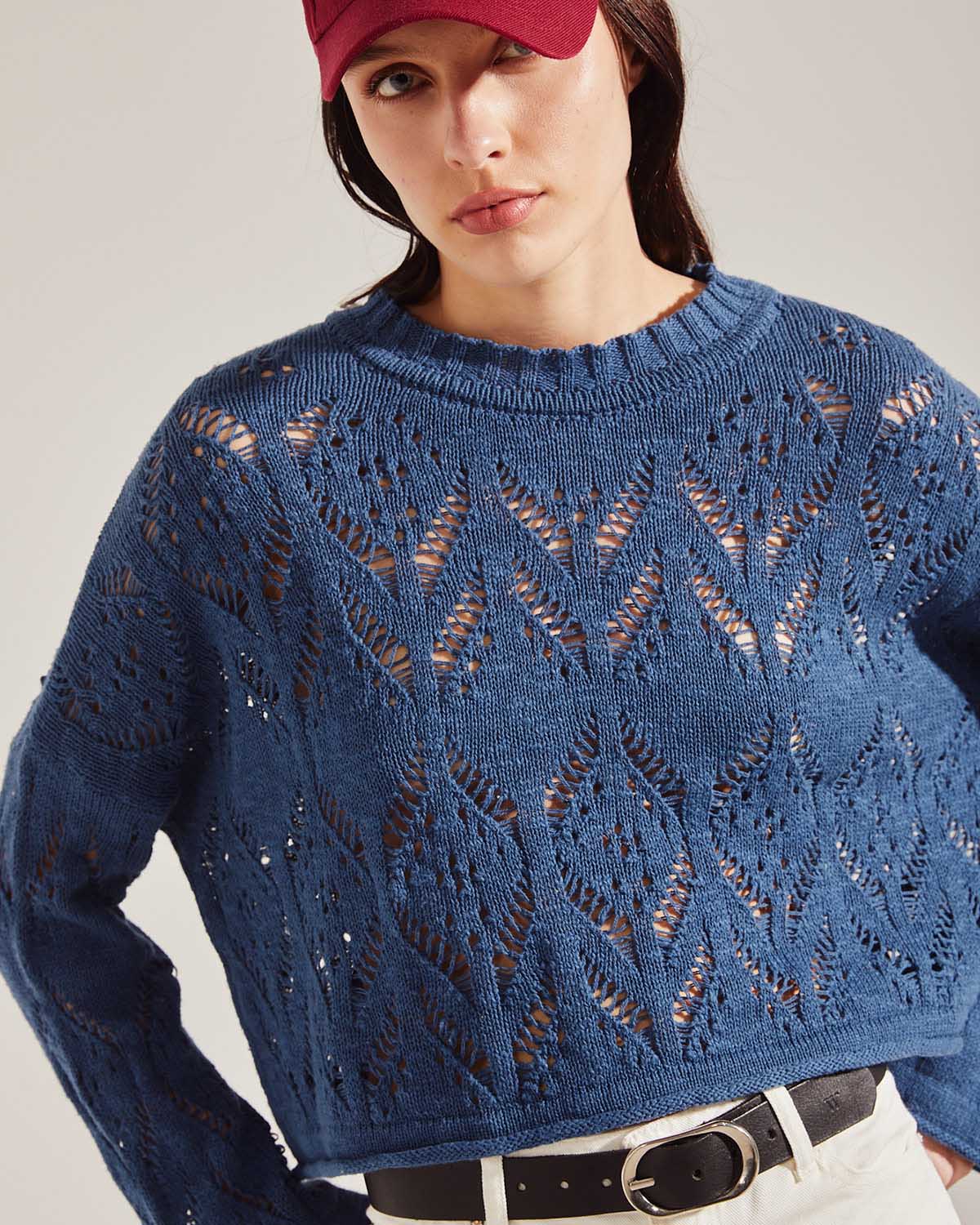 SWEATER CON MANGAS SEMI OXFORD, CON CARLA HOLGADO, CUELLO REDONDO LARGO A LA CADERA.