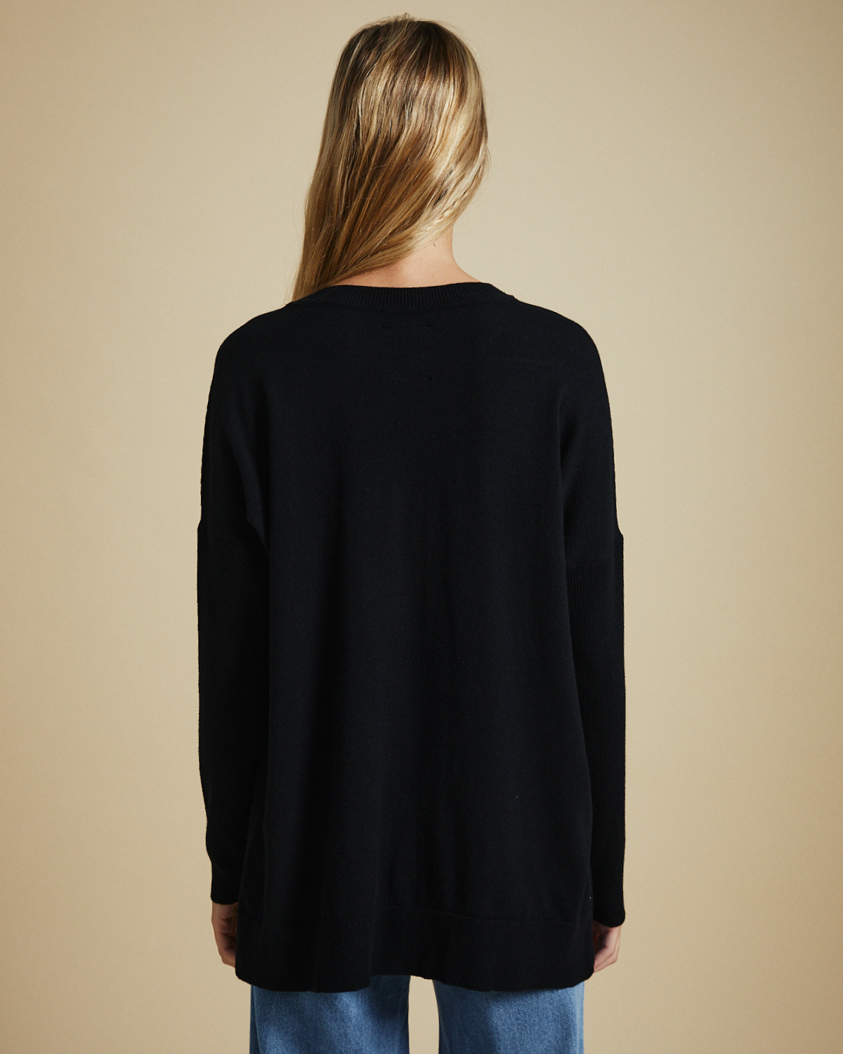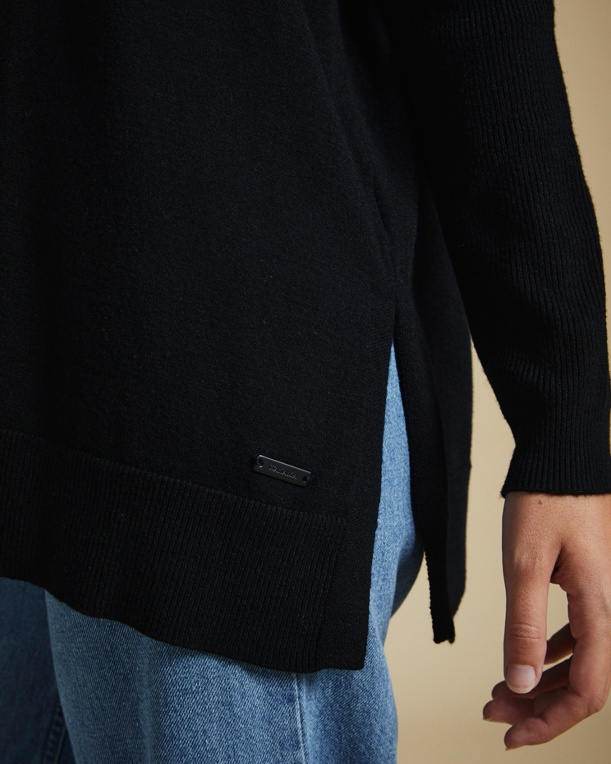 SWEATER TEJIDO CON CUELLO REDONDO, MANGAS AJUSTADAS Y CALCE RECTO. TAJOS LATERALES Y LARGO A LA CADERA.