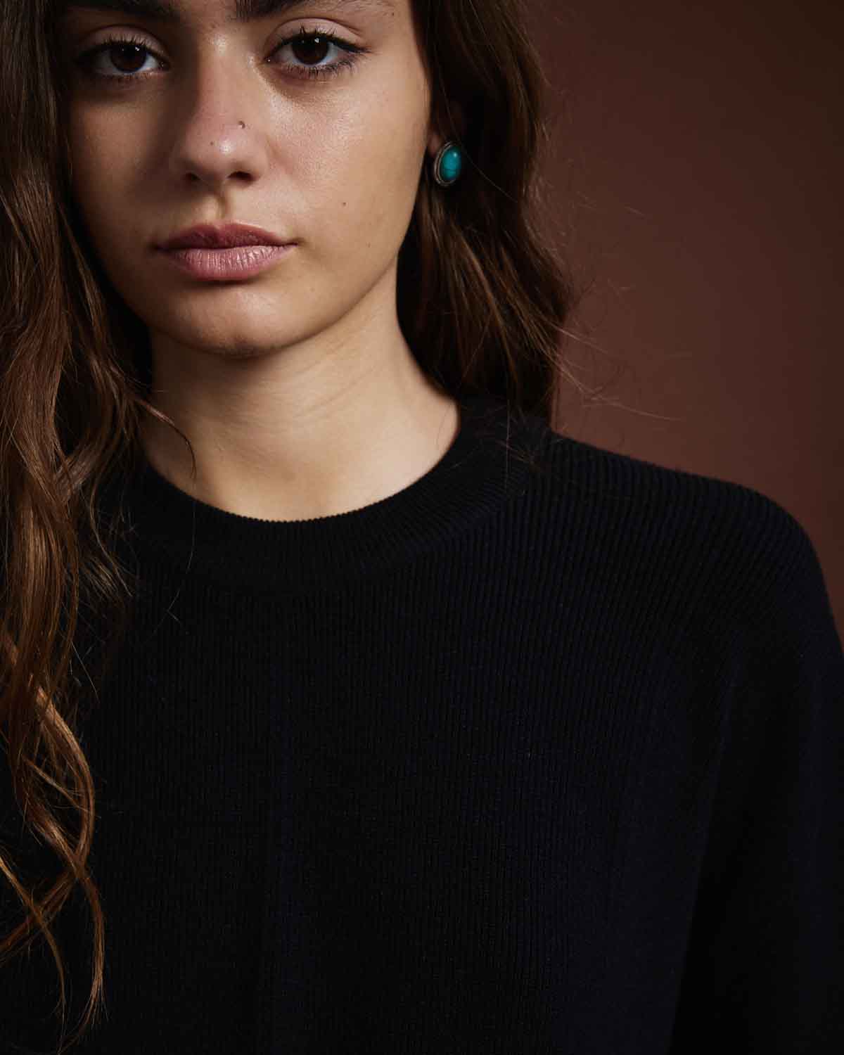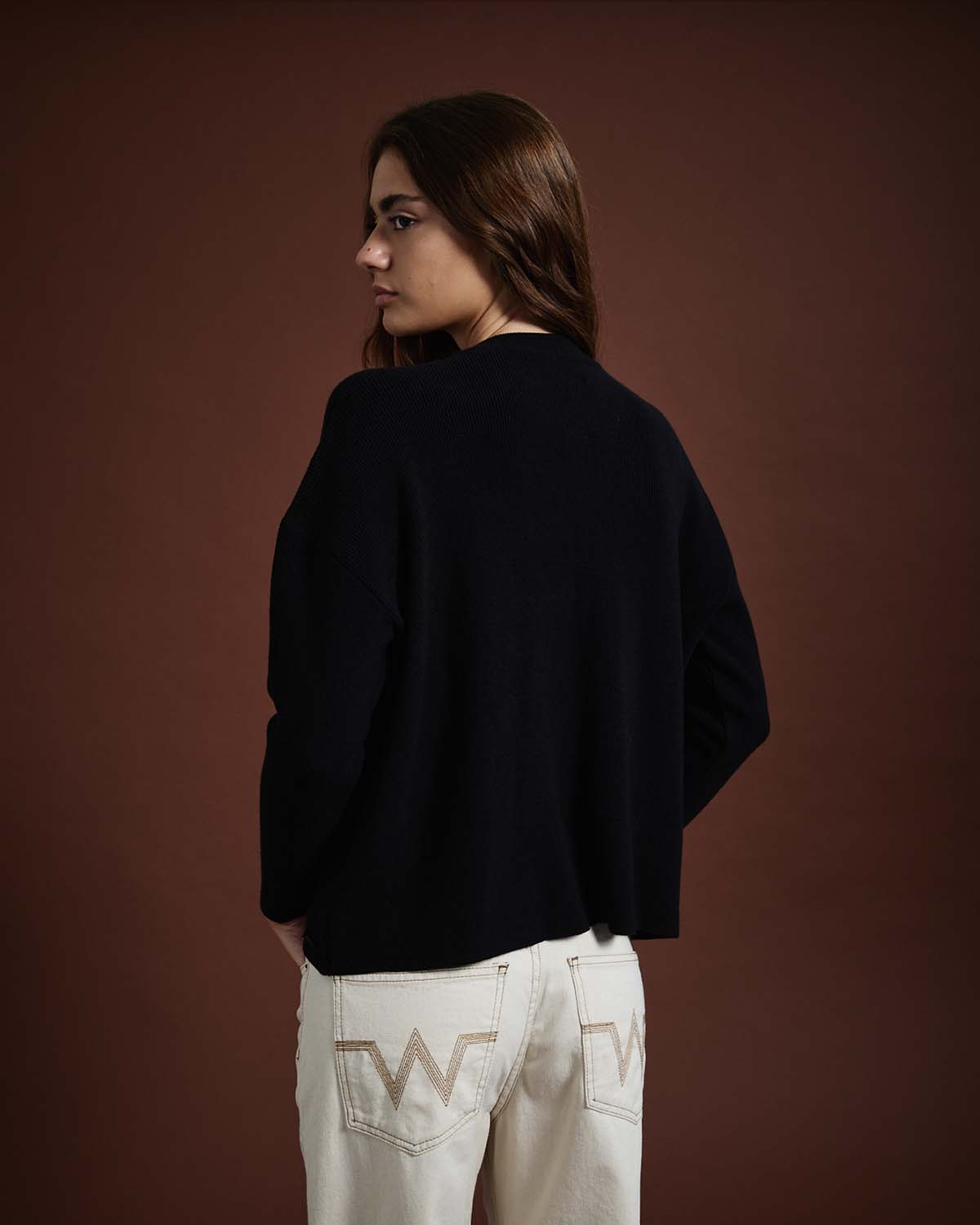 SWEATER DE CUELLO REDONDO, LARGO HASTA LA CADERA, CON HOMBRO CAIDO Y MANGAS AJUSTADAS.