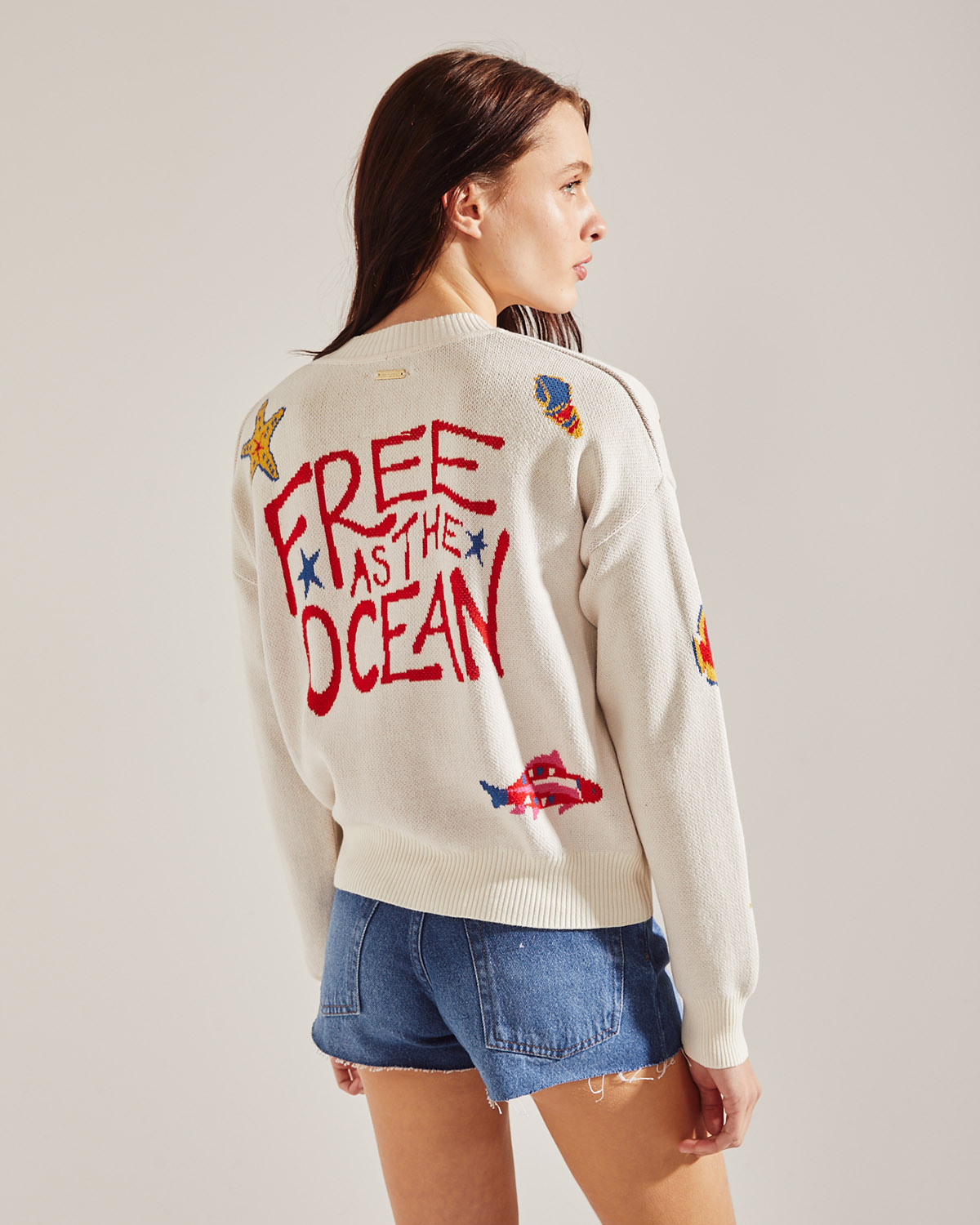 CARDIGAN EN JACARD , DE BASE CRUDA CON DIBUJO MARINO.