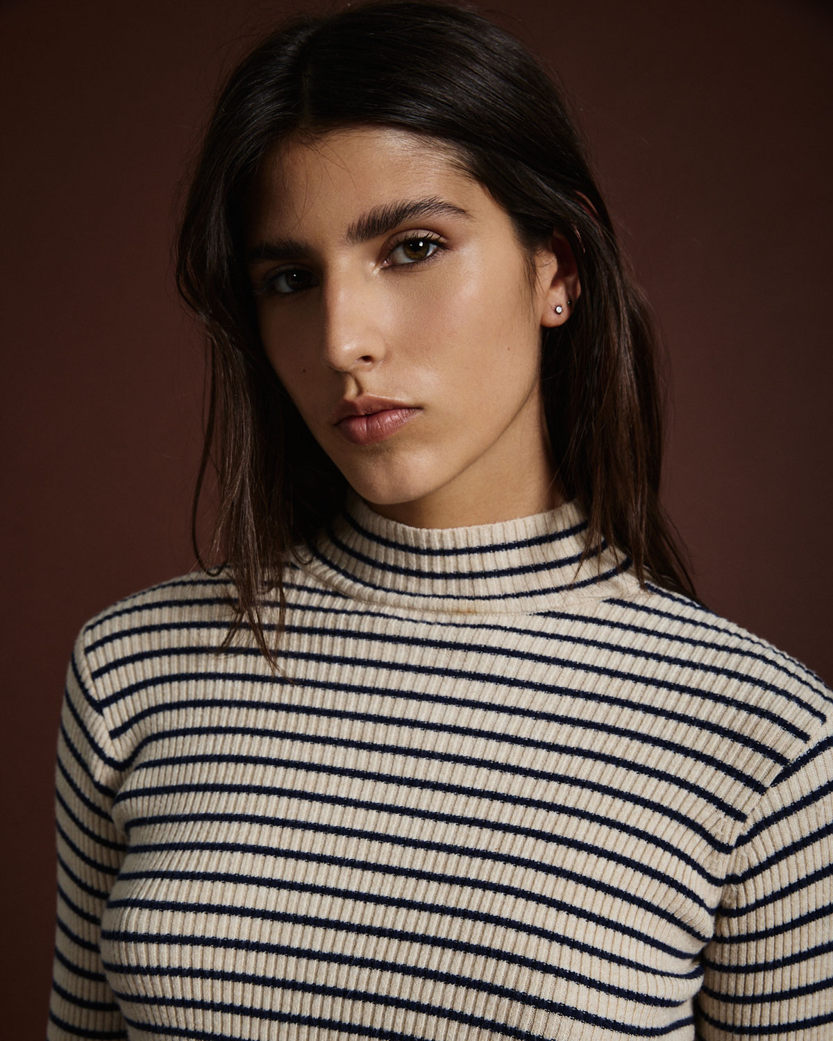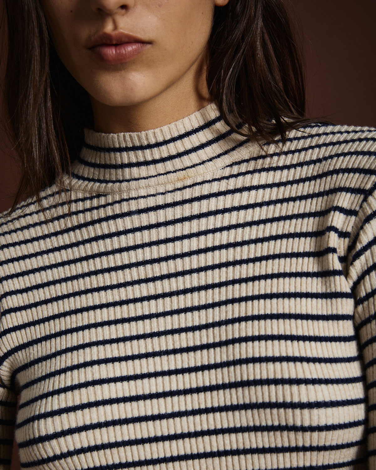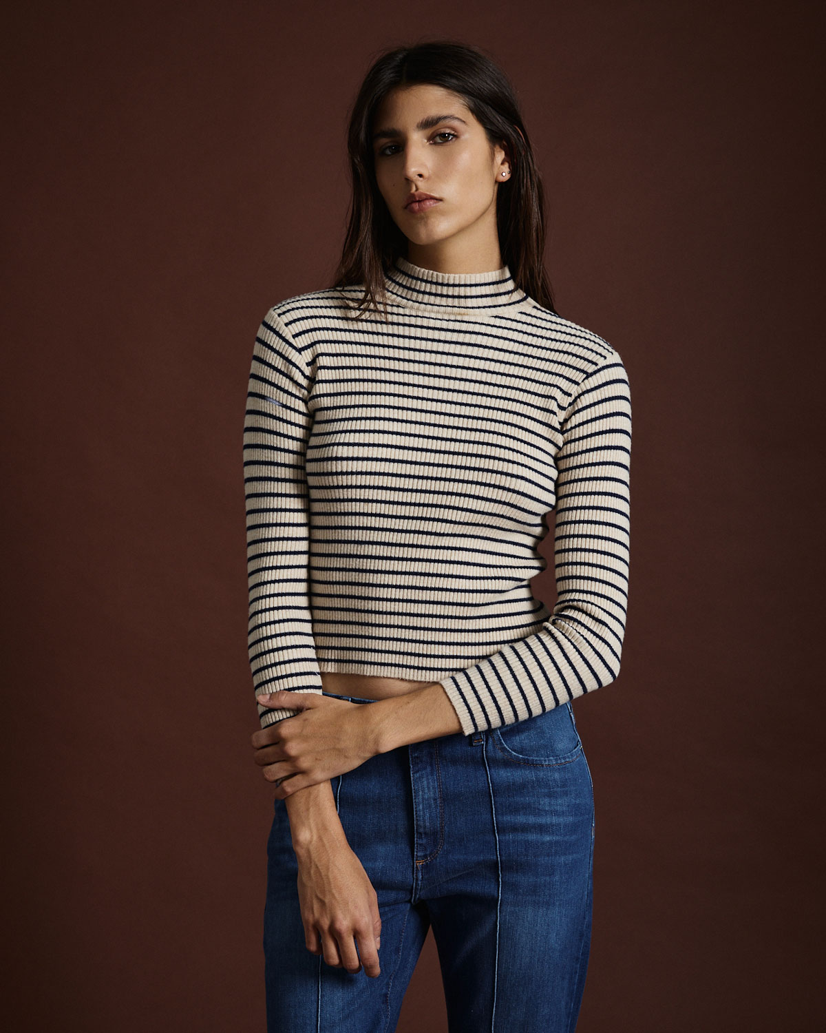 Polera confeccionada en punto jersey con diseño rayado, que combina elegancia y comodidad. Confeccionada en un tejido suave y abrigado, presenta cuello alto con terminación acanalada y mangas largas que aportan un calce confortable. Su si