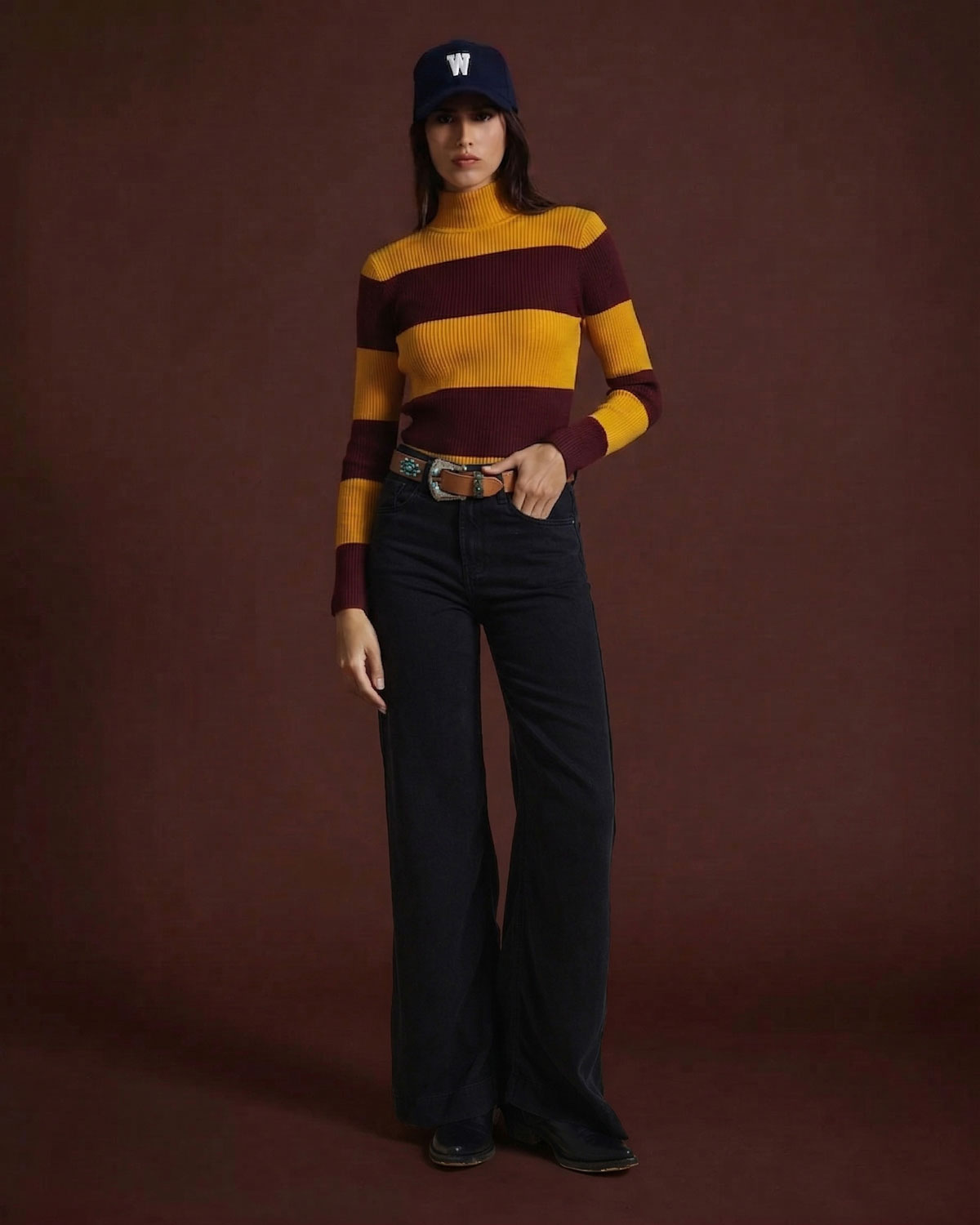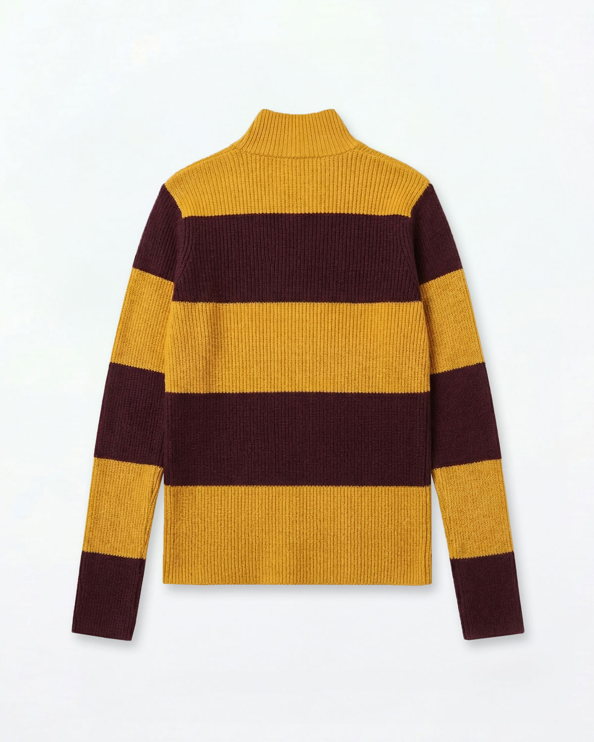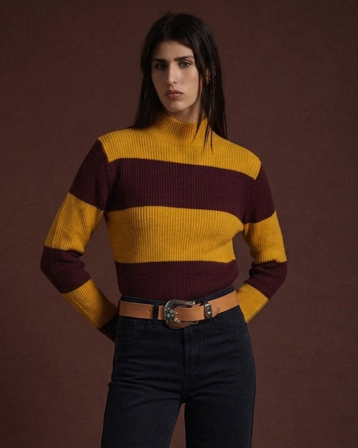 Polera confeccionada en punto jersey con diseño rayado, que combina elegancia y comodidad. Confeccionada en un tejido suave y abrigado, presenta cuello alto con terminación acanalada y mangas largas que aportan un calce confortable. Su si