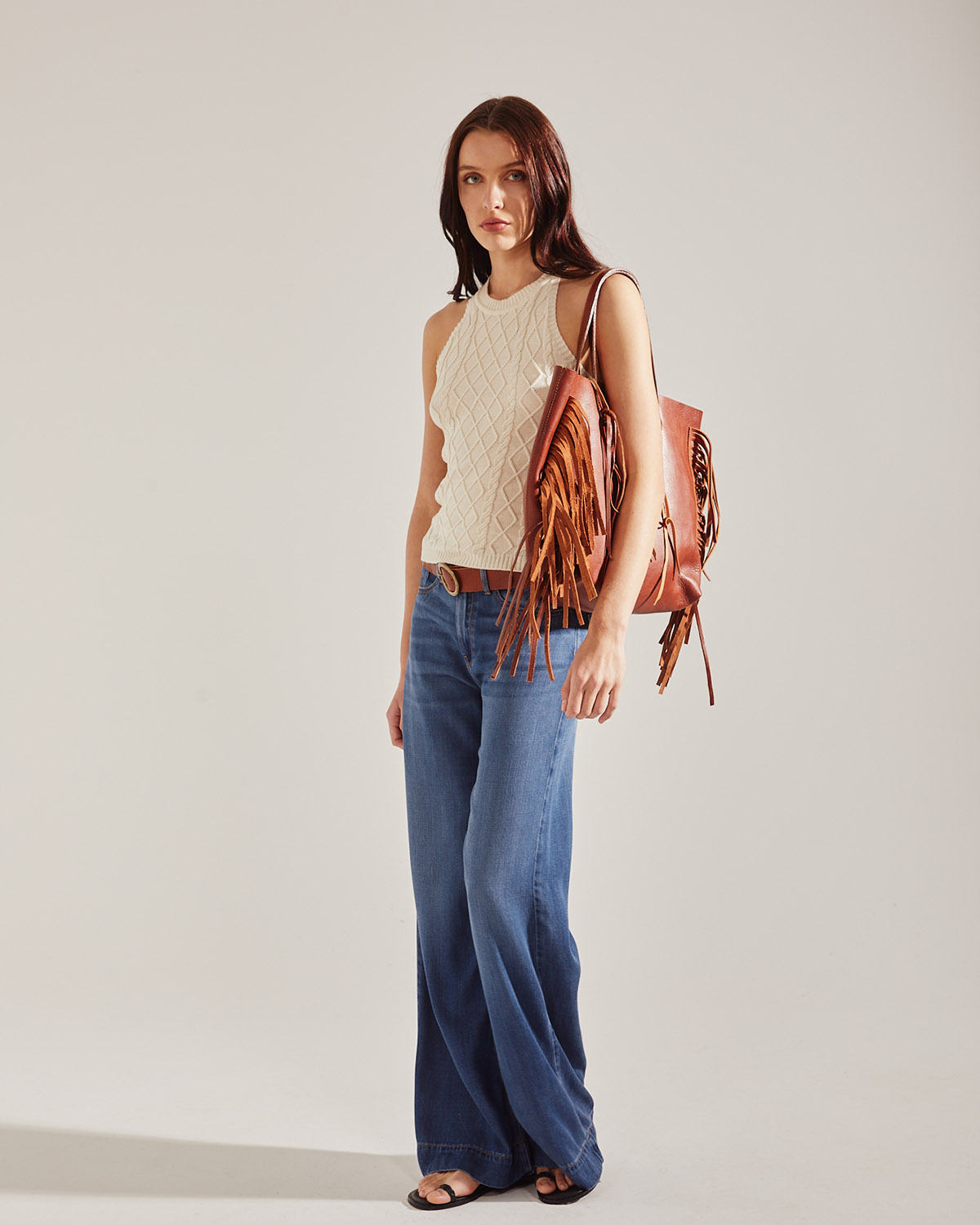 CON ARANES Y TRENZAS EN DELANTERO Y ESPALDA. DE ESCOTE CERRADO, LARGA A LA CINTURA.