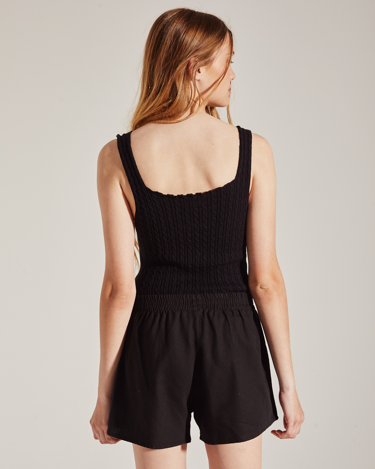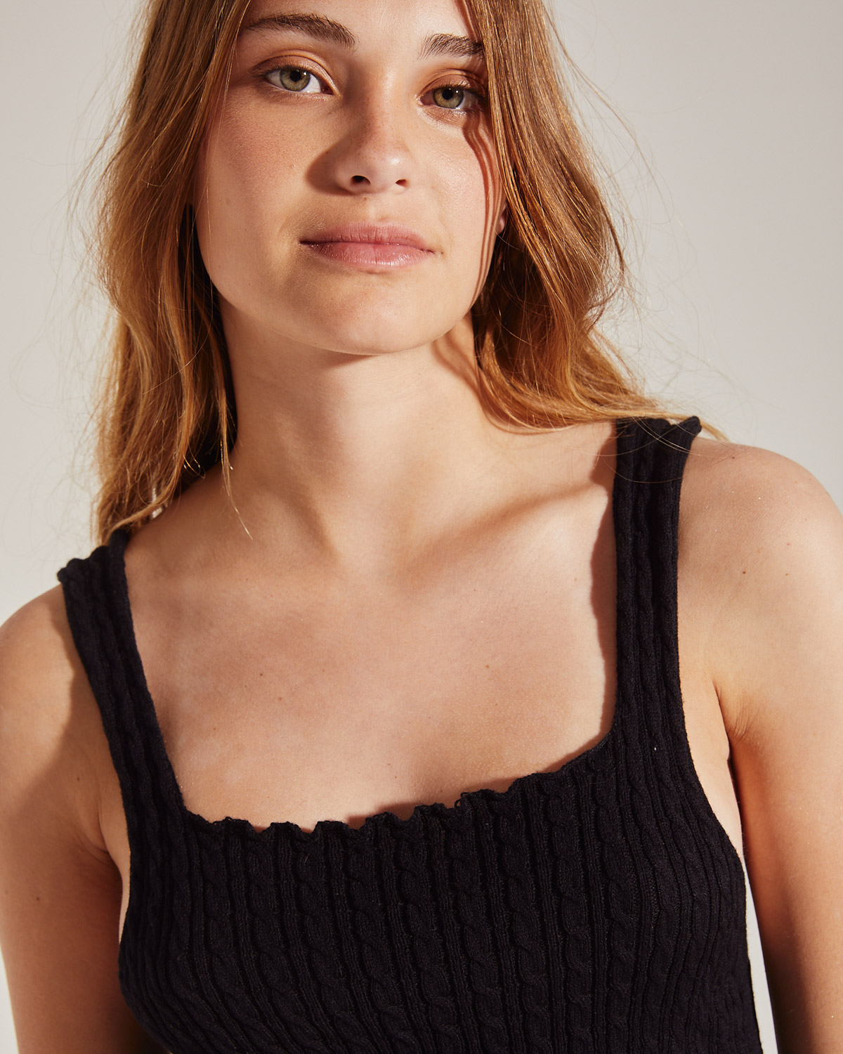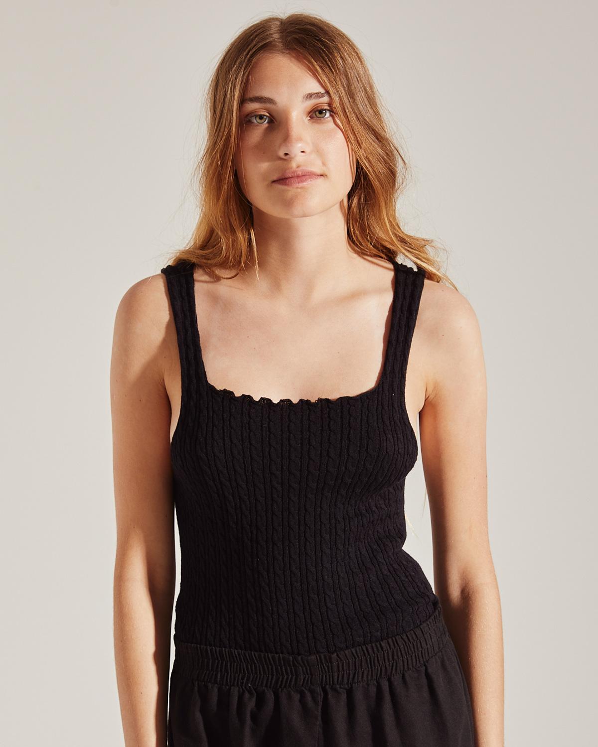 MUSCULOSA CON TEJIDO AJUSTADO , ESCOTE CUADRADO, BRETELES ANCHOS.