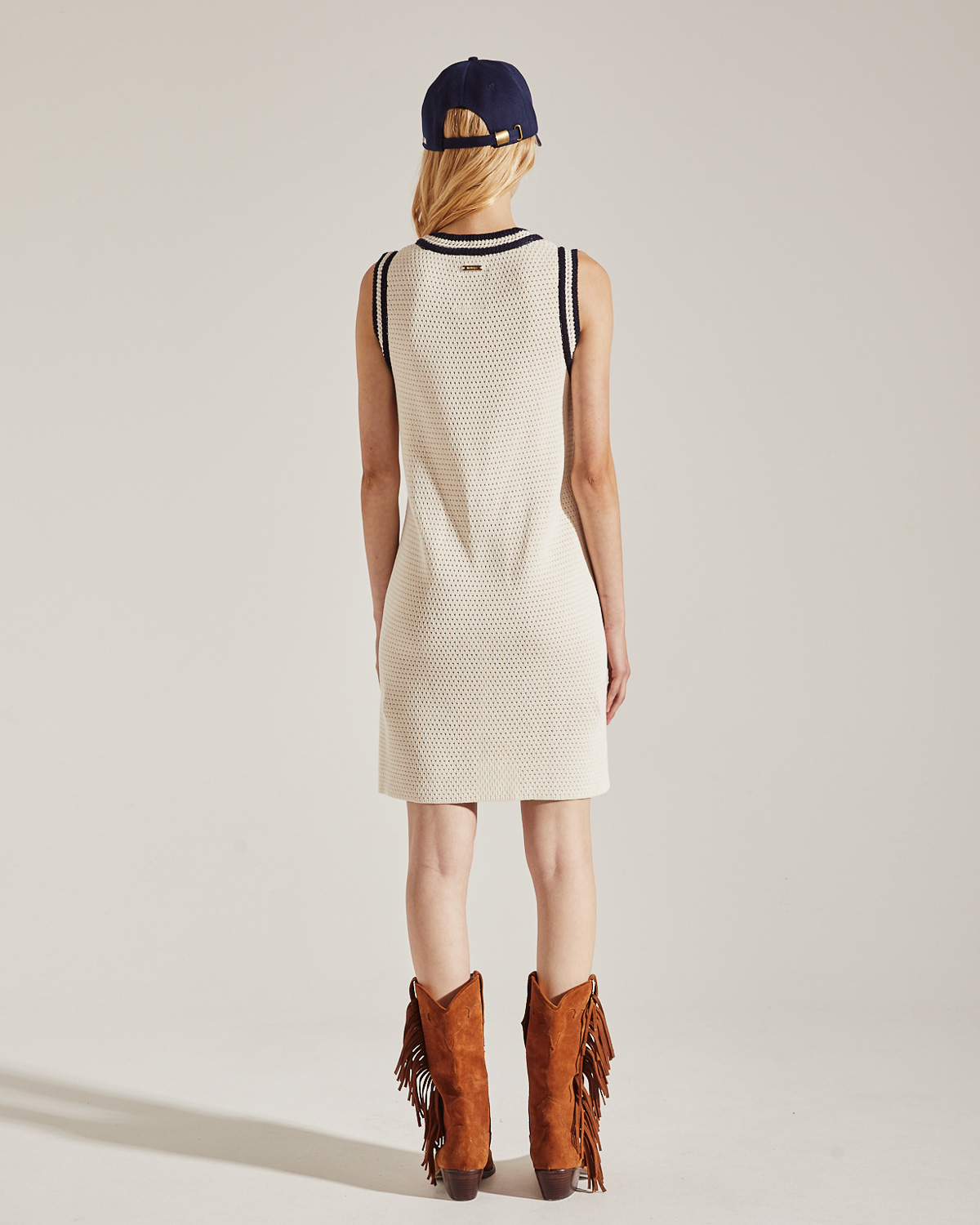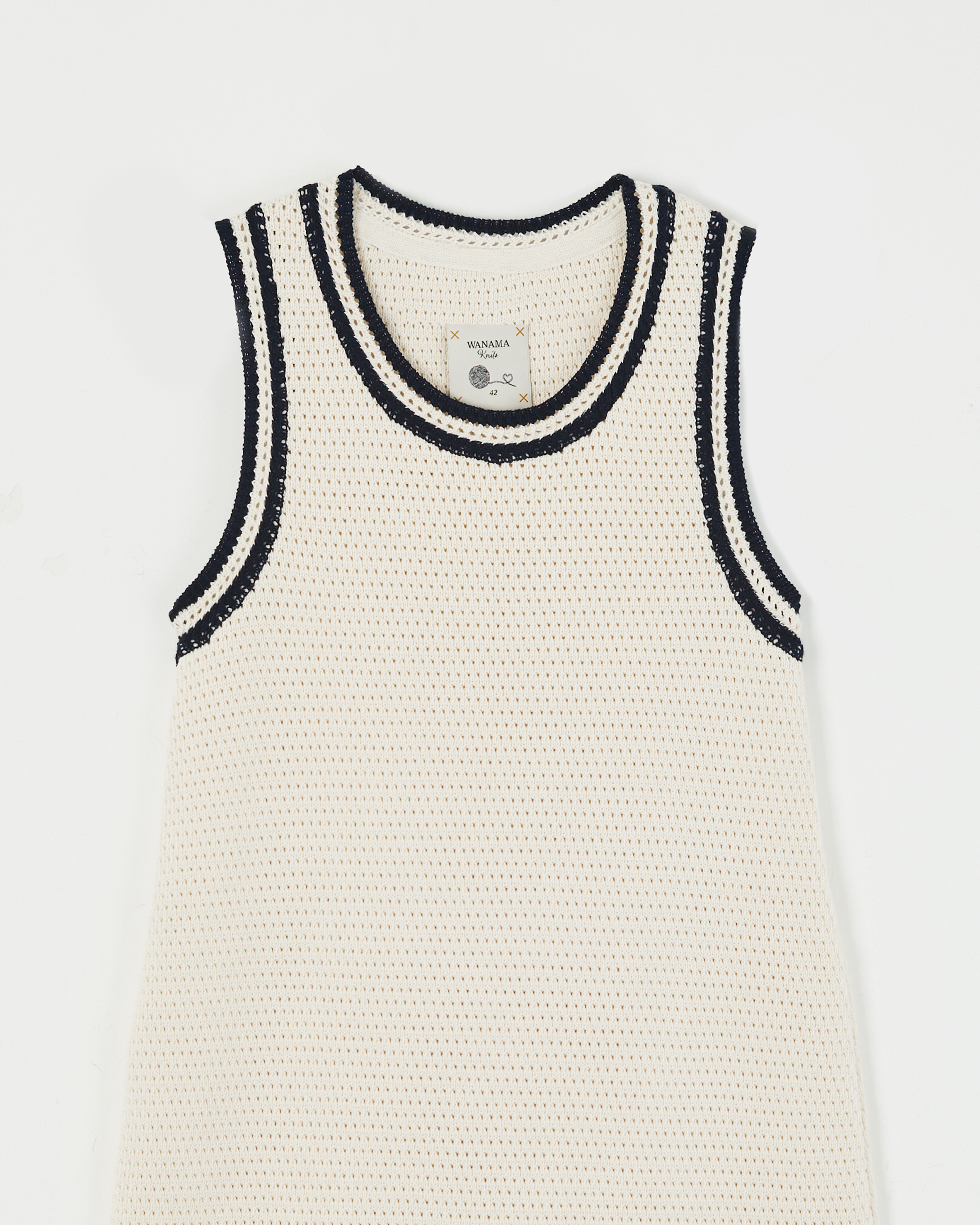 VESTIDO TEJIDO AJUSTADO , ESCOTE REDONDO CON PUNTO TIPO TEJIDO A MANO EN SISA Y ESCOTE