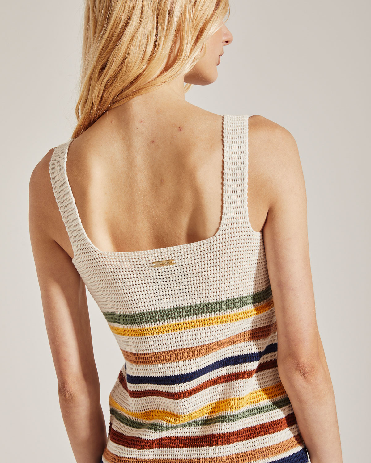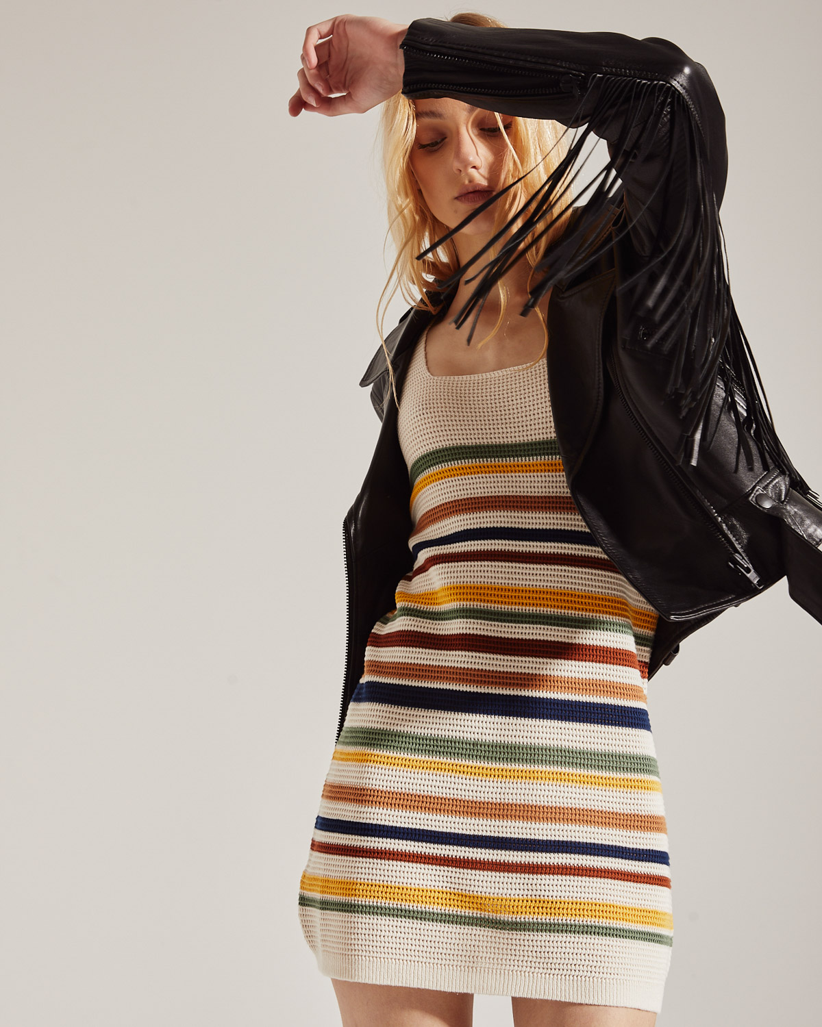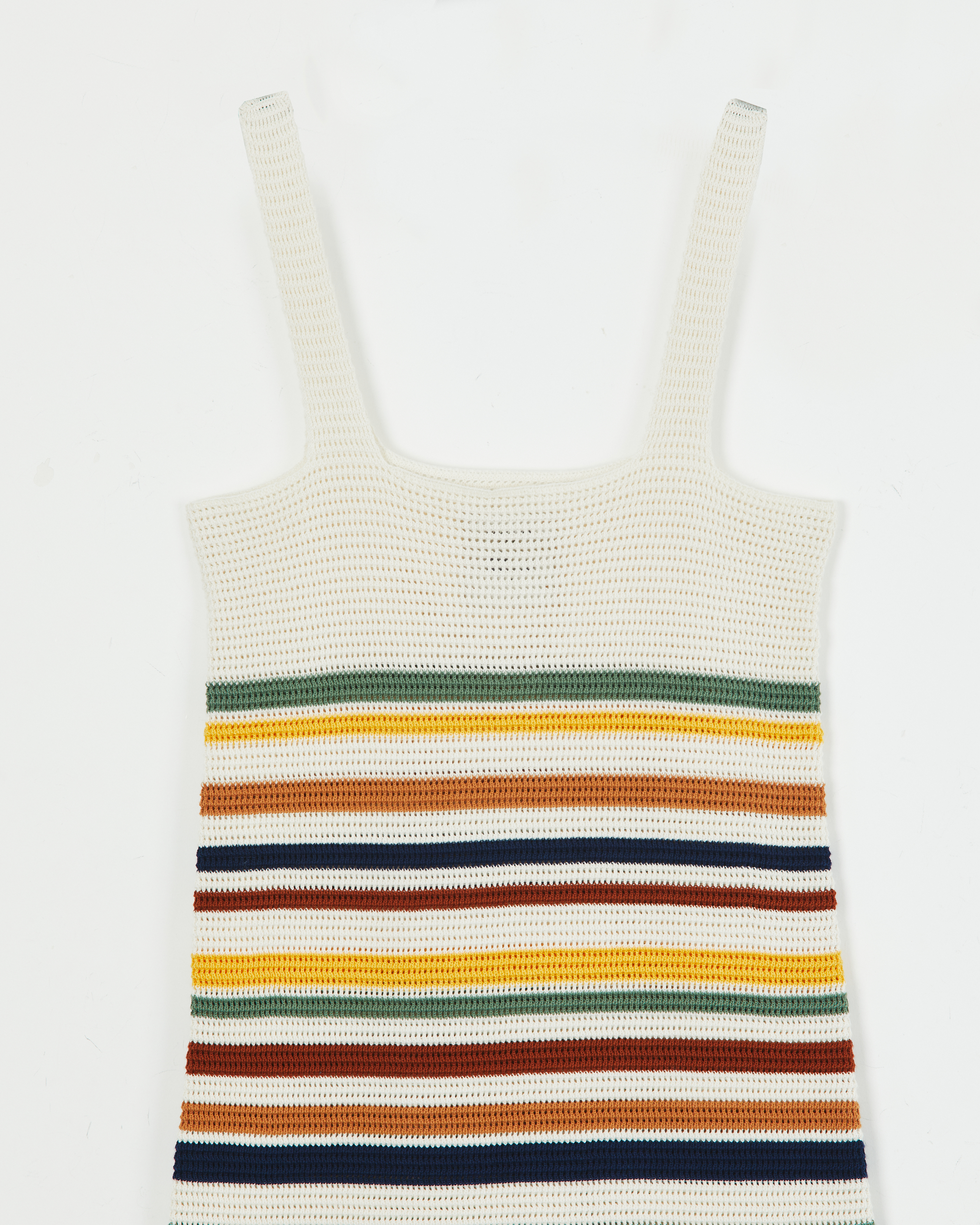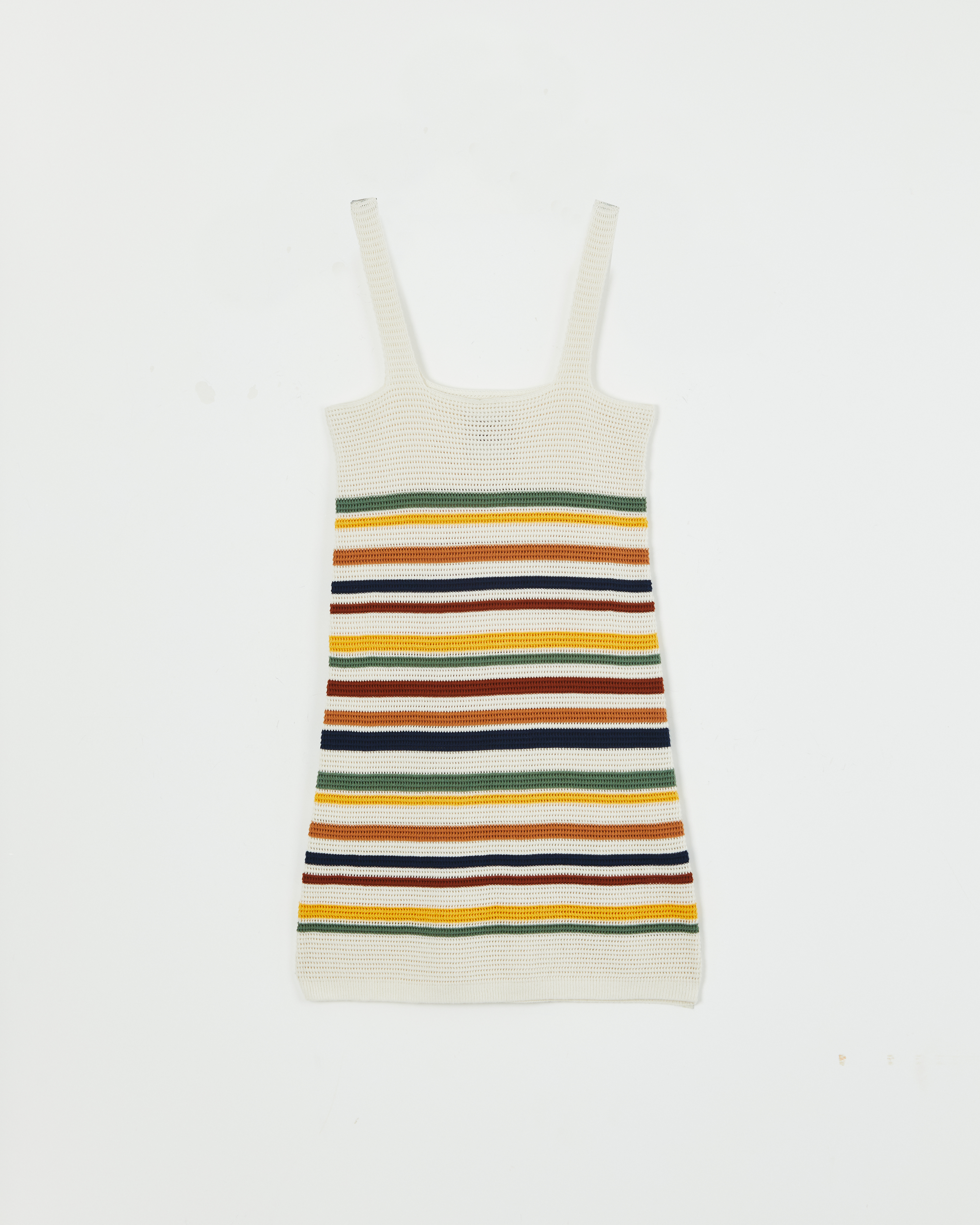 VESTIDO TEJIDO EN ALGODON, RAYADO POR ARRIBA DE LA RODILLA .