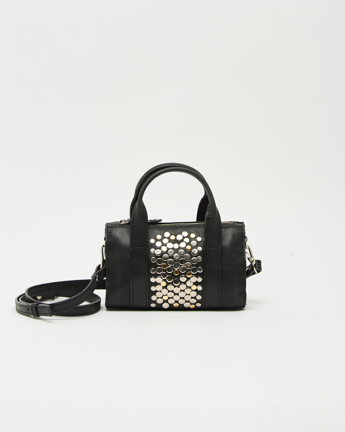MINI BAUL DE CUERO, CON TACHAS EN EL CENTRO DELANTERO .