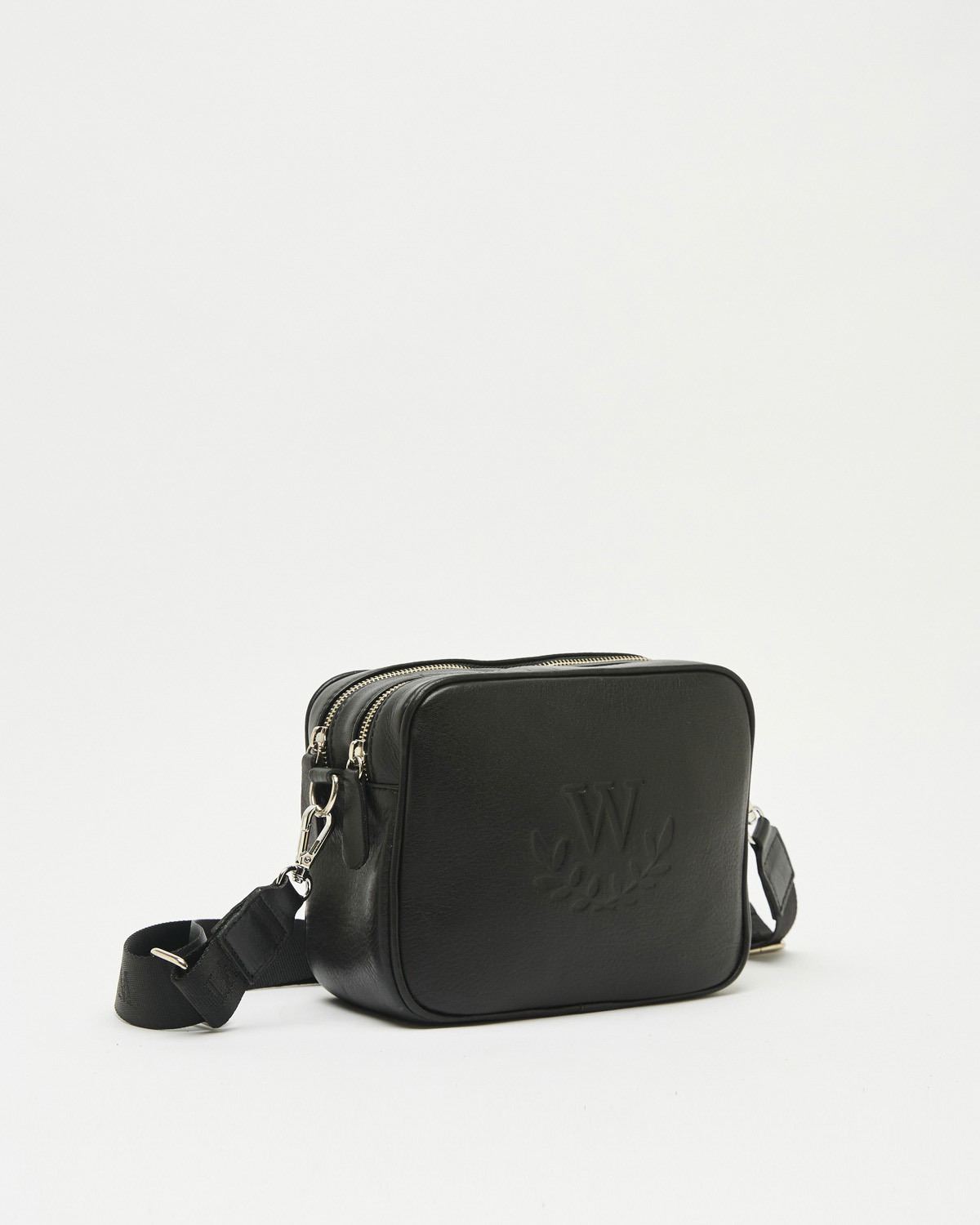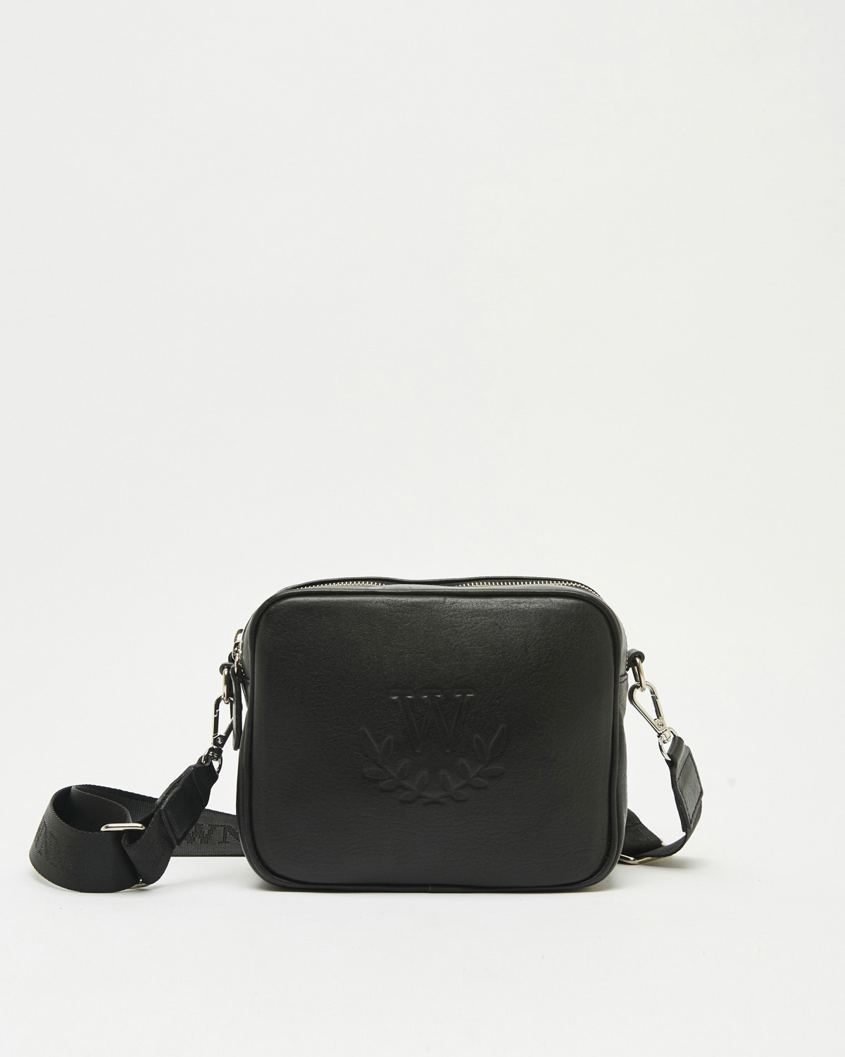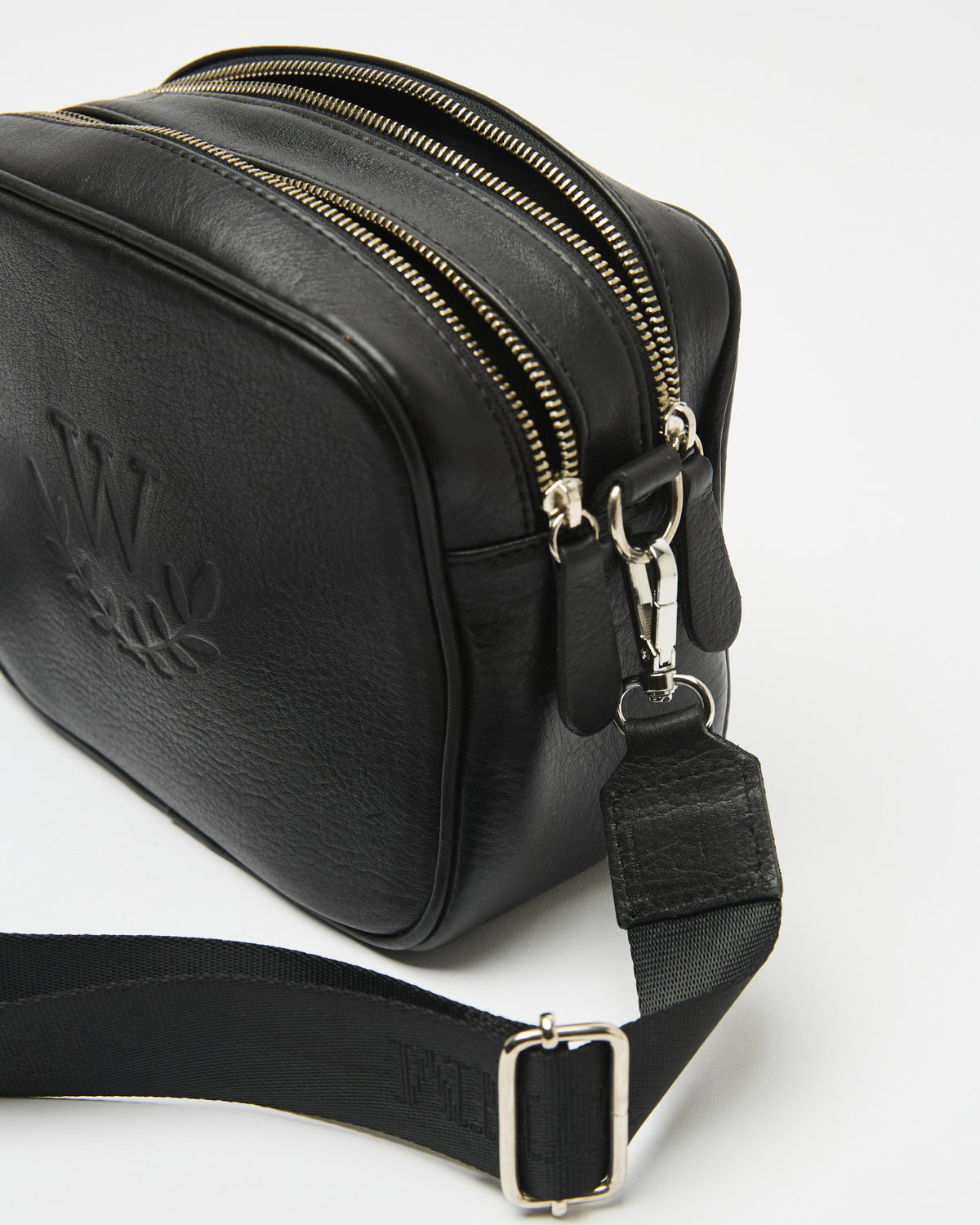 CARTERA BANDOLERA RECTANGULAR CON DOBLE CIERRE Y CINTA CON LOGO DE MARCA.