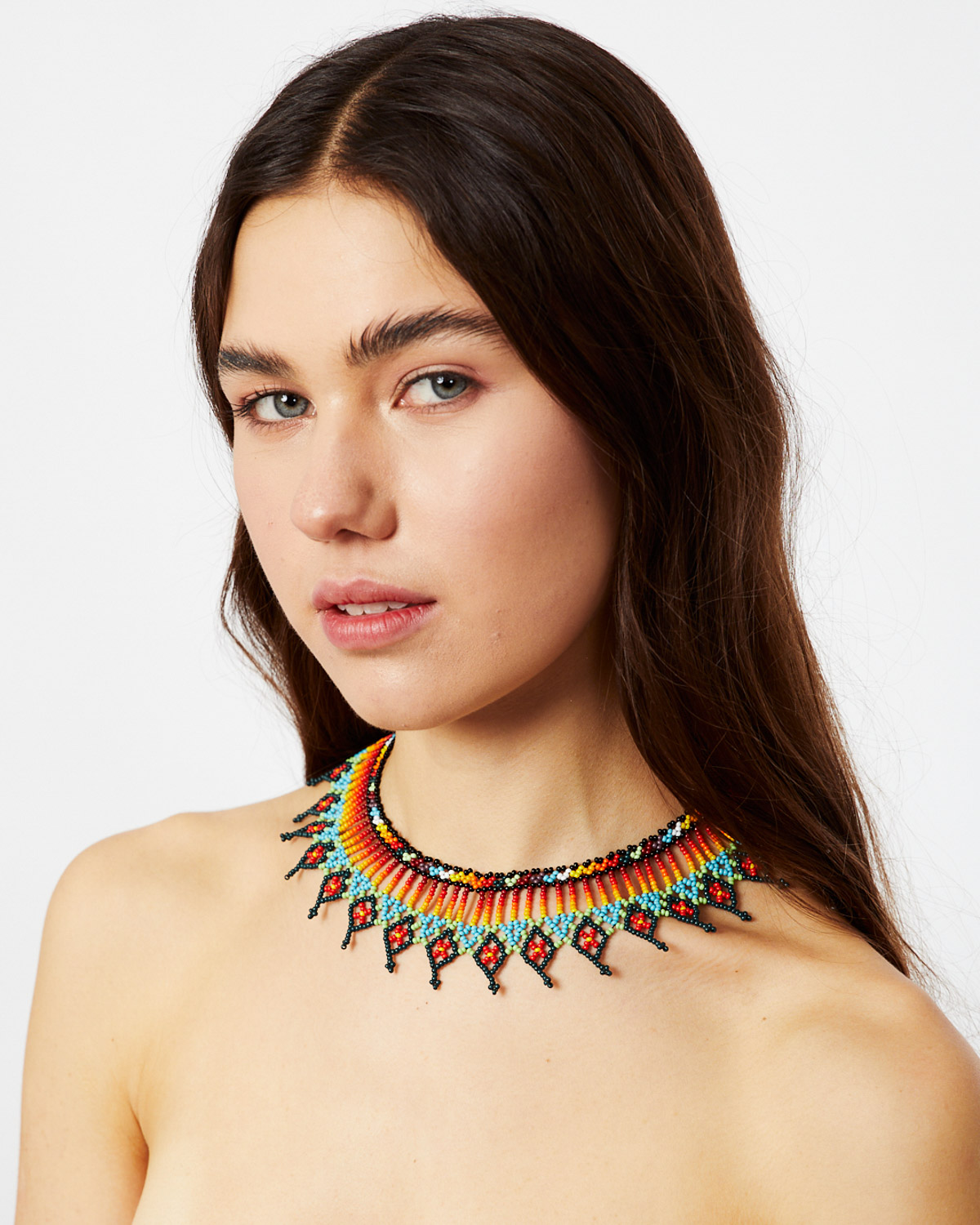 COLLAR TEJIDO DE MANERA ARTESANAL CONFECCIONADO CON MOSTACILLAS DE DISTINTOS COLORES.