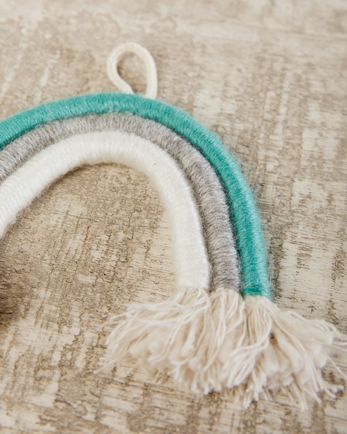 RAINBOW ROSA; Arco iris de hilo; Color: blanco, gris, rosa; Medida:8 cm de alto x 8.5cm de ancho; Origen: Argentina