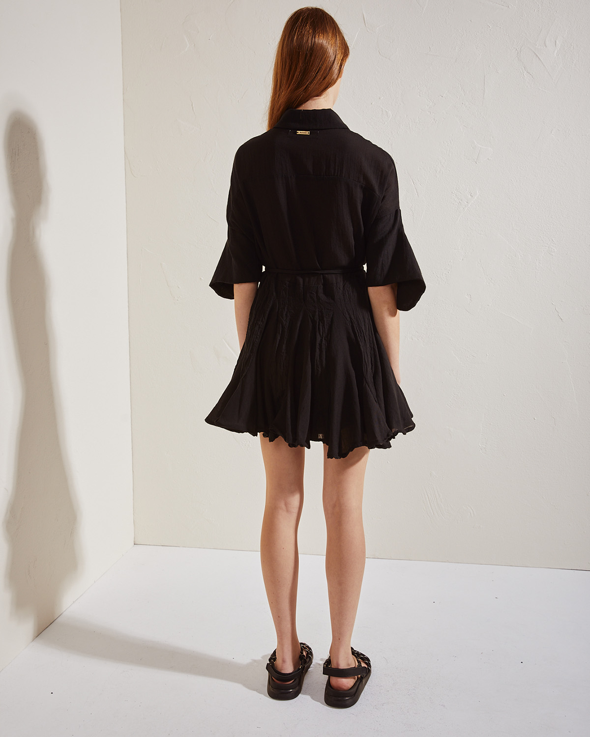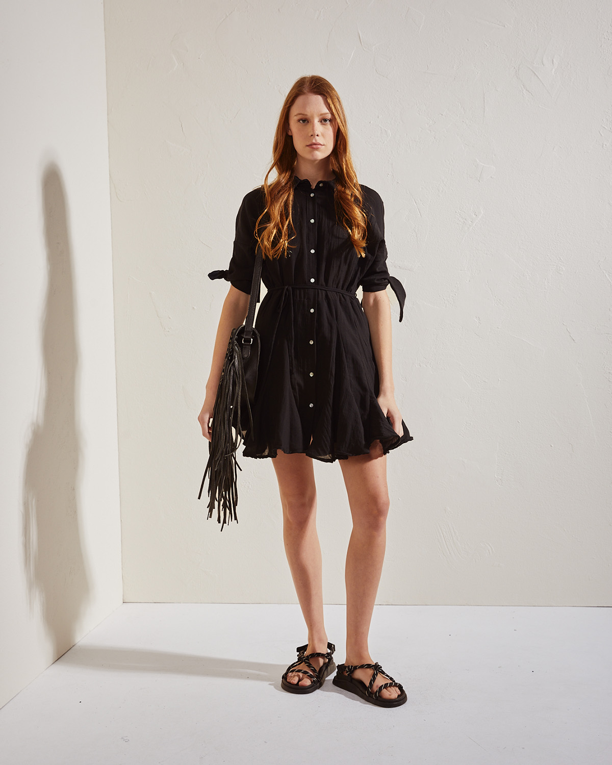 VESTIDO CAMISERO CONFECCIONADO EN VOILE DE RAYON, FALDA CON VOLADO.