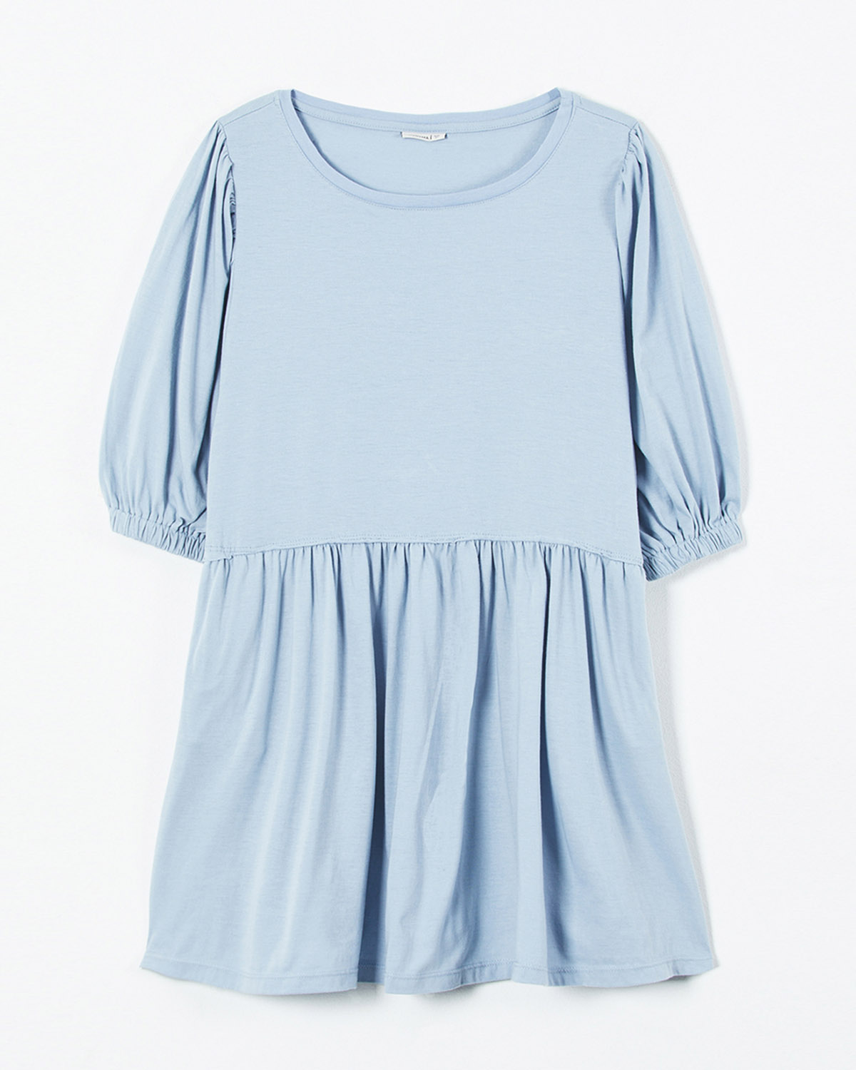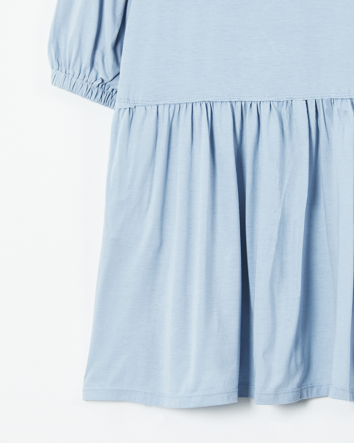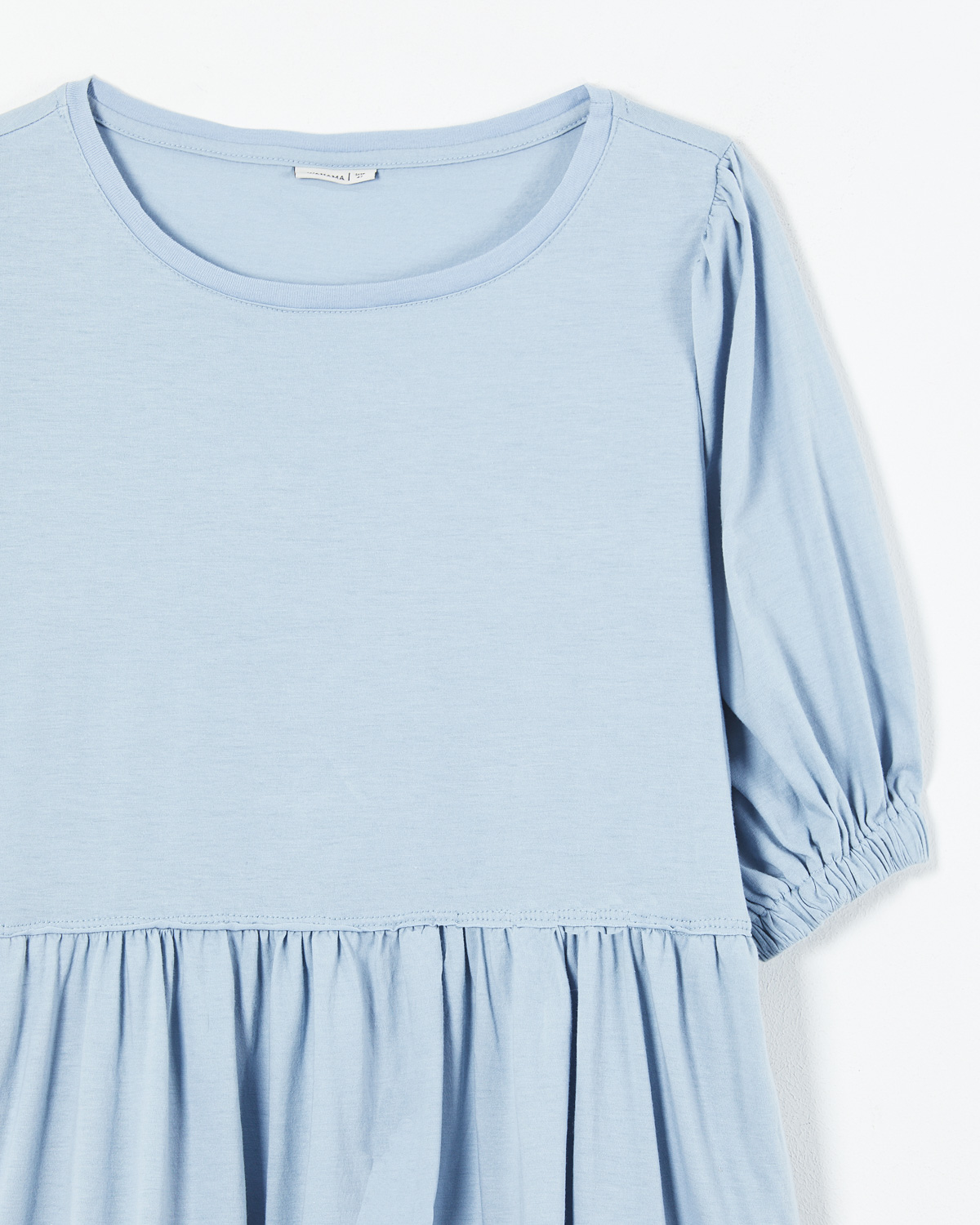 VESTIDO CONFECCIONADO EN JERSEY DE ALGODÓN. CALCE HOLGADO, CON FRUNCES REPARTIDOS EN FALDA. CON CUELLO REDONDO, MANGAS 3/4BALLON Y BOLSILLOS LATERALES.